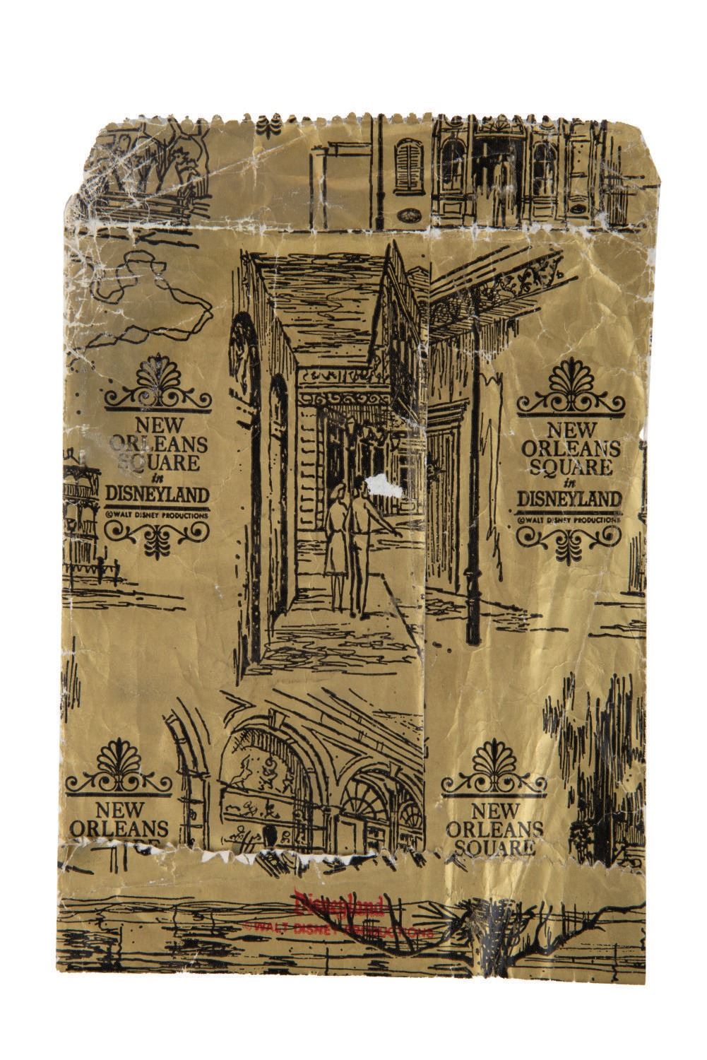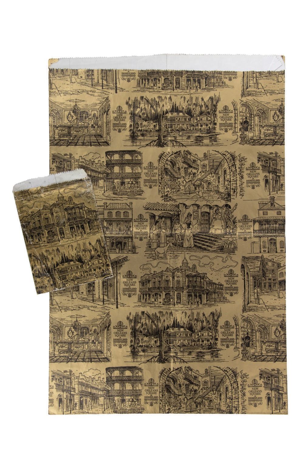 (Disneyland, 1960s-70s) A pair of vintage souvenir bags from New Orleans Square at Disneyland. The gold-toned paper bags feature a motif capturing the romantic stages, areas, and shops of New Orleans Square. Measuring 5.5"x8.5" and 16.5"x25", the bags are in good condition, with creases throughout, wear, and folds.