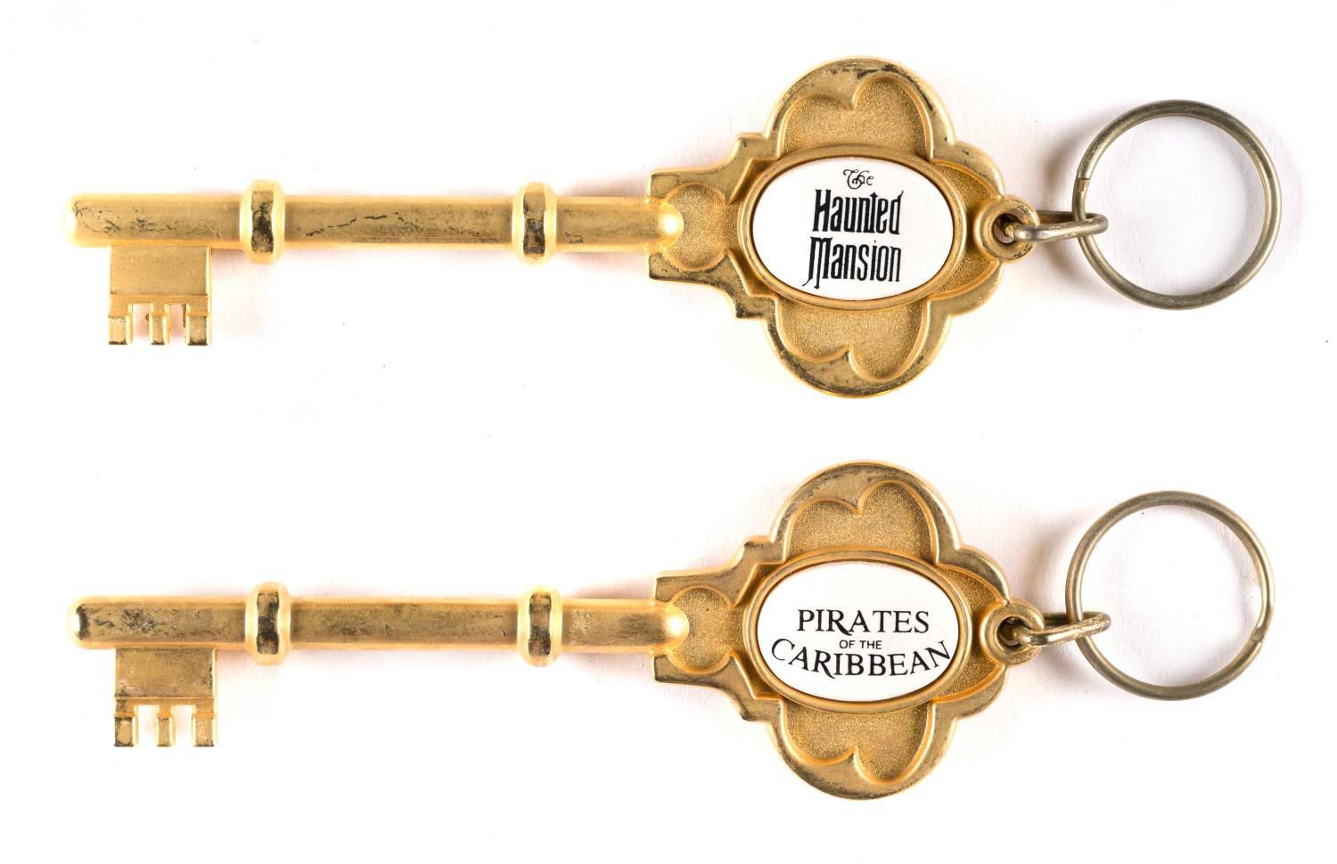 (Disneyland/WDW) A pair of souvenir keyrings featuring logos of the Haunted Mansion and Pirates of the Caribbean. Both pieces are in fine unused condition.
