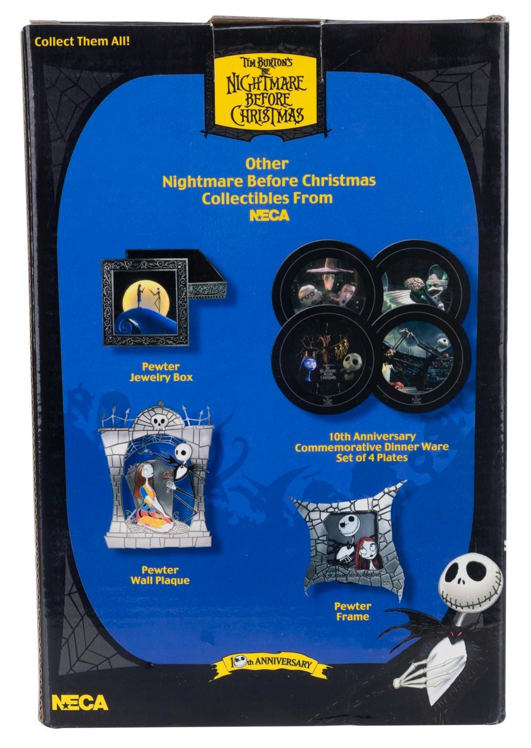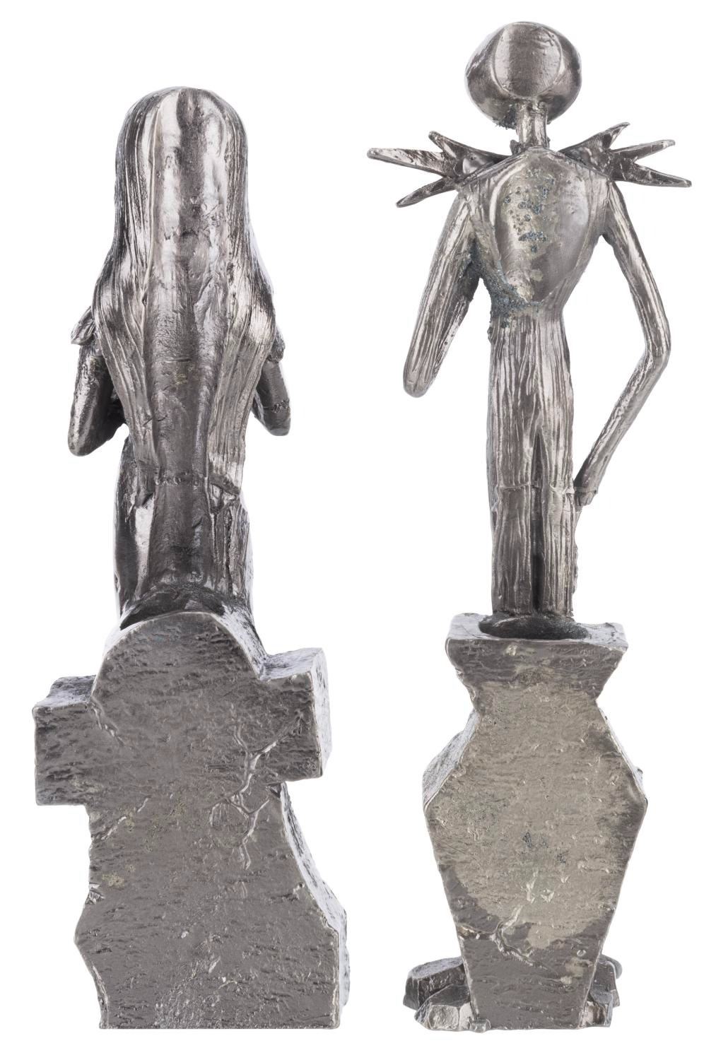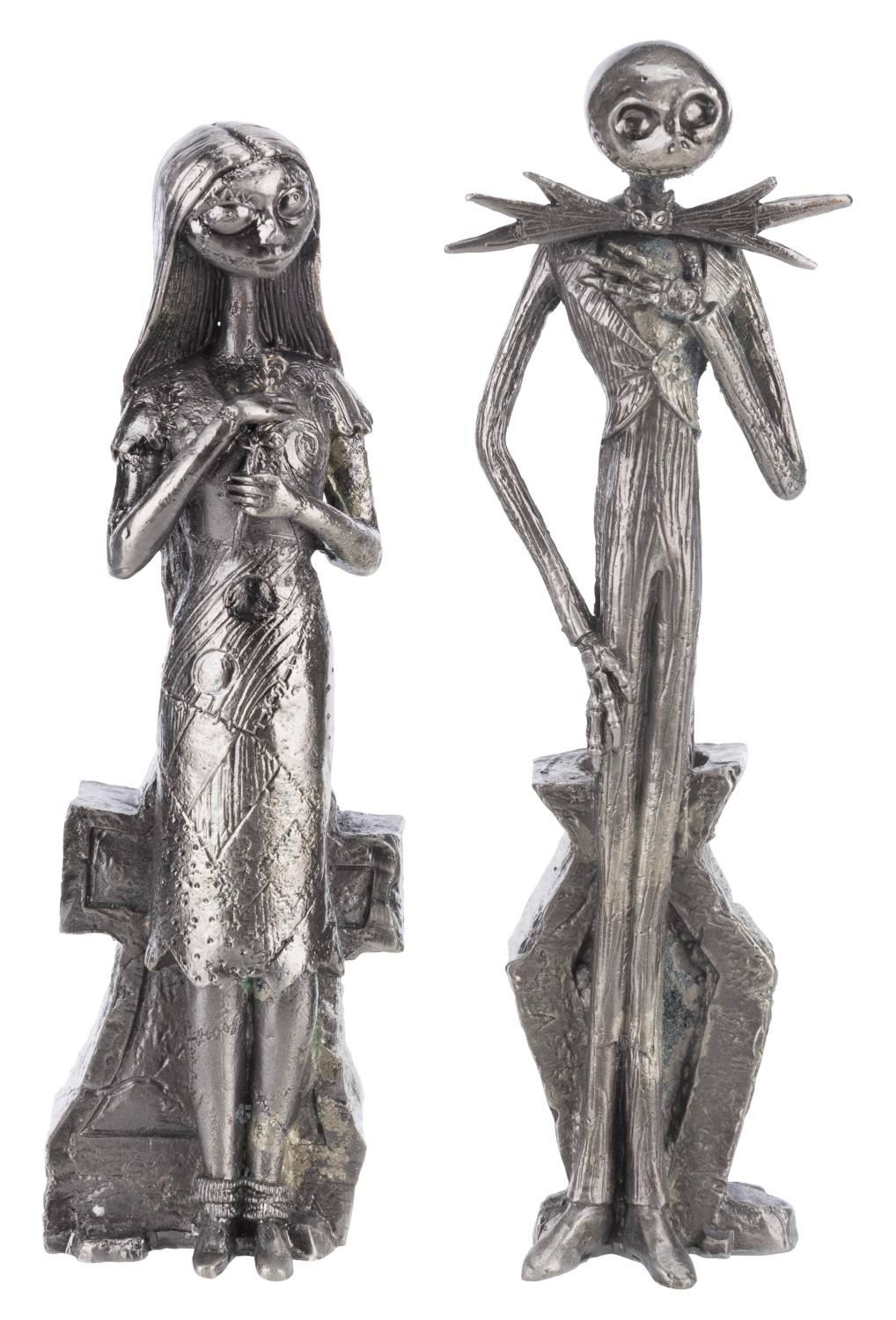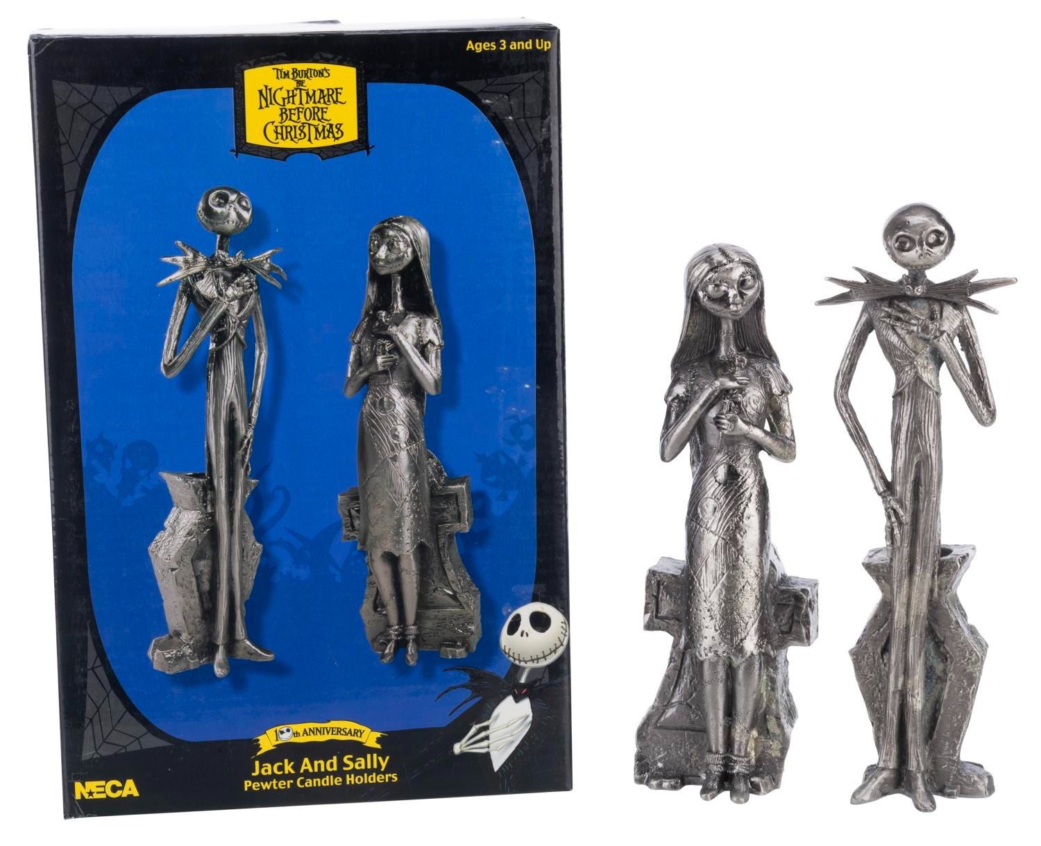 (NECA, 2003) A pair of pewter candle holders of Jack Skellington and Sally from"The Nightmare Before Christmas." Each standing 7.25" tall, the holders are in fine condition with the original box.