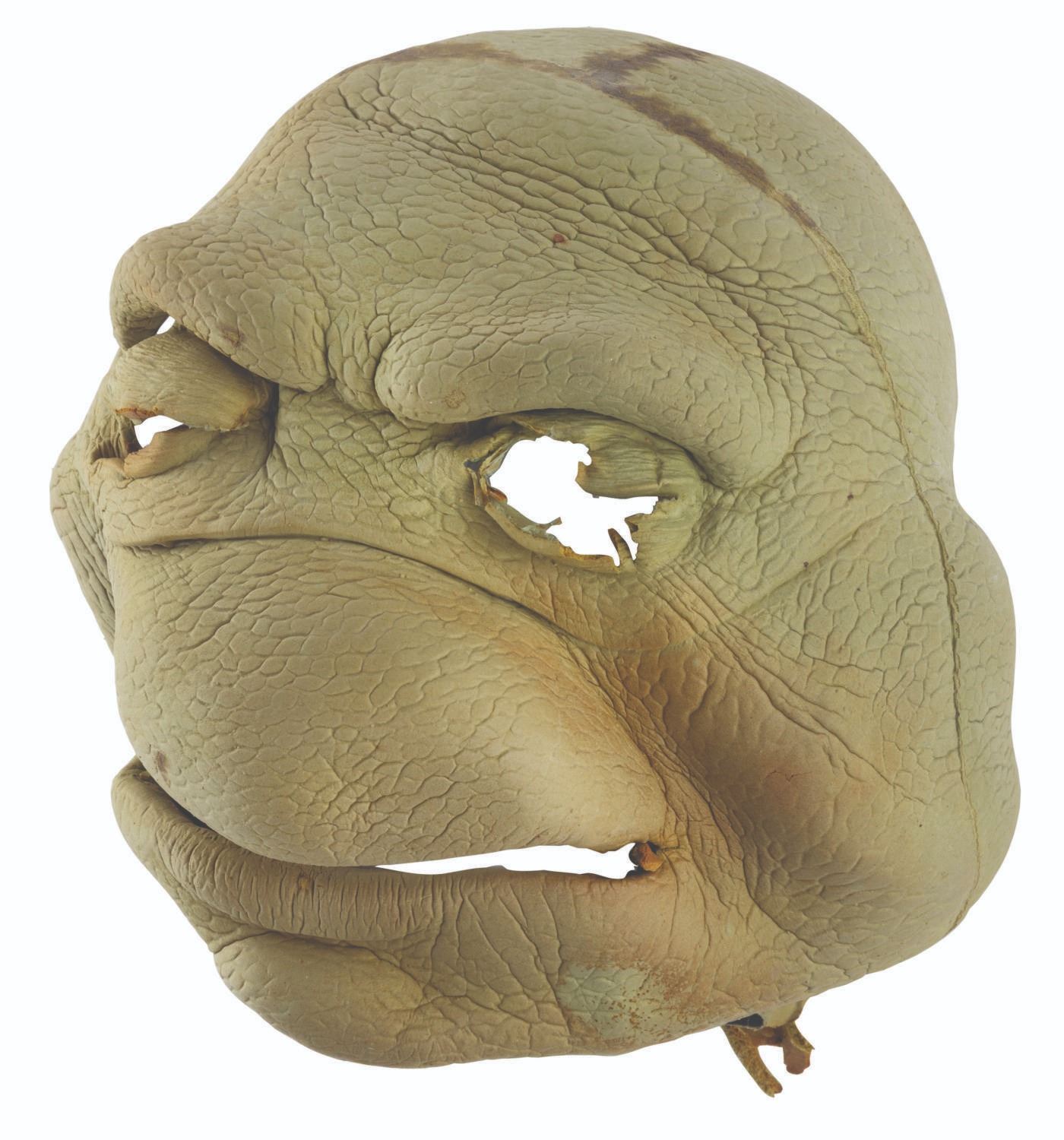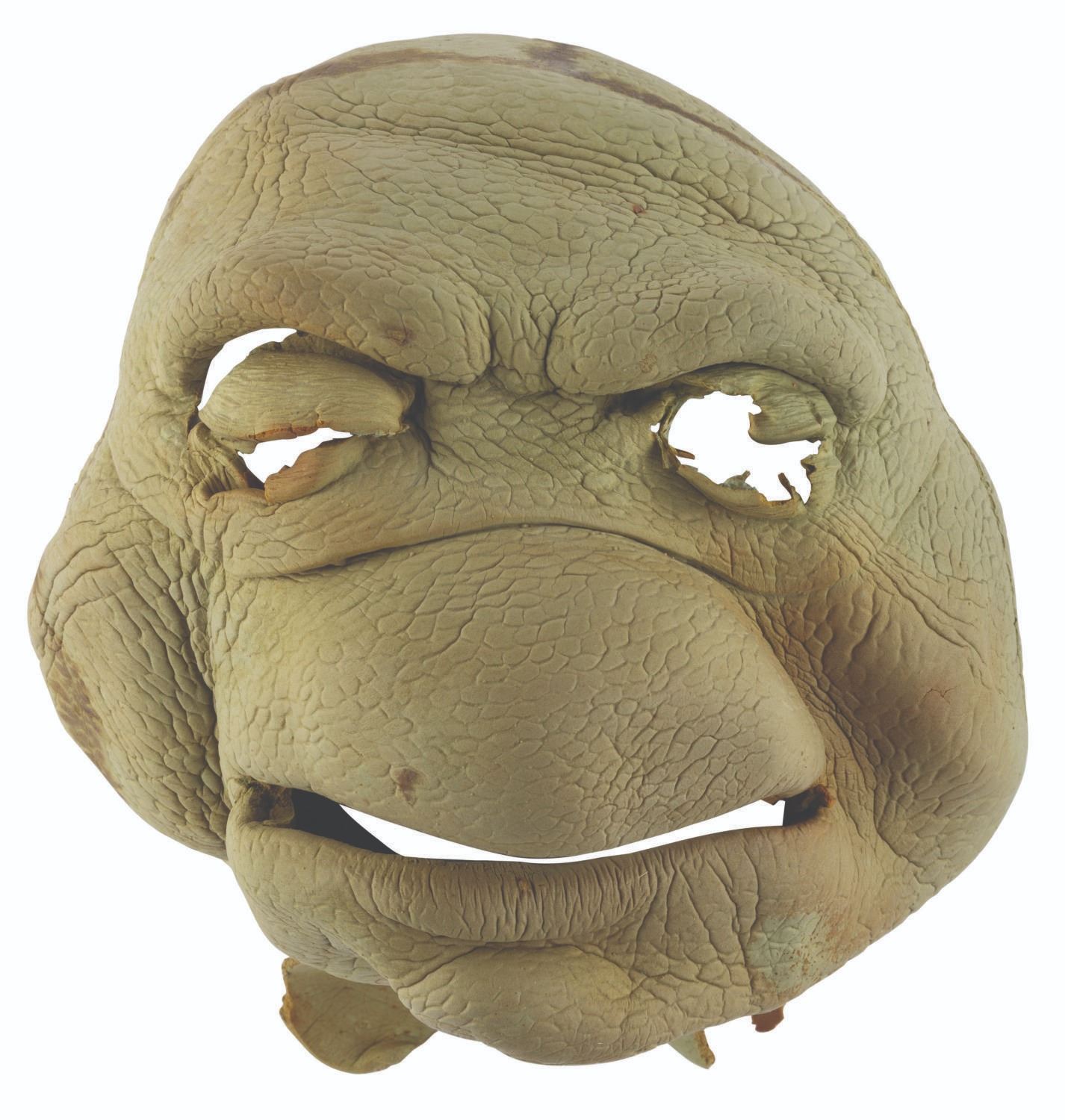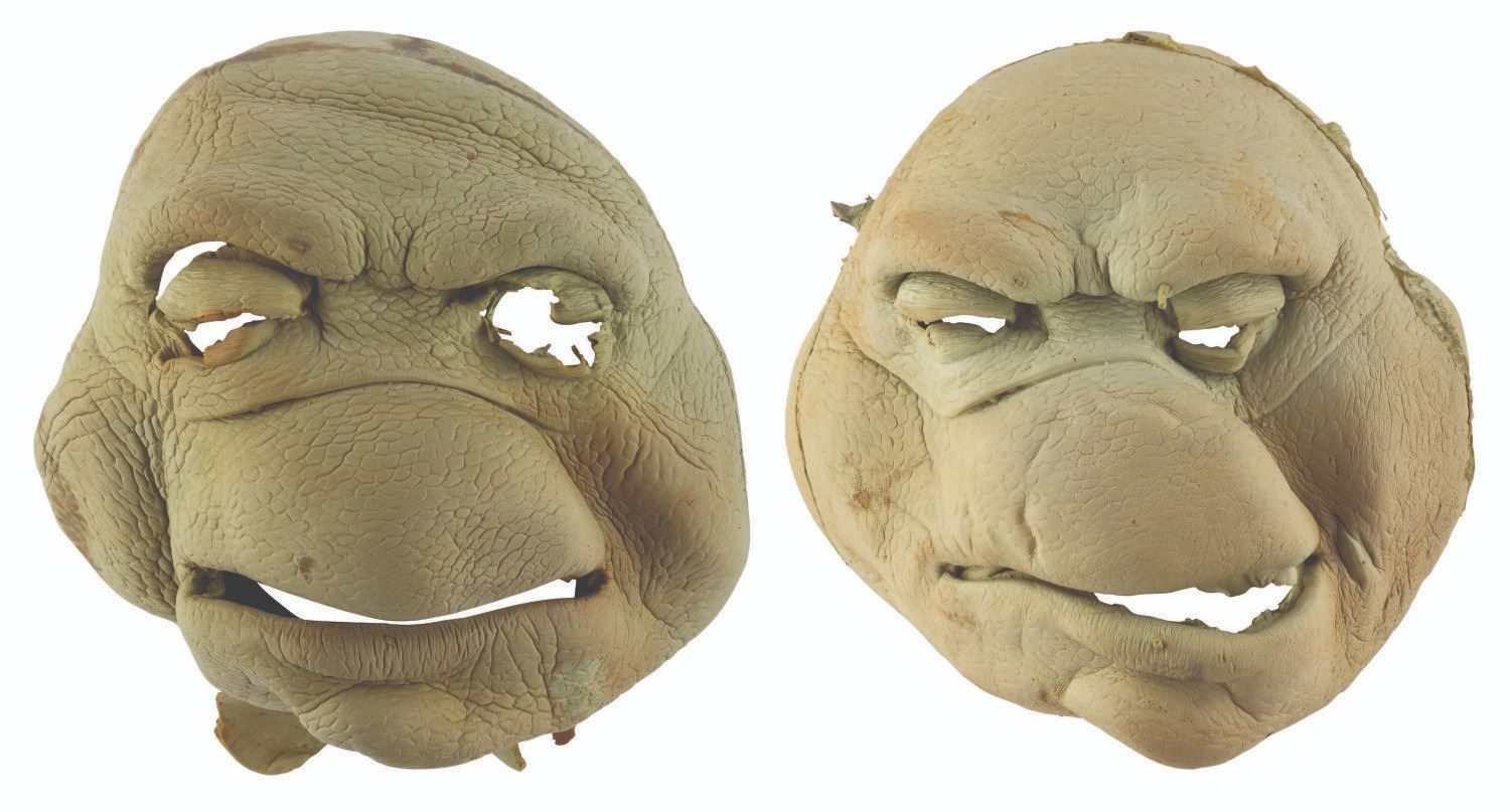 (Fox, 1997-98) A pair of foam puppet head skins from the"Ninja Turtles: The Next Mutation." Produced by Saban Entertainment,"The Next Mutation" was the first and only live-action television series in the Ninja Turtles franchise. Measuring 8" x 11" x 8" tall each, the heads are in good condition with discoloration from age, tears, light material loss, soiling, and wear from production use.
