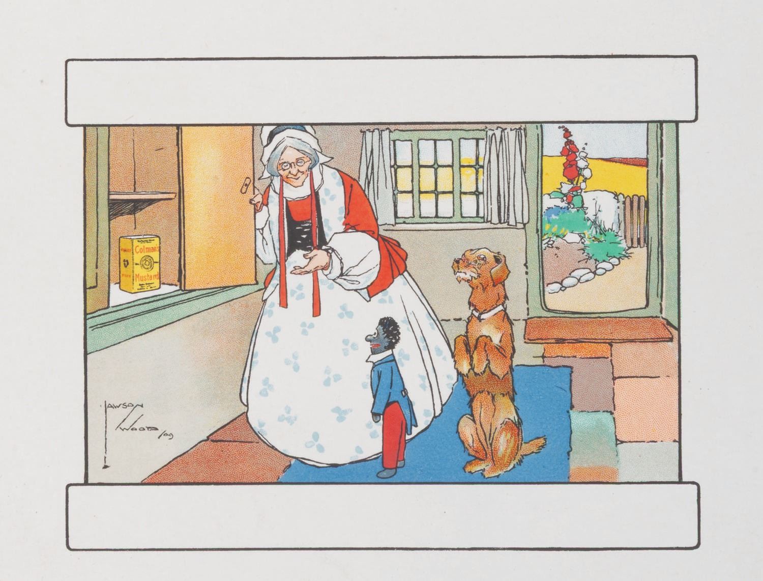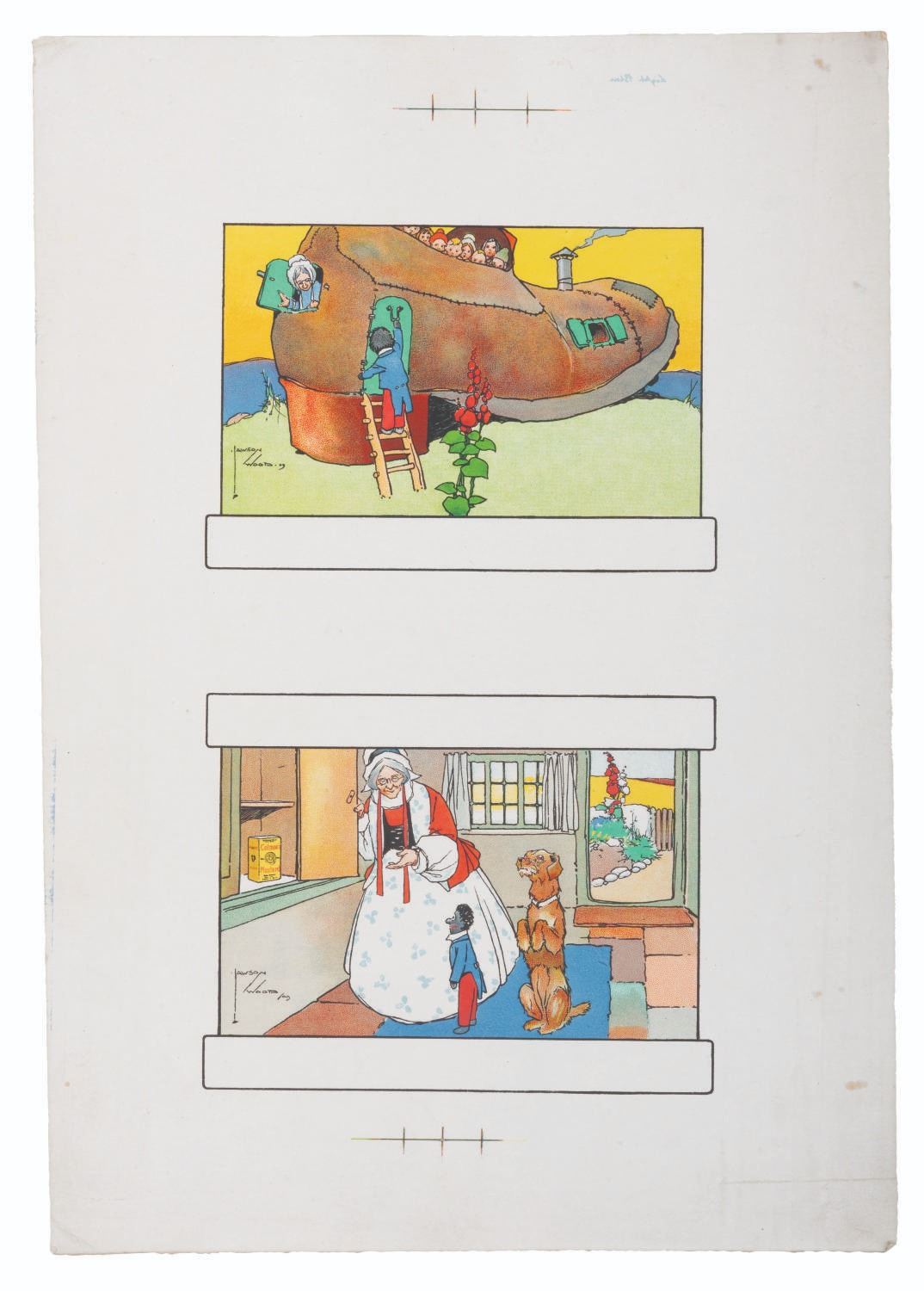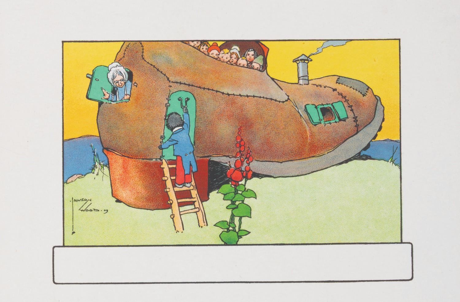 (Wood, 1909) A page with two illustrations of nursery rhymes by the renowned English illustrator Lawson Wood. The page shows The Old Woman Who Lived in a Shoe and Old Mother Hubbard. With image sizes of 2.75" x 4.5" on 8" x 11.25" paper, the illustrations are in very good condition with light edge and handling wear that does not affect the images.