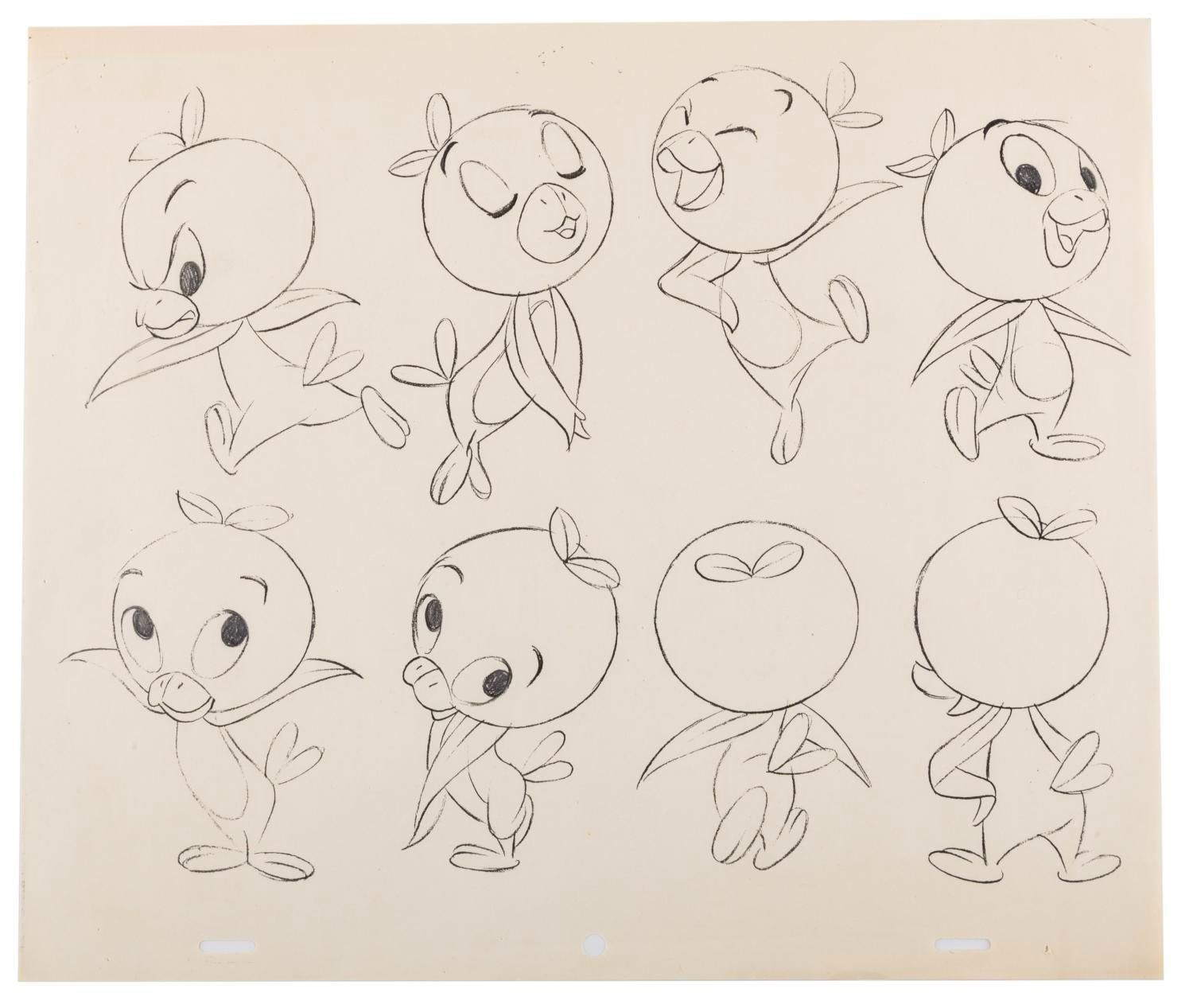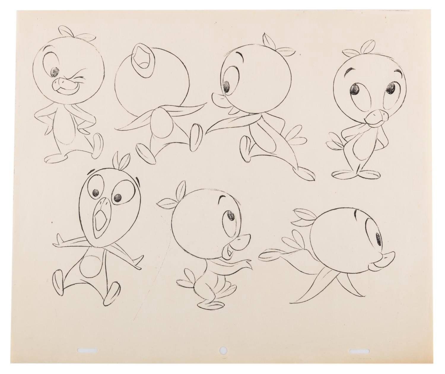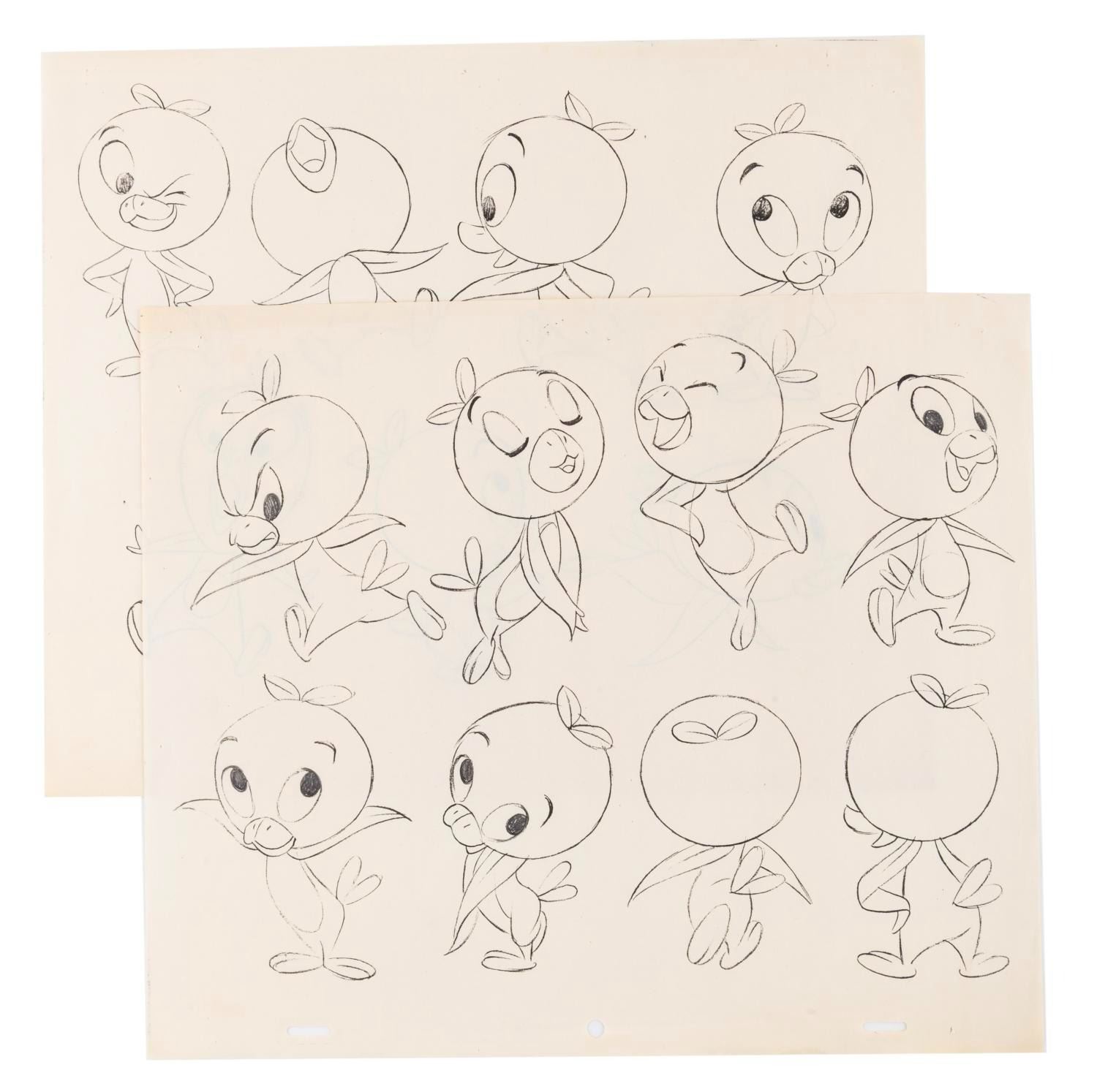 (Disney, 1970s) An extremely rare pair of Studio model sheets used during the production of numerous Florida Citrus Commission commercials in the 1970s. The Orange Bird was created by the Disney Studio as part of their agreement with the FCC for sponsorship of Walt Disney World, and the Orange Bird debuted in 1971 at the Sunshine Tree Terrace in the Magic Kingdom. The character was extremely popular and used by the Citrus Commission for numerous commercials throughout the 70s and into the 80s. These two model sheets feature various xeroxed images on 10.5" x 12.5" pegged animation paper. They are both in very good condition with light wear from age and use.