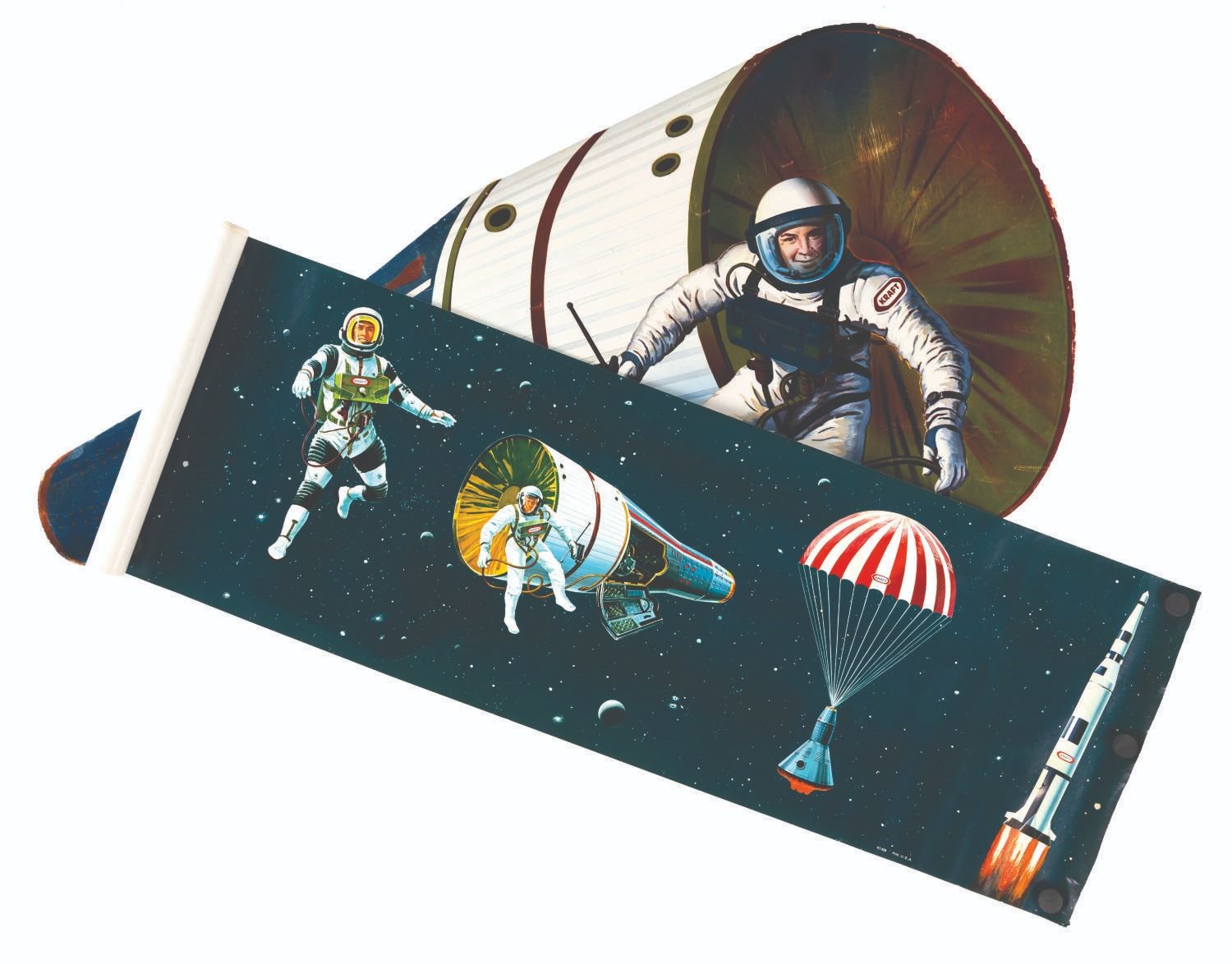 (Kraft Foods, 1960s) A Pair of Original Kraft Foods & Gemini Store Displays. The Gemini Project was NASA's second manned spacecraft and carried two-man crews from 1965 to 1966. During the 1960s, Kraft Foods launched their own synergistic promotion of the NASA program with store displays near their products. The panoramic poster depicts the Apollo Saturn 5 Launch Vehicle, Adapter, Reentry module with astronauts, and the Kraft logo. The embossed metallic paper foil store display depicts the spacecraft with an astronaut bearing the Kraft logo, and was created by the Wonderflex Company of Chicago. Measuring 44.25"x23", the reflective wall-mountable display is in good condition, exhibiting surface wear, scuffs, a few pinholes, creases and a torn and missing left foot. Measuring an incredible 123"x15" the panoramic poster is in good condition, with vibrant colors, creases, a few punctures, yellowing to reverse, wear throughout from age, and an "S" shaped roll on one end due to storage.