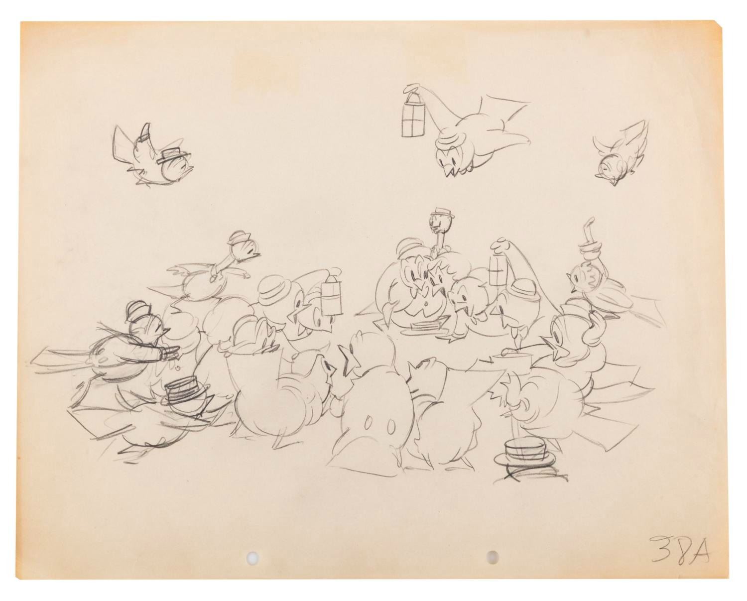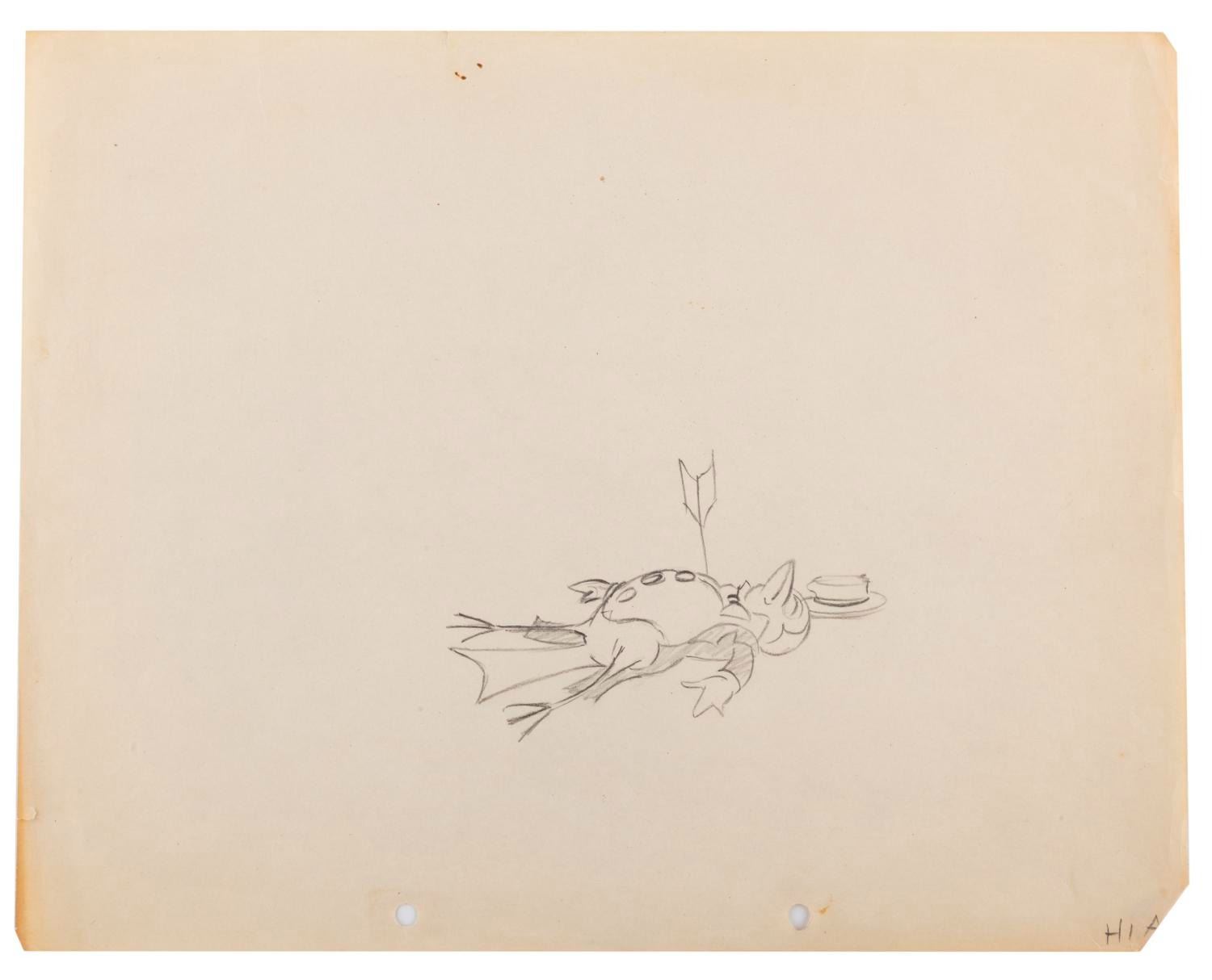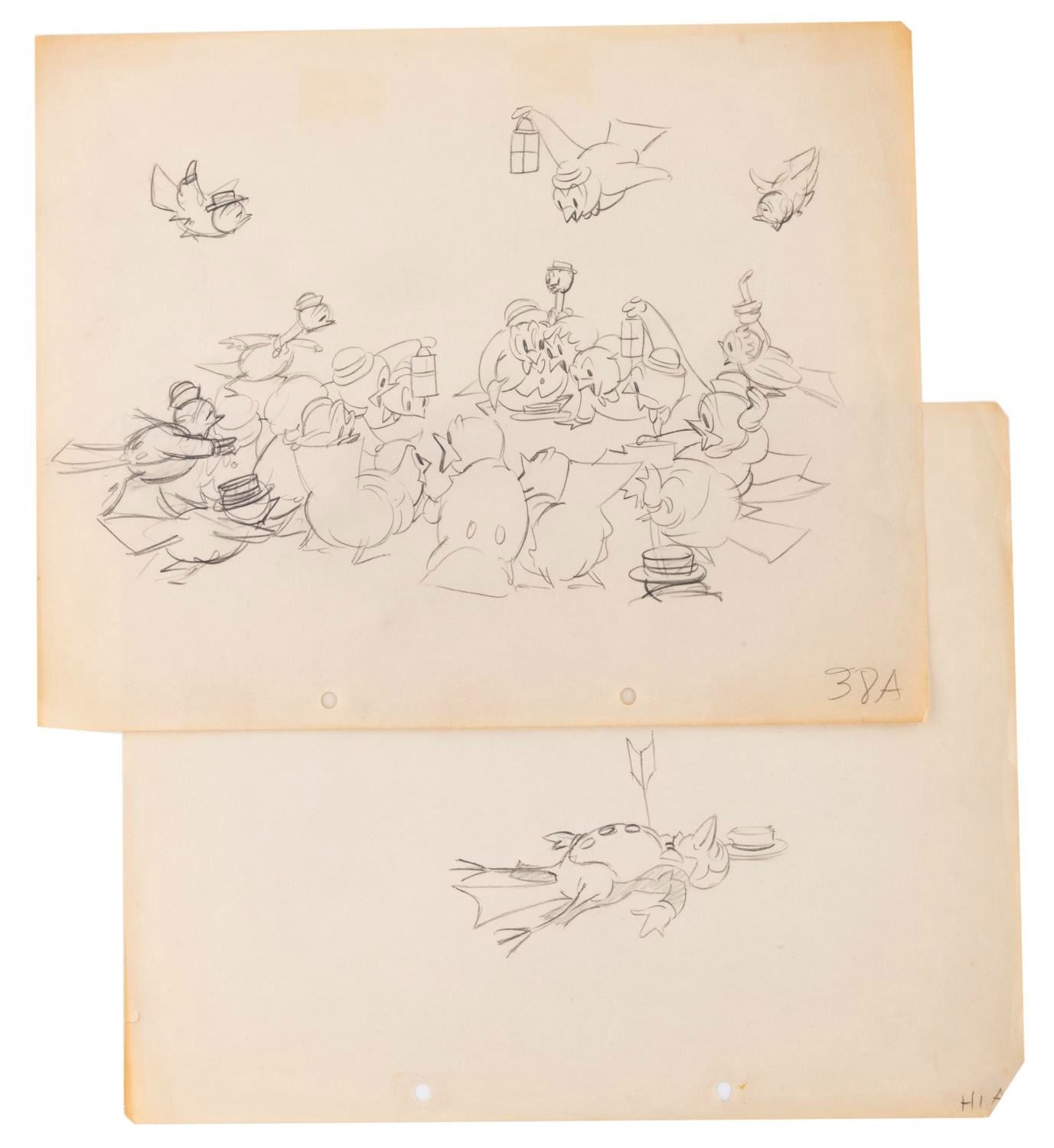 (Disney, 1935) A pair of original production drawings from the 1935 Disney Silly Symphony, "Who Killed Cock Robin." The drawings are on untrimmed 10"x12" animation paper. The drawing of Cock Robin has an image size of 4.5" x 3", and the drawing of the crowd has an image size of 10" x 6.5". Both drawings are in very good condition with expected wear from age and slight browning along the edges.