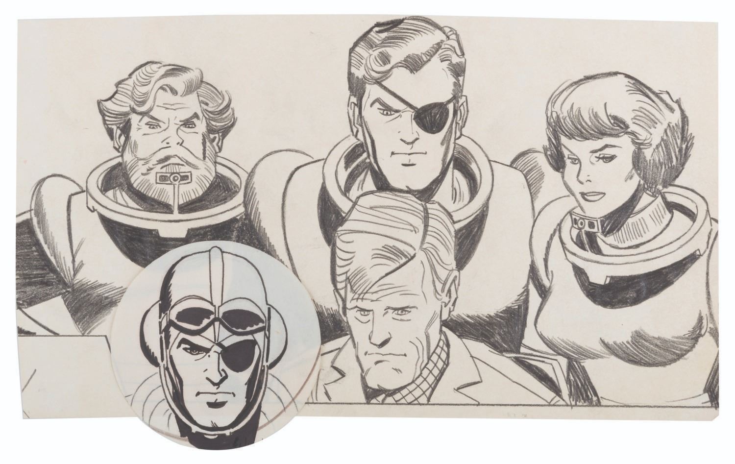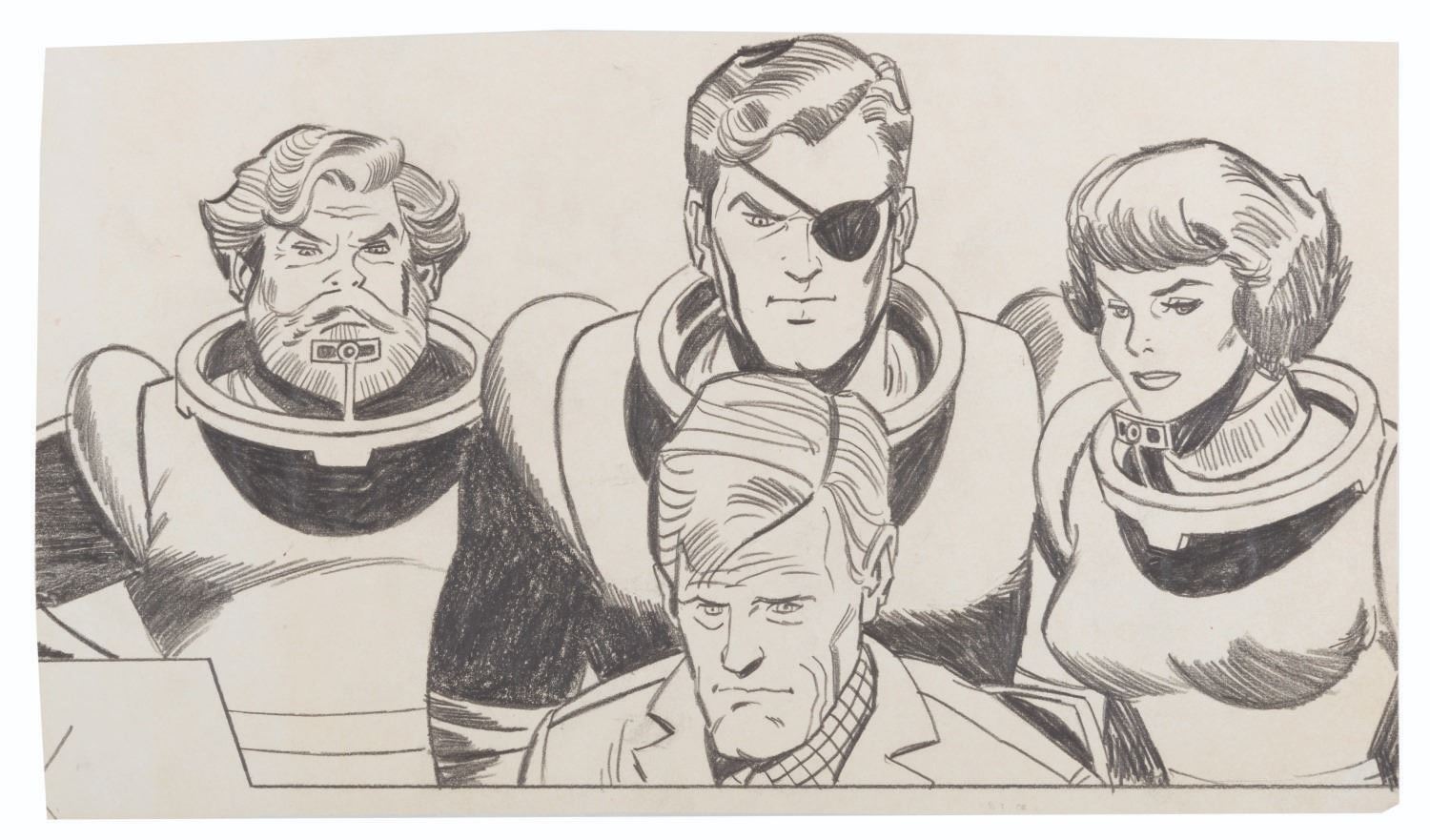 (Cambria Productions, 1960s) A pair of original production drawings from Dick Darley’s Synchro-Vox cartoon “Space Angel.” One drawing is trimmed to a circle and features Scott McCloud aka The Space Angel, while the other features McCloud, Crystal Mace, Taurus, and Professor Mace. Measuring 3.25” in diameter and 6.25” x 11”, the graphite and pen drawings are in very good condition with light production-related wear.