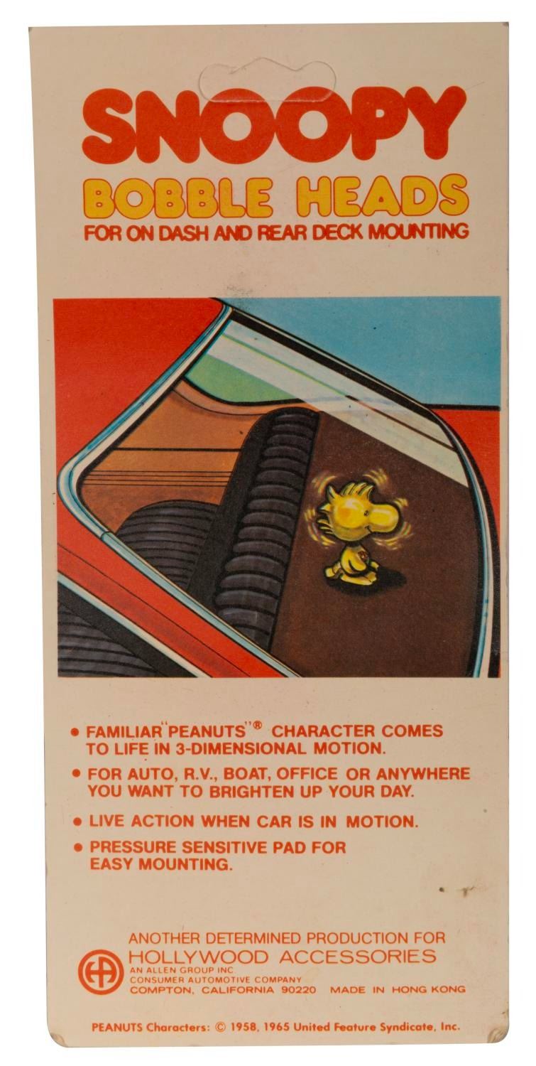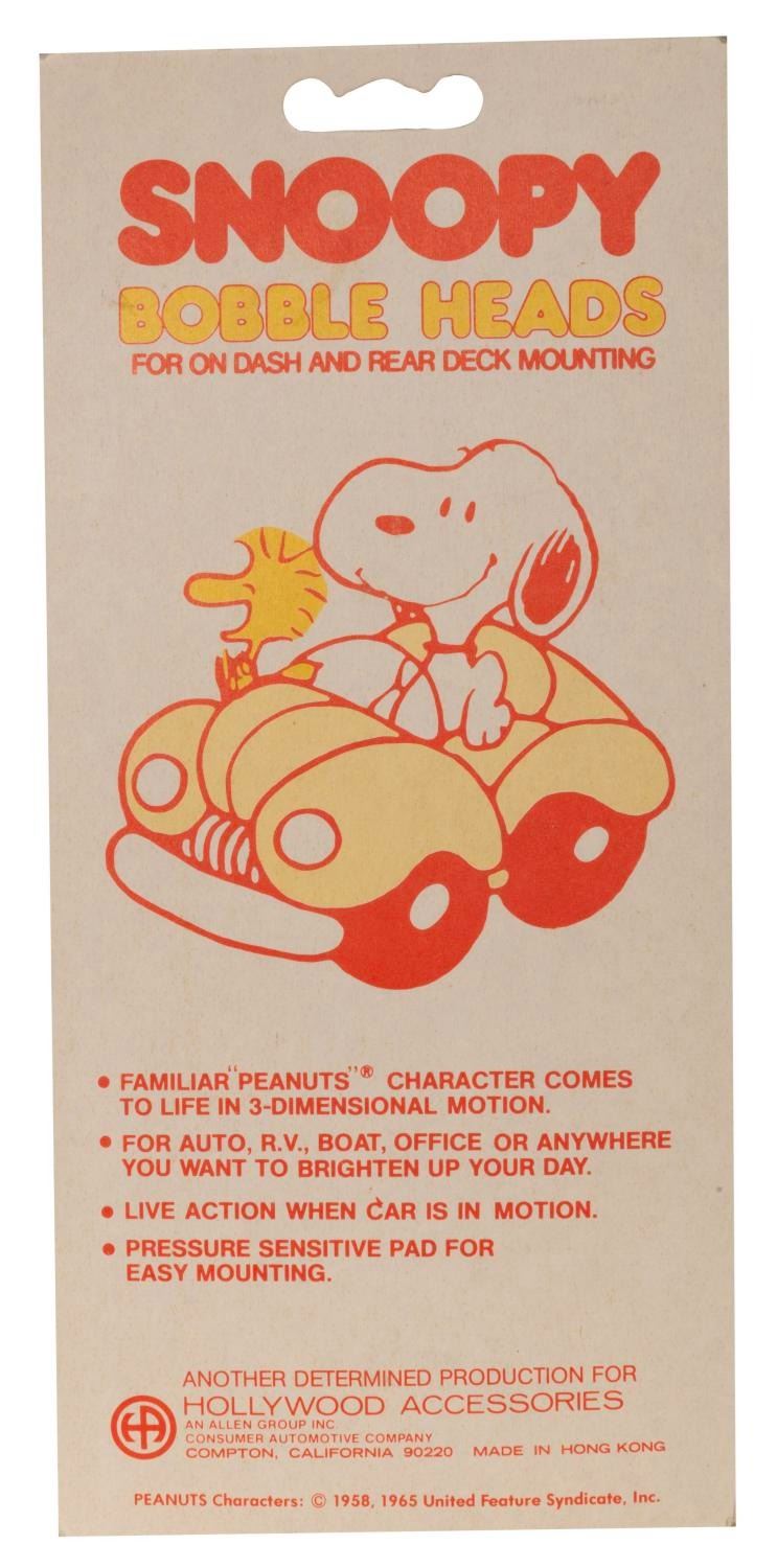 (Hollywood Accessories, 1965) A pair of Woodstock and Snoopy as Joe Cool bobbleheads, based on the Peanuts franchise. Measuring 4.25" tall each in their 4.25" x 8.75" original packaging, the unopened bobbleheads display in very good condition with spots of wear and discoloration from age, while the packages are in good condition with creases, wear, and pricing stickers.