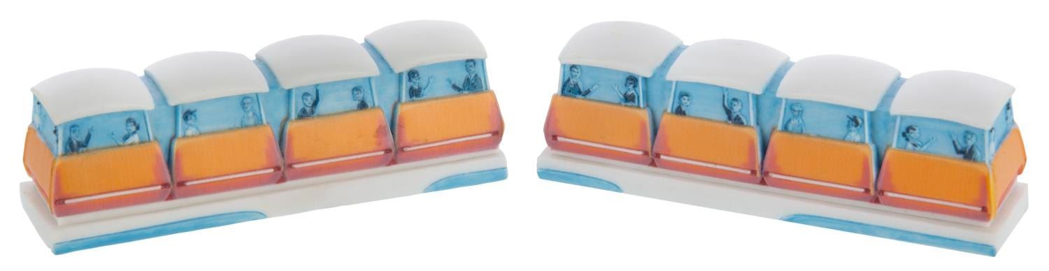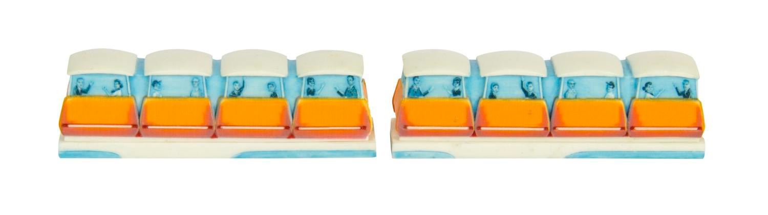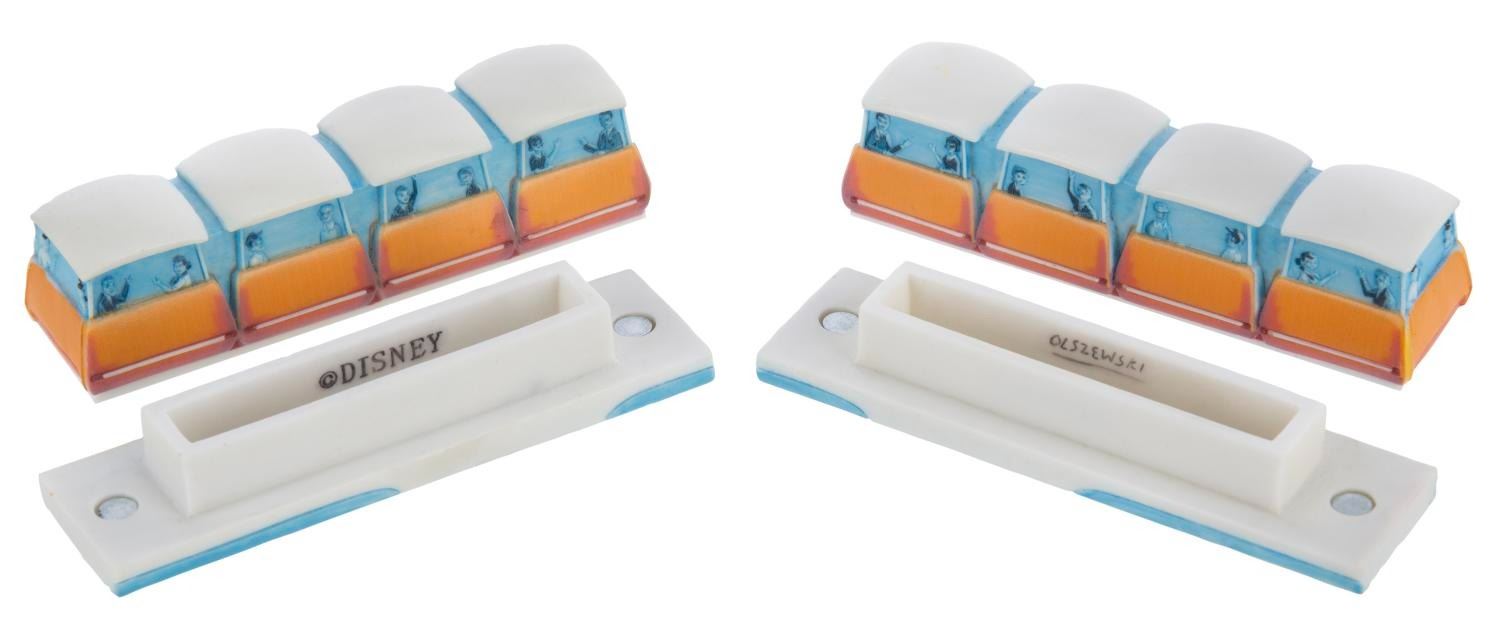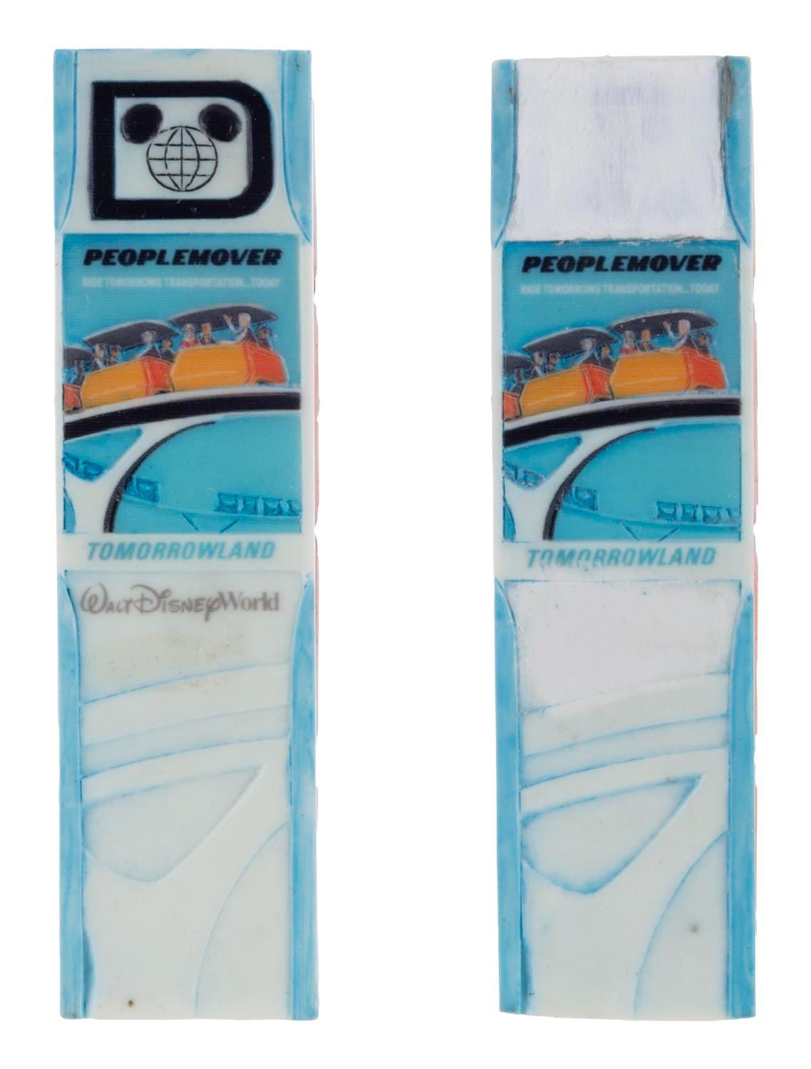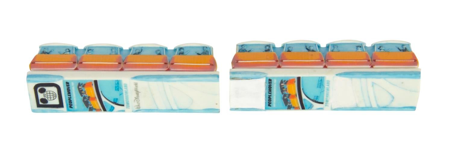 (Olszewski, 2000s) A pair of Disneyland/Walt Disney World PokitPals Tomorrowland Collection PeopleMover by Olszewski Studios. The bottom of the boxes holds a replica relief of the attraction poster and the Walt Disney World logo and name. One box has been modified, with the Walt Disney World logo and name covered with both resin and paint. Measuring 3.5"x1'x1", each piece is in fine condition.