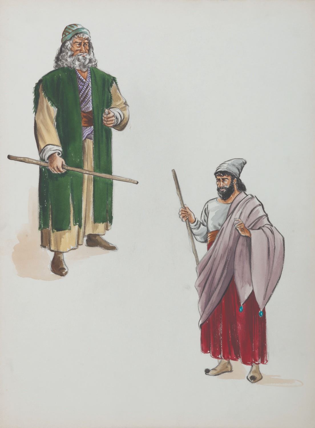 (1950s-1960s) A pair of costume concept designs for a period piece film. Both are executed in gouache on a single piece of artist board. Measuring 15"x20", the concept art is in very good condition with light wear to the bottom corners from handling.