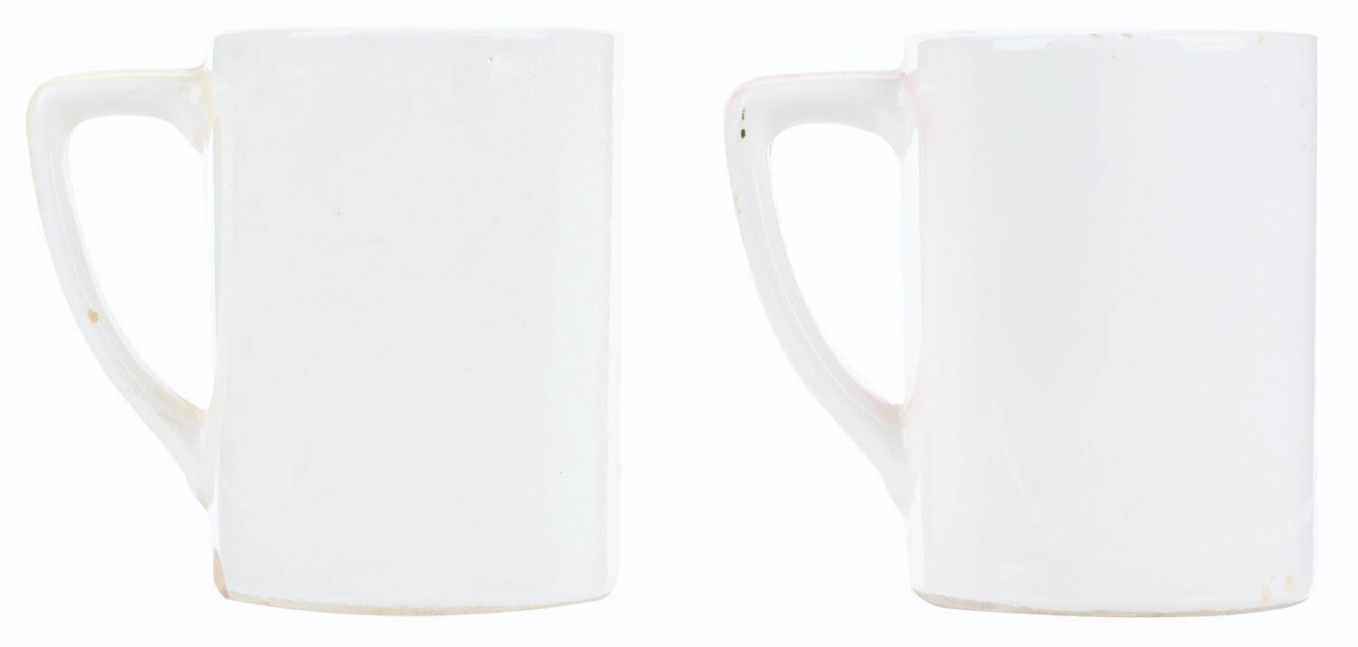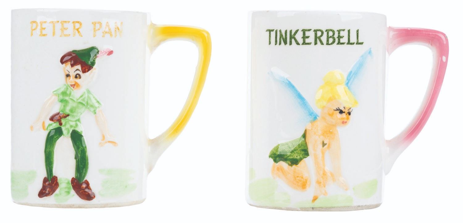 (Enesco, 1960s) A pair of ceramic mugs with a 3D relief of Peter Pan and Wendy from Walt Disney's "Peter Pan." Measuring 3.75" tall and 2.75" in diameter each, the mugs are in good condition with chips, scuffs, light stains, and wear.