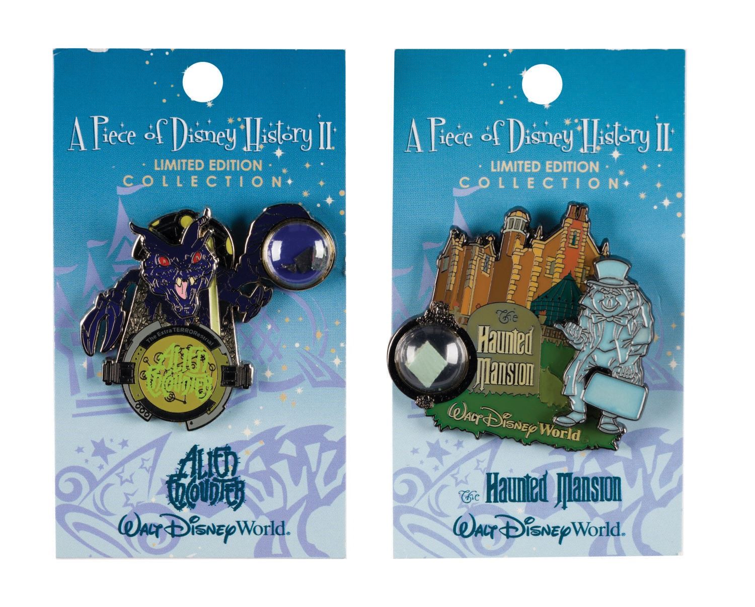 (Walt Disney World, 2006) A pair of limited-edition "A Piece of Disney History II" pins. Among the lot are pins commemorating Alien Encounter (8 of 12) and The Haunted Mansion (2 of 12) at The Magic Kingdom. Each pin was released in an edition of 2,500 and contains pieces of Audio-Animatronics figures from the attractions. Measuring 1.5"x1.75" and 1.75"x2", the pins are in fine condition and come with original very good condition cards, exhibiting slightest wear to edges and corners of cards.