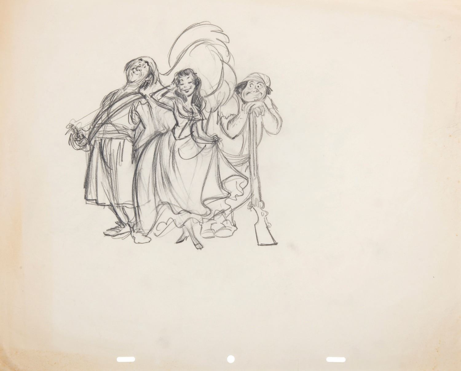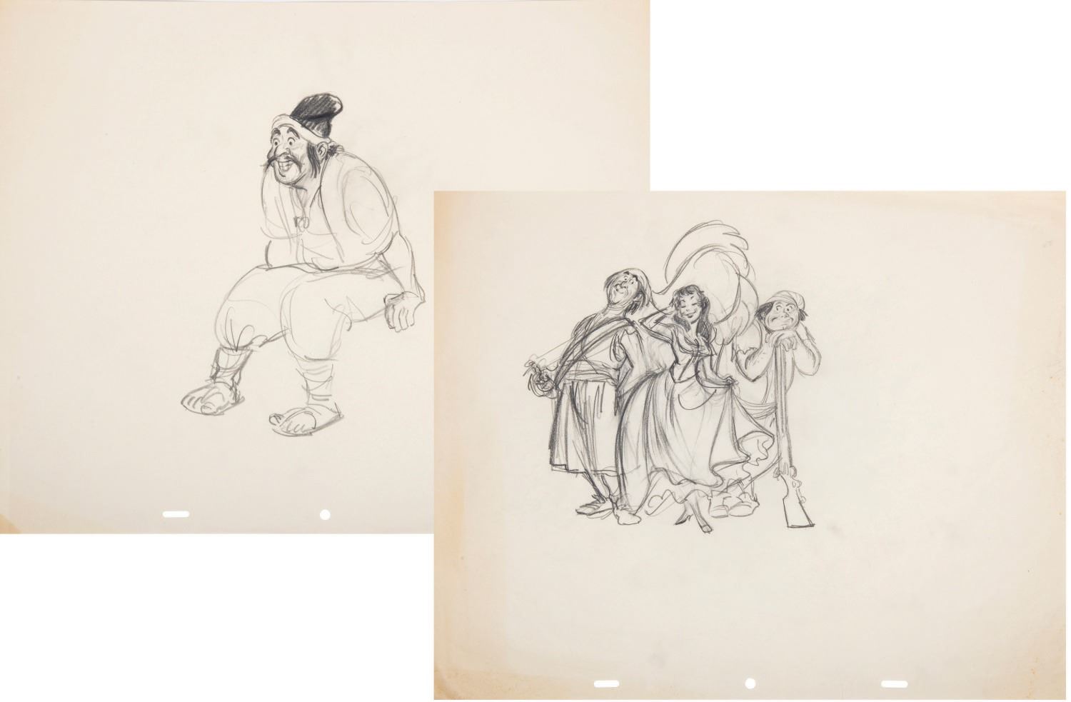 (Disneyland, 1967) A rare pair of one-of-a-kind drawings prepared during the production of Pirates of the Caribbean at Disneyland. These rare concept sketches were created by Imagineers and feature four characters and one vignette that were ultimately presented through the magic of Audio Animatronics. The artwork is accomplished in graphite on 3-peghole animation paper. Measuring 7.25"x7.5" and 6"x8" on 15.5"x12.5" paper, the pieces are in very good condition with minor wear to edges, light creases, and faint yellowing from handling and age.