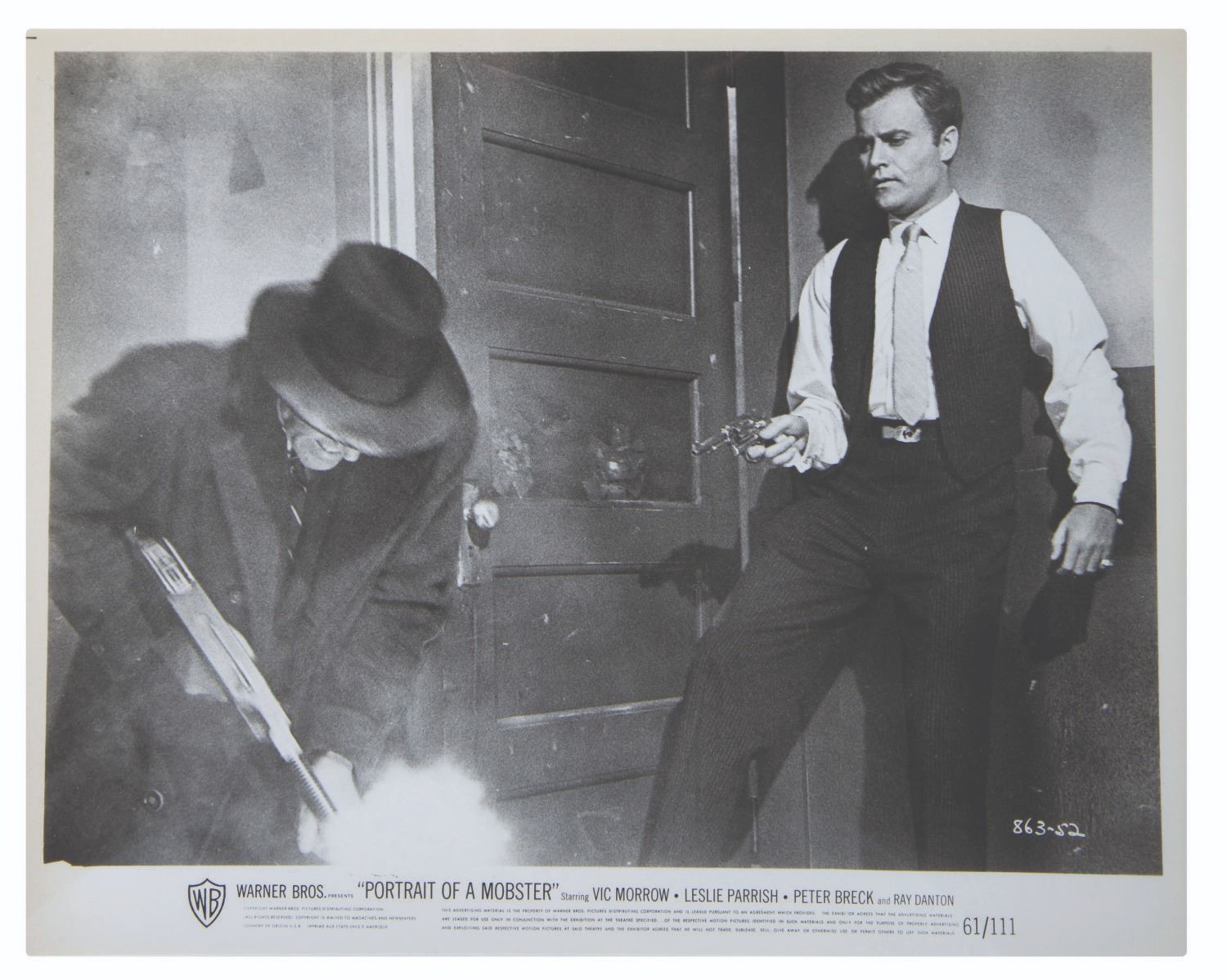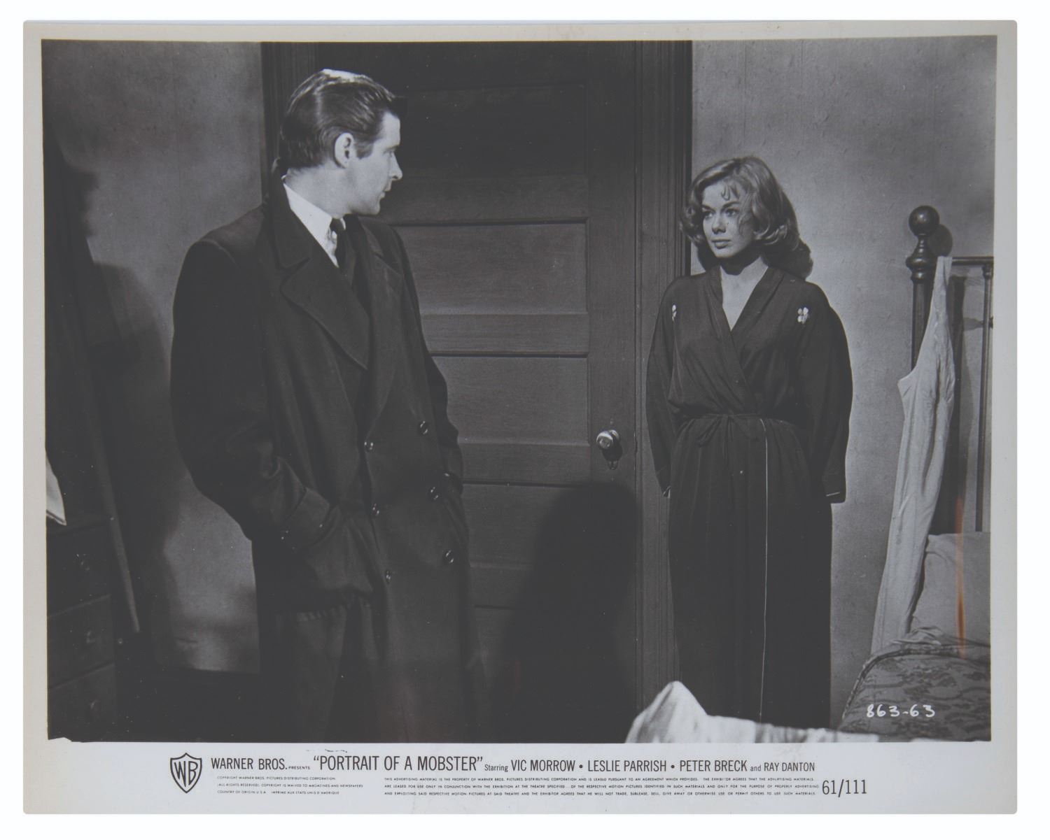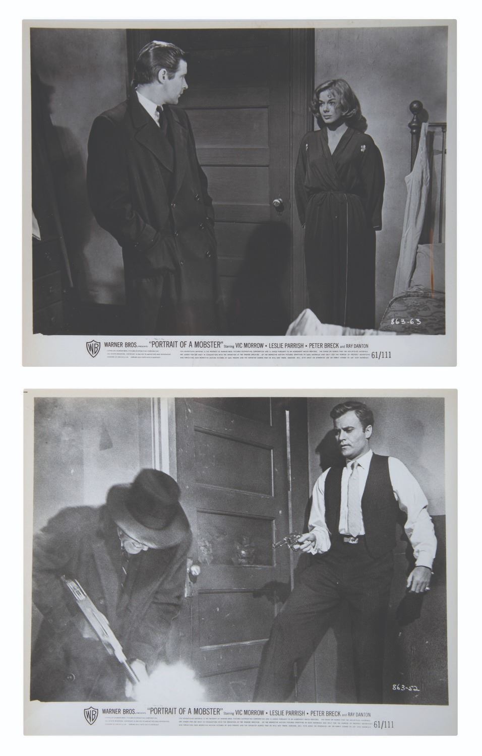 (Warner Bros., 1961) A pair of press photos from the 1961 film Portrait of a Mobster. Each measuring 8"x10", the photos are in good condition, with light toning and edge wear from age.