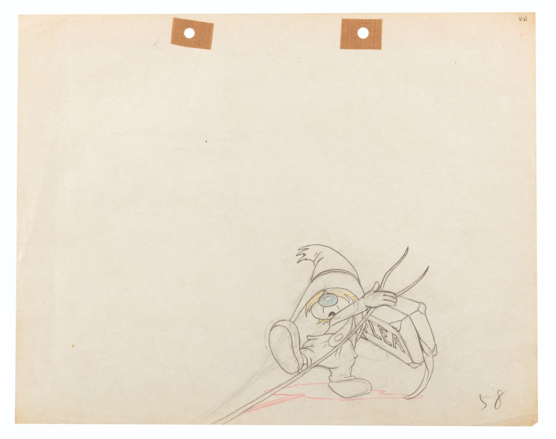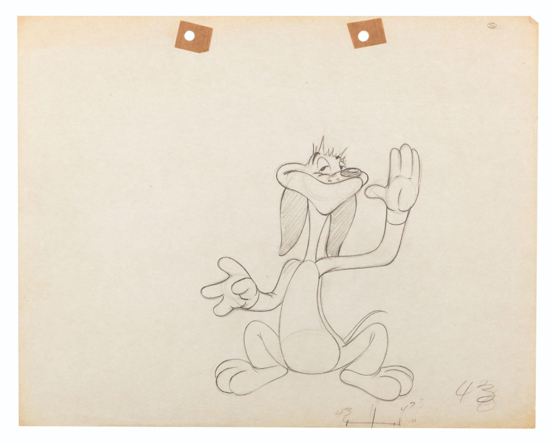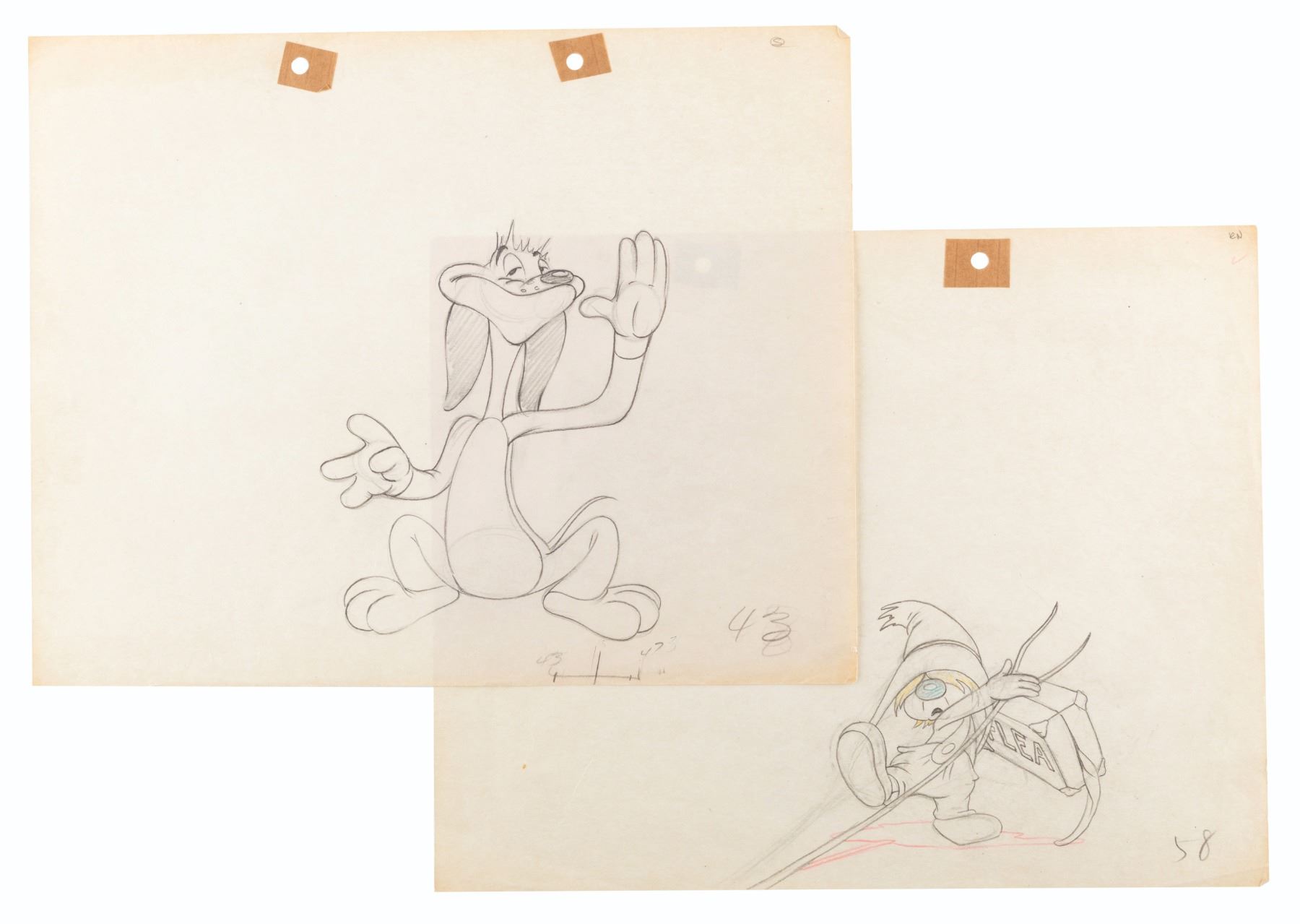 (Schlesinger, 1943) A pair of production drawings of A. Flea and a dog from “An Itch in Time.” The short was directed by Bob Clampett, who also wrote the song “Food Around the Corner” for the film. With image sizes ranging from 3.5” x 4” to 5” x 6” on 9.5” x 12” animation paper, the graphite and colored pencil drawings are in good condition with creases, discoloration from age, wear from production use, and a graphite inscription on the reverse of the A. Flea drawing.