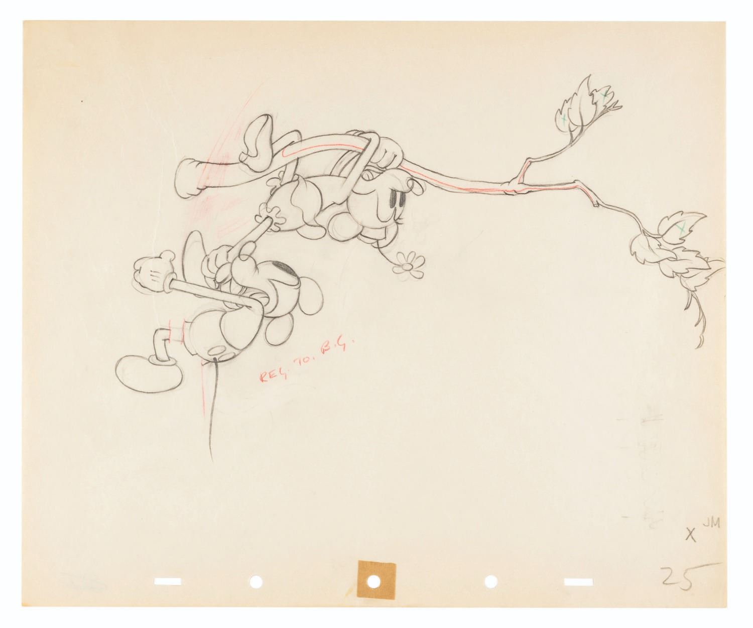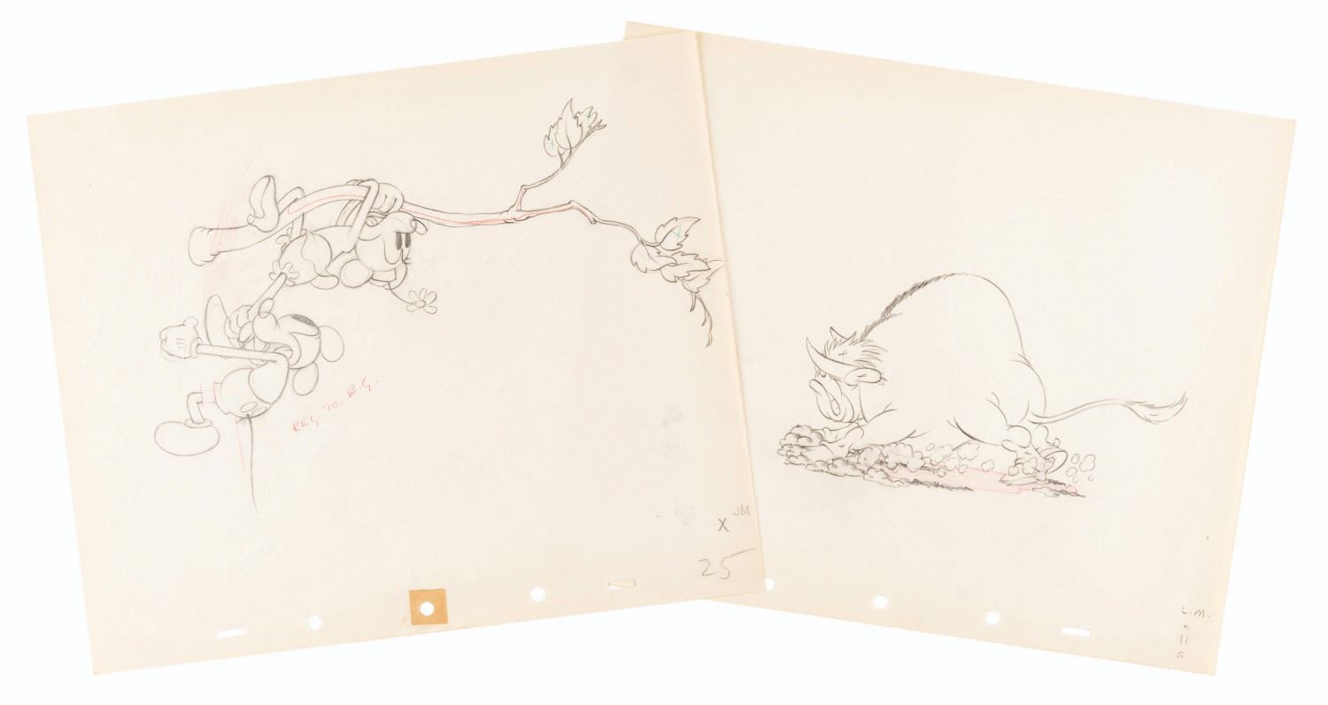 (Disney, 1936) A pair of original production drawings from "Mickey's Rival." One drawing features the Bull that chases Mickey and Minnie, and the other is a wonderful image of Mickey and Minnie up a tree. Mickey and Minnie’s image size is 7” x 10” and the bull’s image size is 4” x 7”, each accomplished in graphite and colored pencil on untrimmed 10” x 12” animation paper. Both drawings are in fine condition with only light wear.