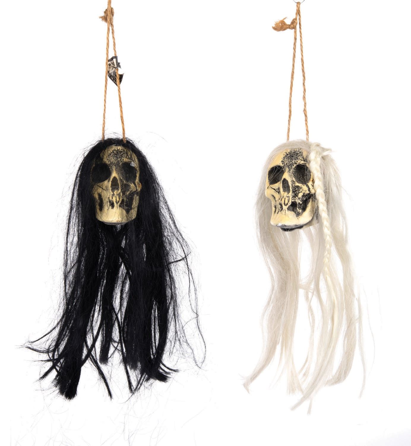 (Disneyland, 1960s-70s) A pair of glow-in-the-dark Voodoo Skulls by Randotti Smith. Souvenir skulls by Randotti were among the popular merchandise once offered in Adventureland at Disneyland. Each vintage resin skull has a twine rope for hanging. Measuring 3.75"x4.75", the decorative souvenirs are in very good condition, despite minor wear to hair, one retaining a rare and original "Ivan the Hairy One" label.