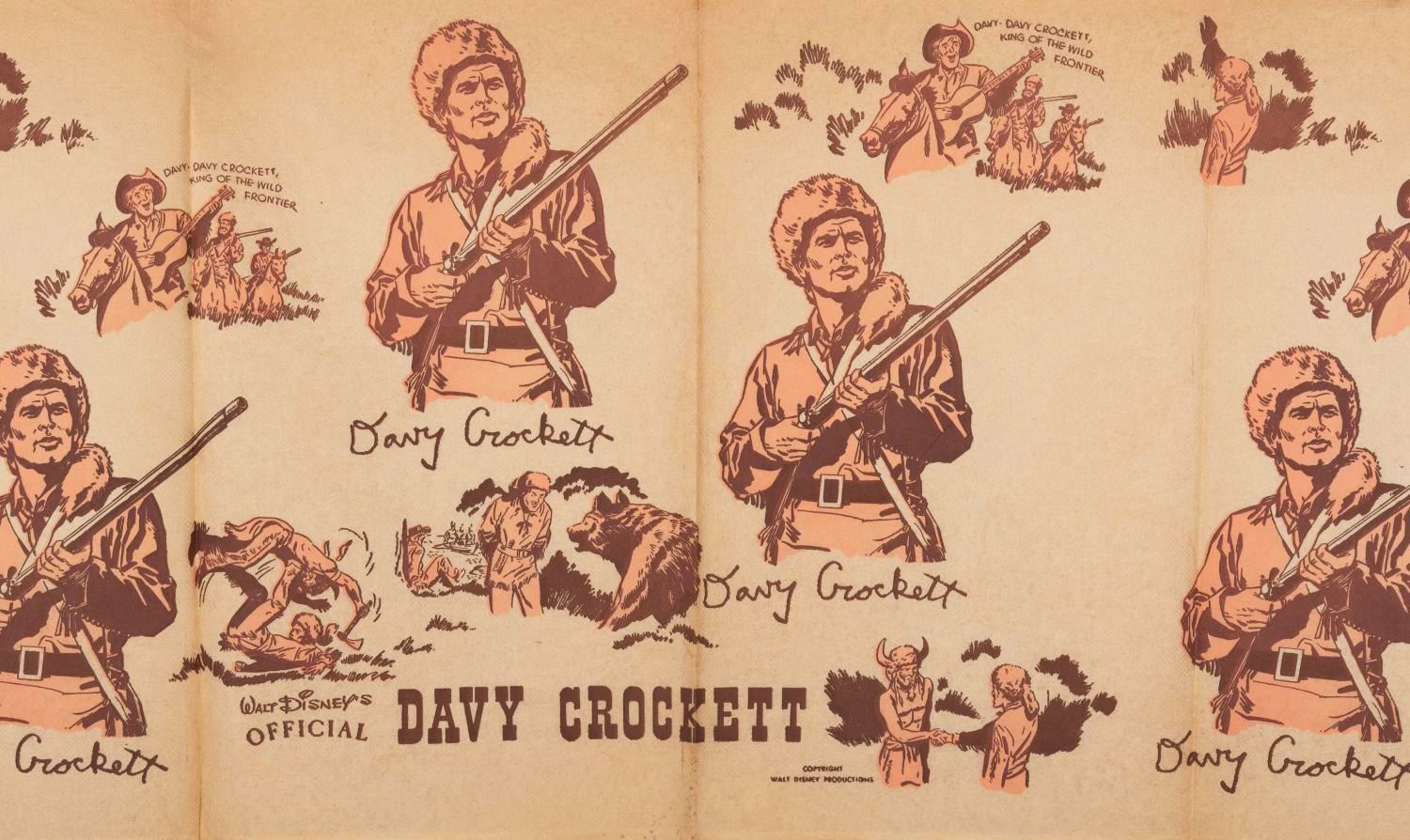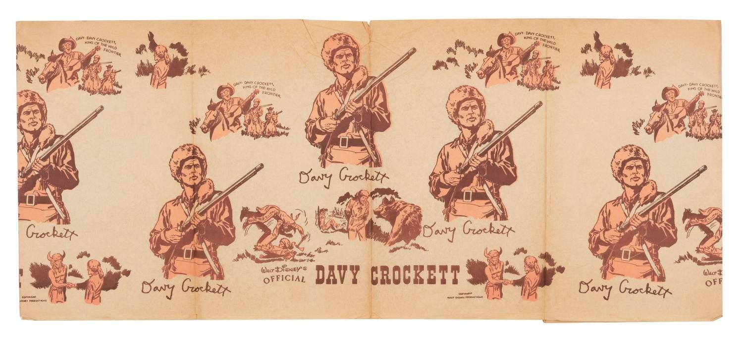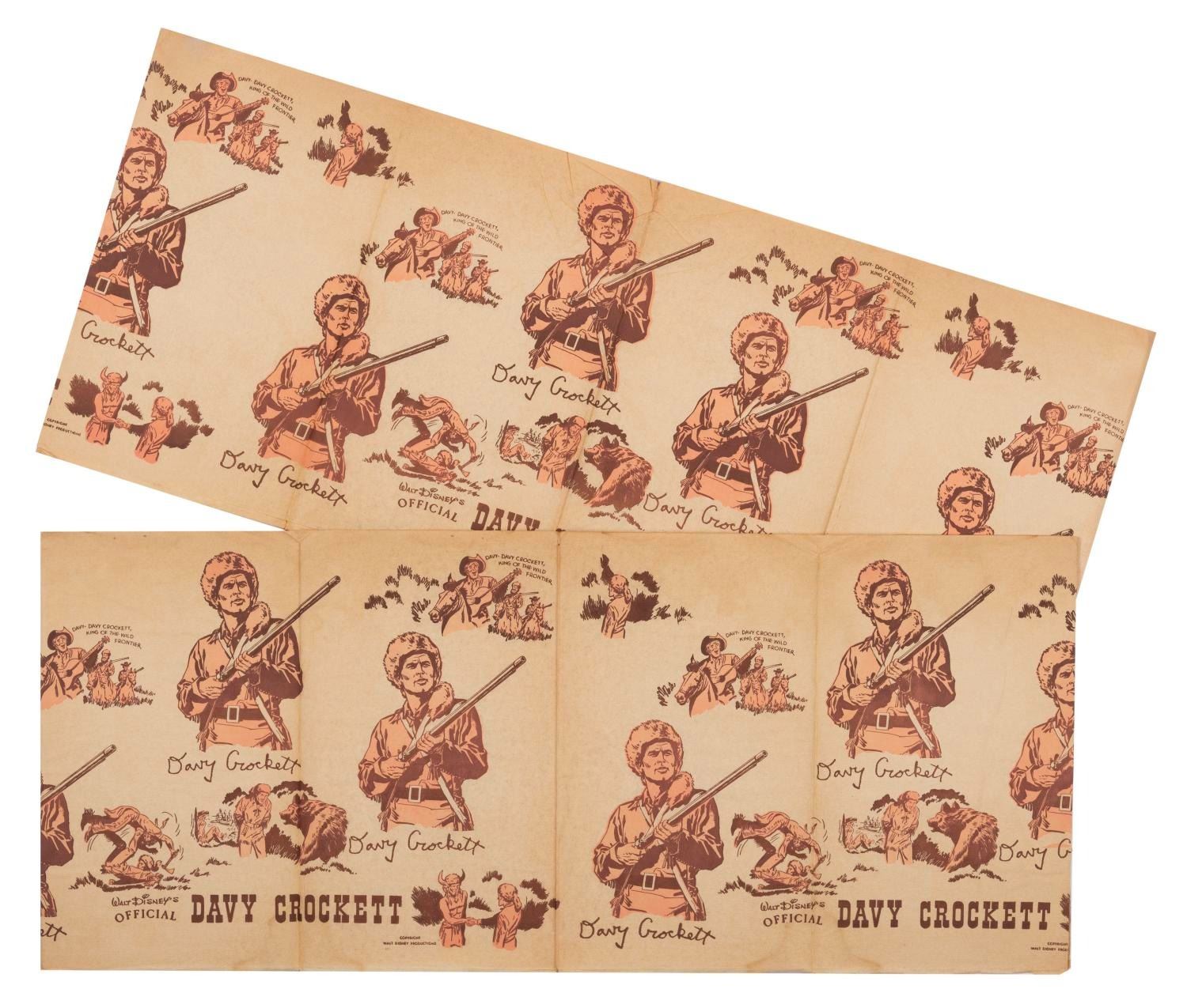 (Disney/ Beach Products, 1950s) A pair of Davy Crockett paper table covers featuring Fess Parker as the King of the Wild Frontier. These very thin party tablecloths are very fragile, with very few examples surviving. Measuring 56" x 88" each, the two paper tablecloths are in good condition with wear, creases, water stains, discoloration from age, and some soiling mainly to the outer folded panels.