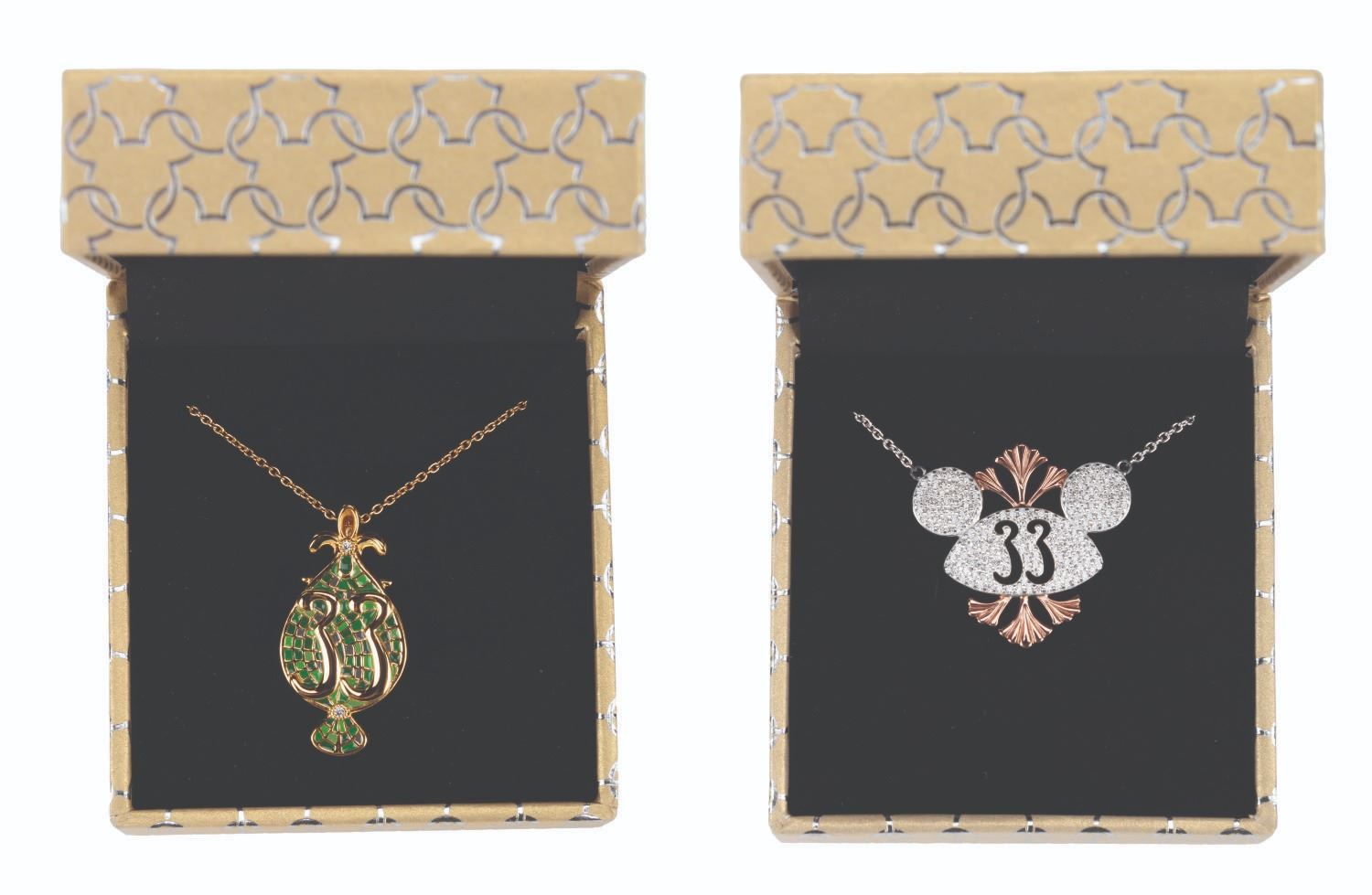 (Disneyland, 2021-22) A pair of Club 33 member-exclusive necklaces designed by Rebecca Hook. One necklace features a .925 sterling silver Mickey ears pendant plated with 18k rose gold on a 20” silver chain, and the other commemorating the club’s emerald anniversary with a .925 sterling silver pendant plated with 18k yellow gold on a 20” chain. The necklaces are in fine condition and come with their original boxes.