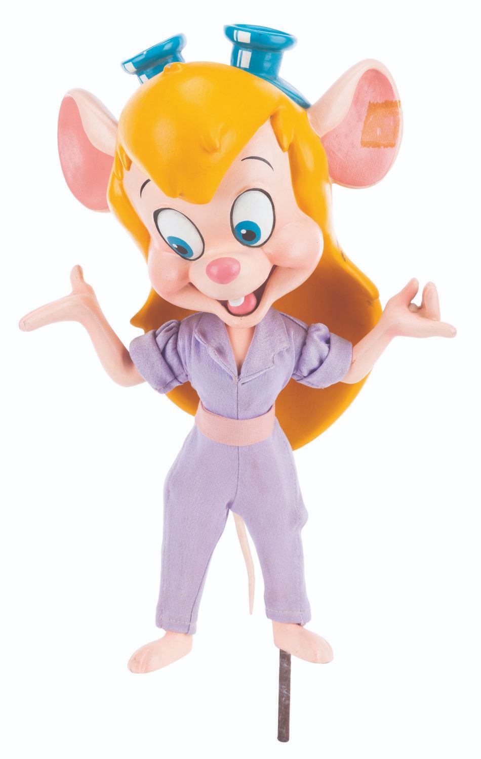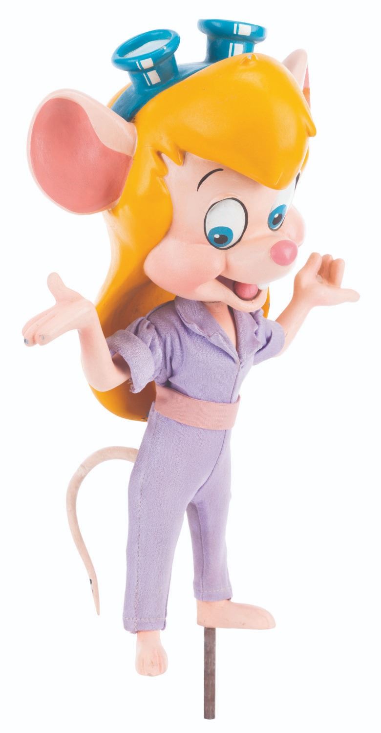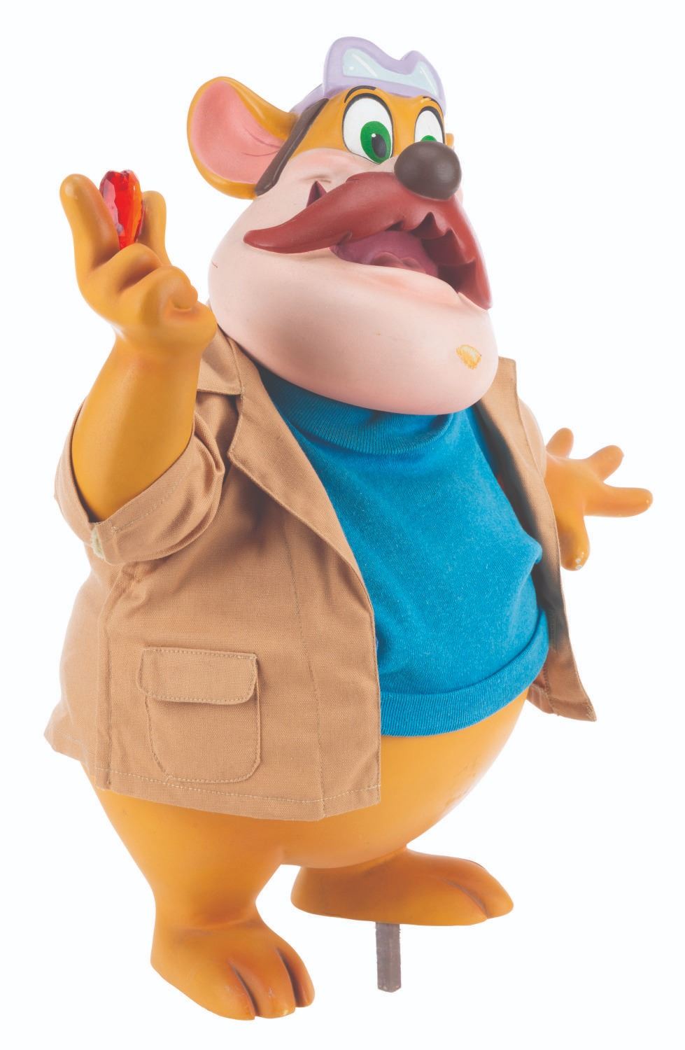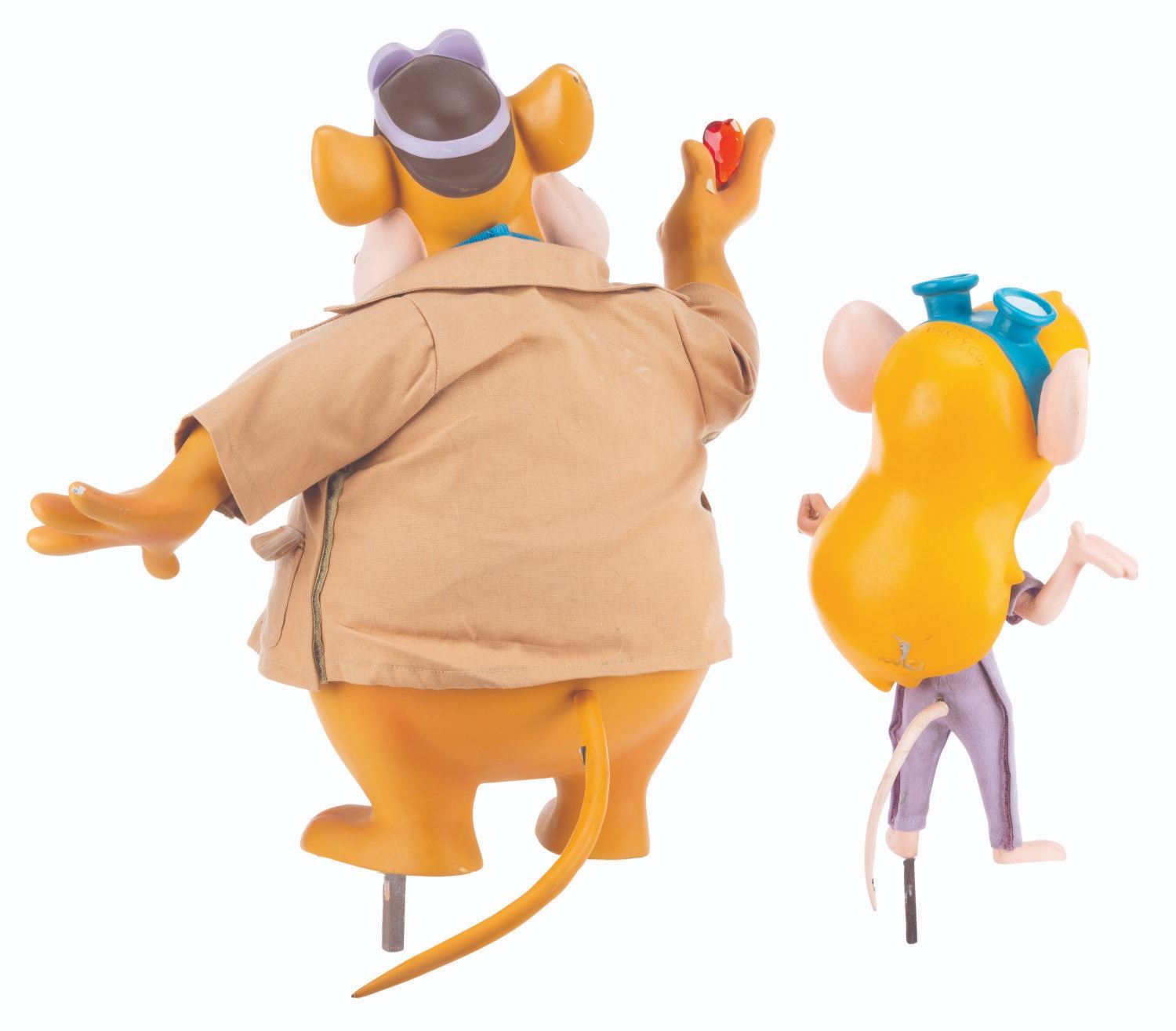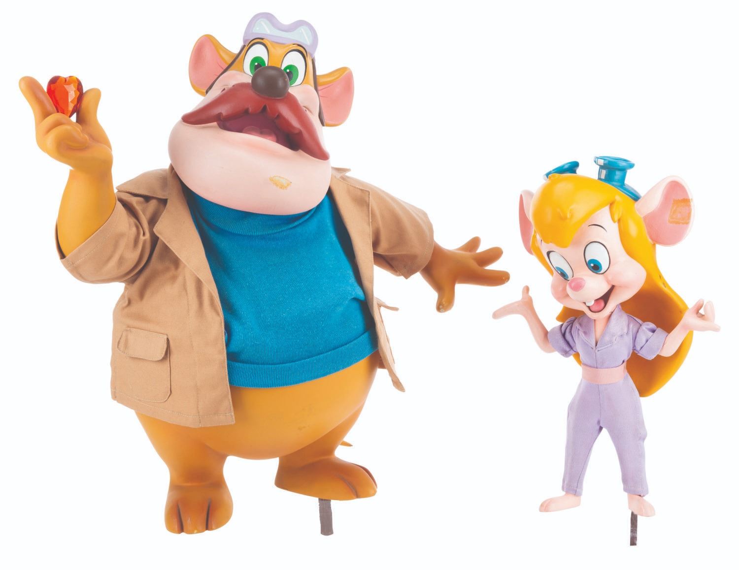 (Disney, 1990) A pair of original Disney Store display figures of Gadget and Monterey Jack from the hit television series "Chip ‘n Dale Rescue Rangers.” Ranging in size from 8.5” x 6” x 15” tall to 20” x 10.5” x 19” tall, the figures display in good condition with paint chips and loss, tape residue, stains, scuffs, wear from store use, cracks including a full repaired crack on Gadget’s neck, and Gadget’s tail loose. Due to size and weight, special shipping arrangements are required. Please inquire before bidding.