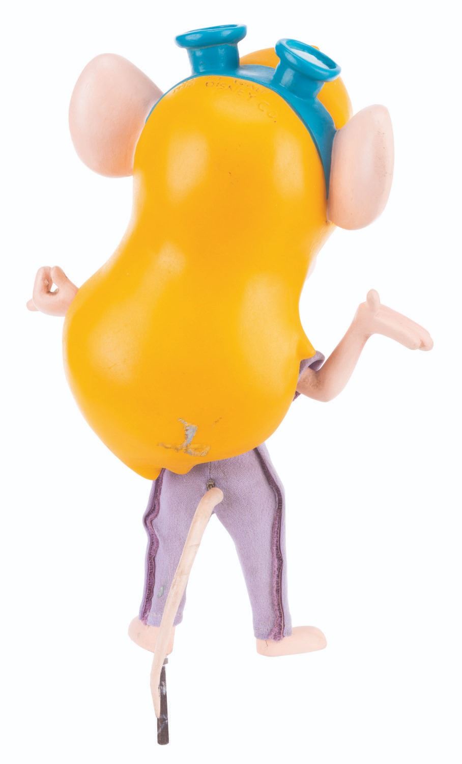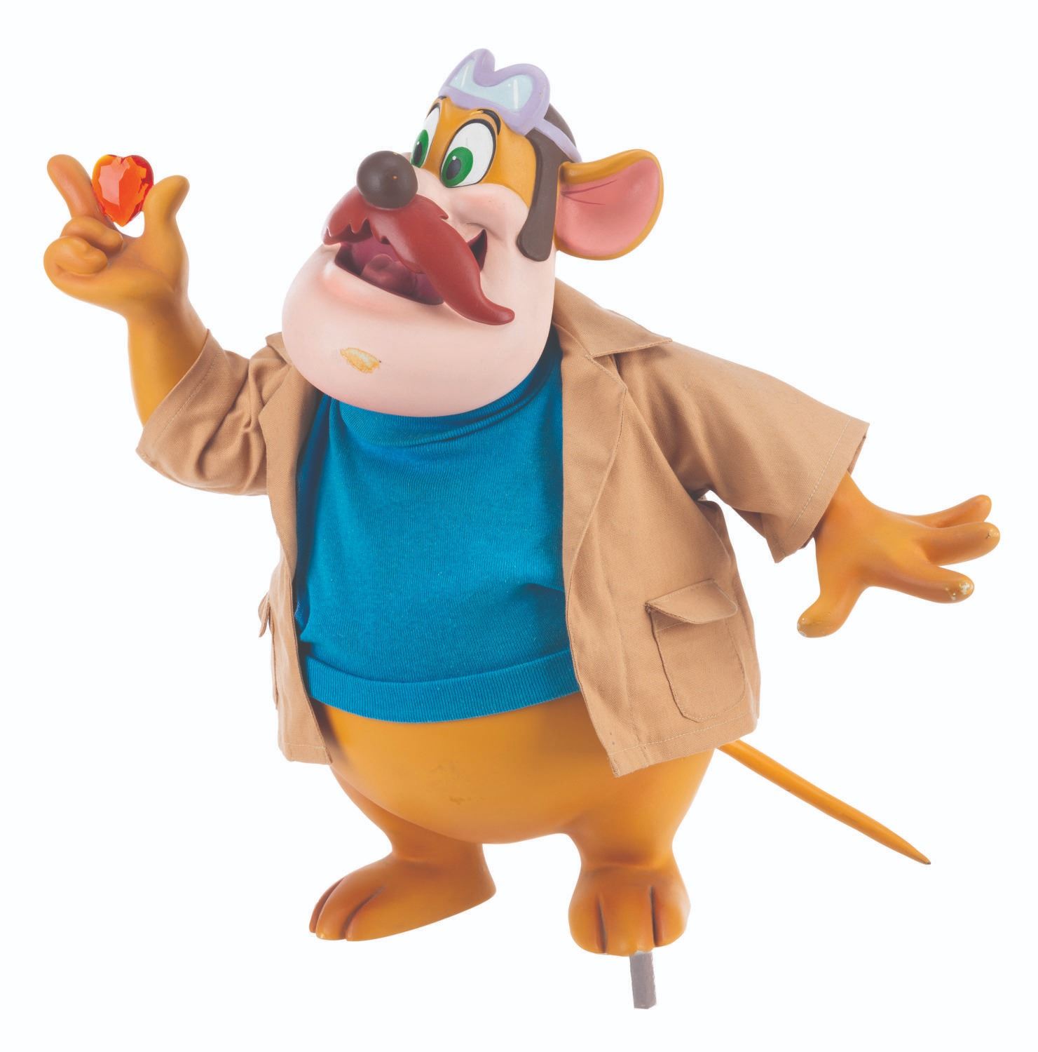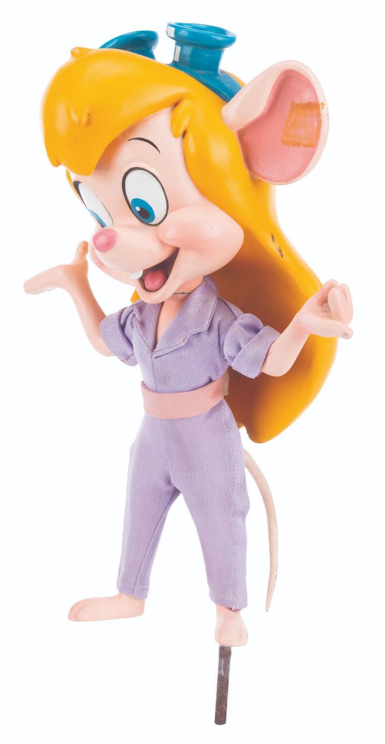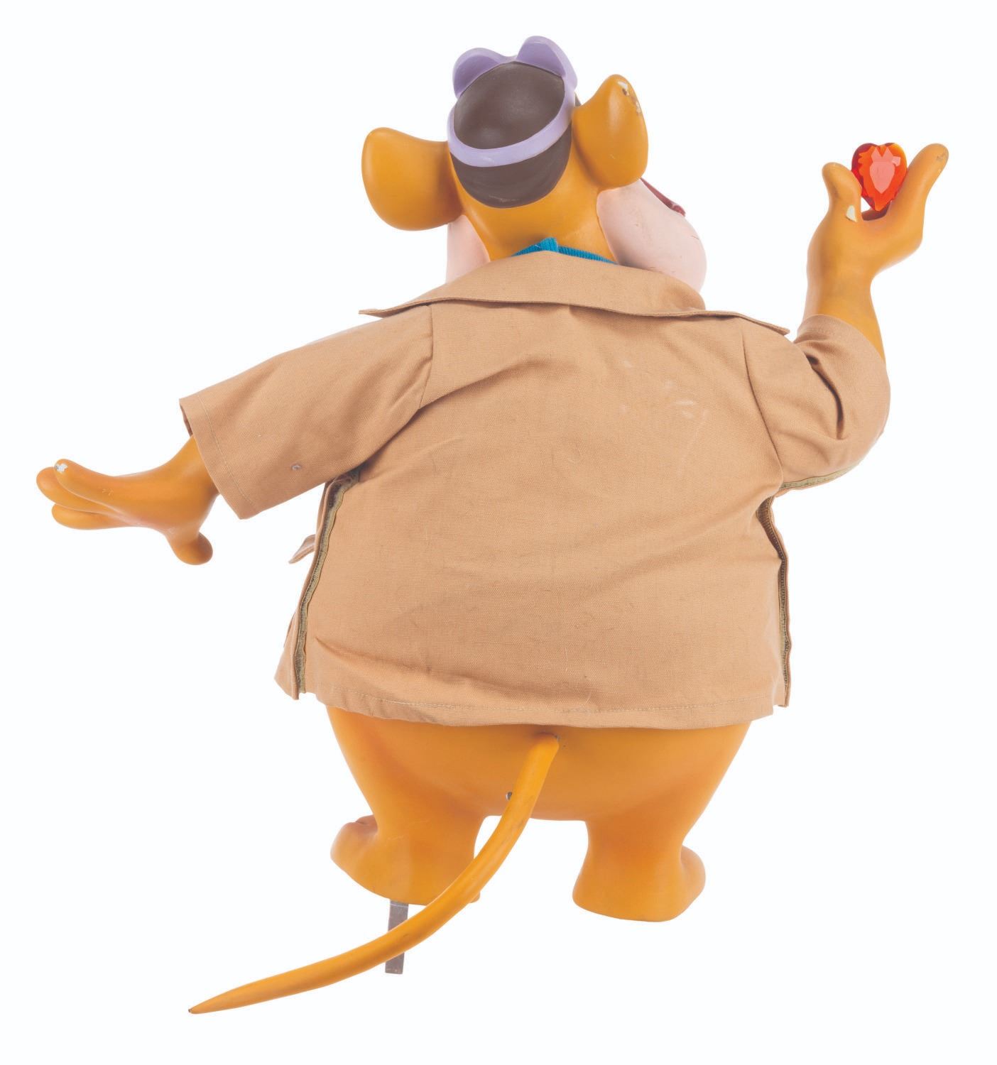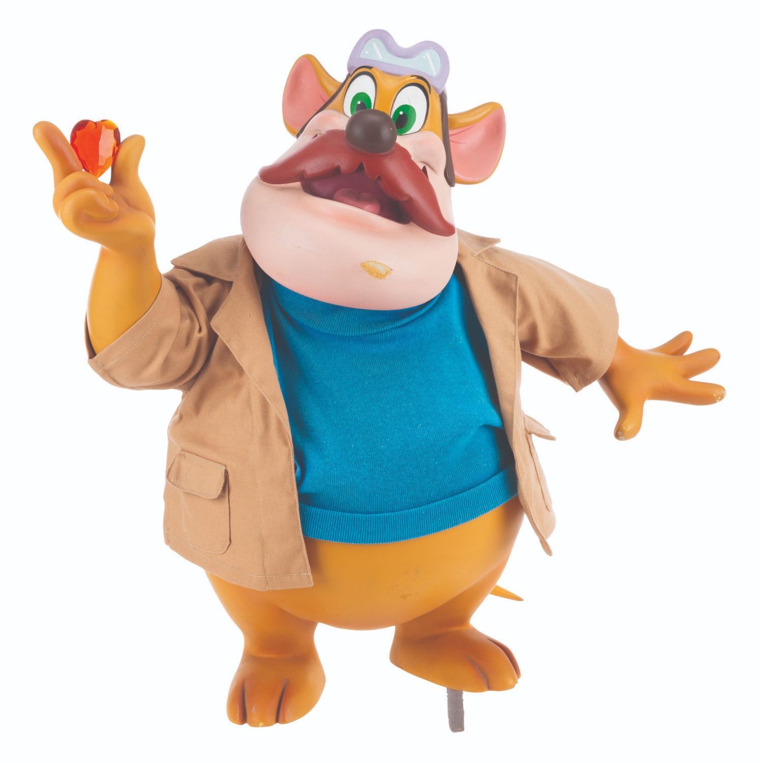 (Disney, 1990) A pair of original Disney Store display figures of Gadget and Monterey Jack from the hit television series "Chip ‘n Dale Rescue Rangers.” Ranging in size from 8.5” x 6” x 15” tall to 20” x 10.5” x 19” tall, the figures display in good condition with paint chips and loss, tape residue, stains, scuffs, wear from store use, cracks including a full repaired crack on Gadget’s neck, and Gadget’s tail loose. Due to size and weight, special shipping arrangements are required. Please inquire before bidding.