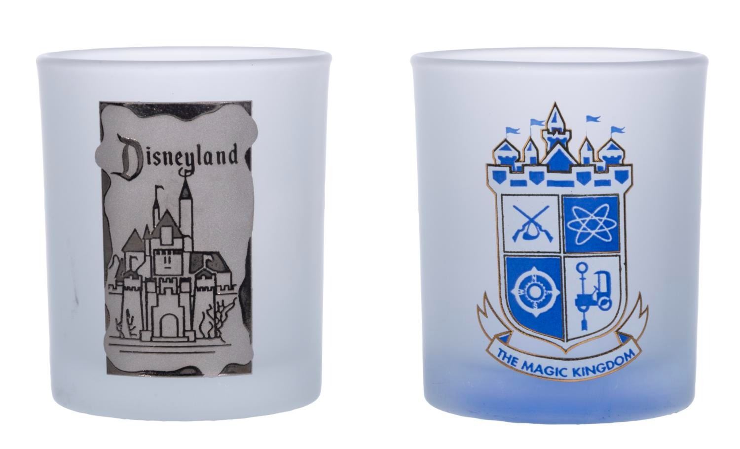 (Disneyland, 1990s) A pair of Disneyland votive candleholders with retro 1950s-style logos. Each measuring 2.5" tall, the votives are in very good condition with light wear.