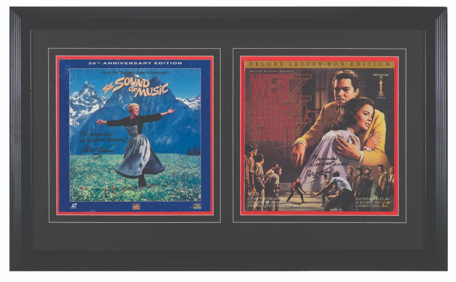 (Robert Wise, 1990s-2000s) A pair of Laser Disc covers signed by Robert Wise. Included are covers for The Sound of Music and West Side Story, both directed and produced by Wise. Each measuring 12.5"x12.5", the West Side Story cover is in very good condition, with The Sound of Music in good condition but exhibiting some scuffing.