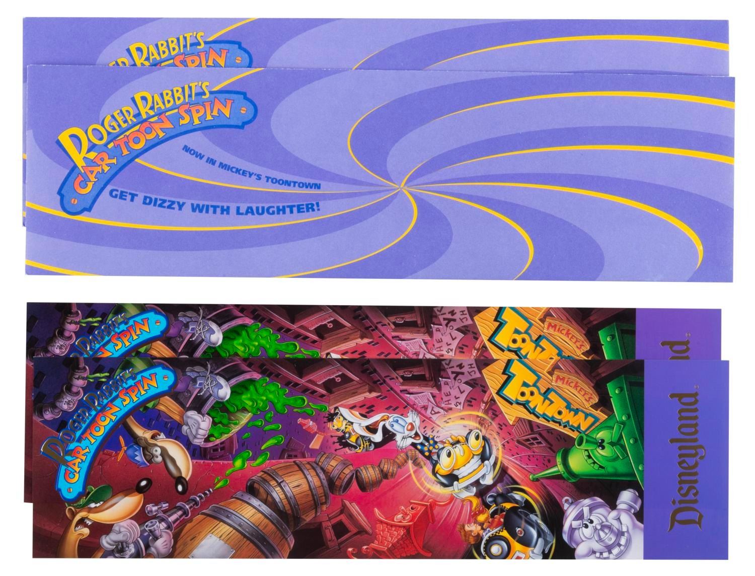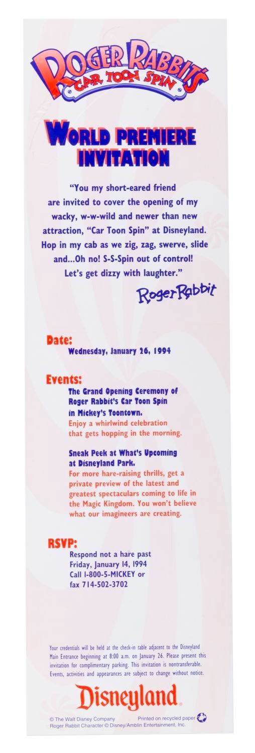 (Disneyland, 1994) A pair world premiere invitations to Roger Rabbit’s Car Toon Spin. The invitations measuring 4” x 14” and envelopes measuring 4” x 14.25” are in very good condition with light wear to the corners of the envelopes.
