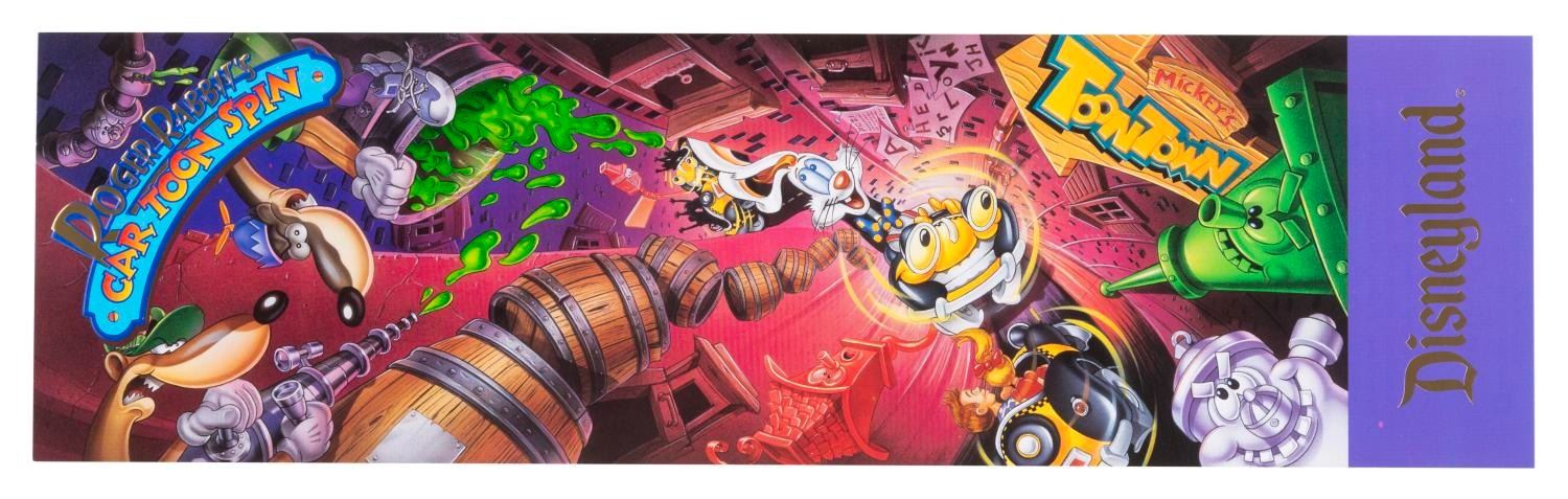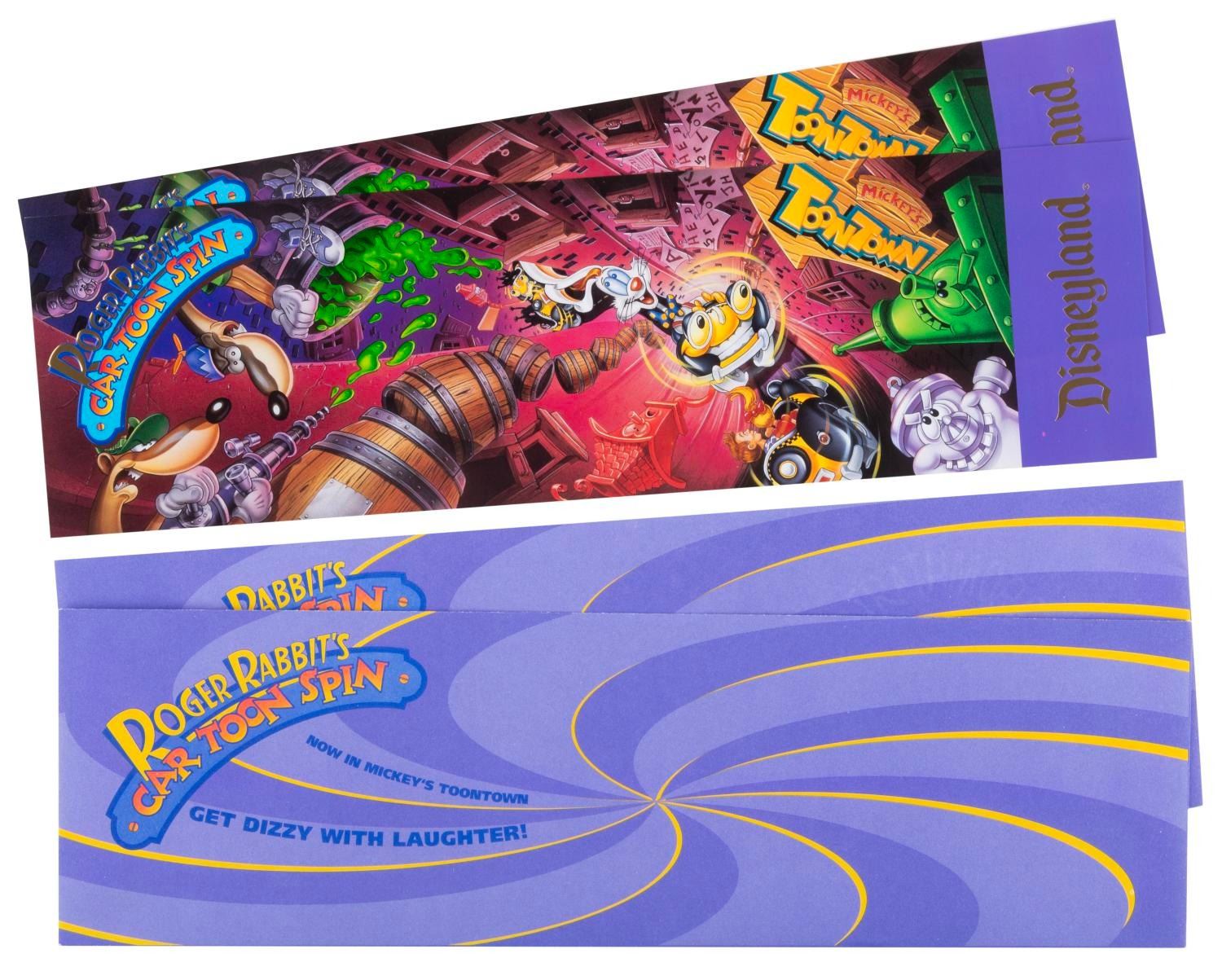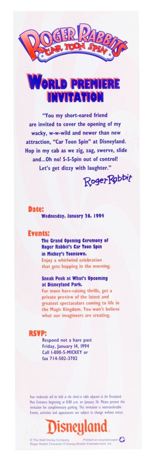 (Disneyland, 1994) A pair of invitations to the world premiere of Roger Rabbit's Car Toon Spin attraction at Disneyland on January 26, 1994. Measuring 4" x 14" each, the invitations come with their original envelopes and are in very good to fine condition with light handling wear and price stickers on the envelopes.