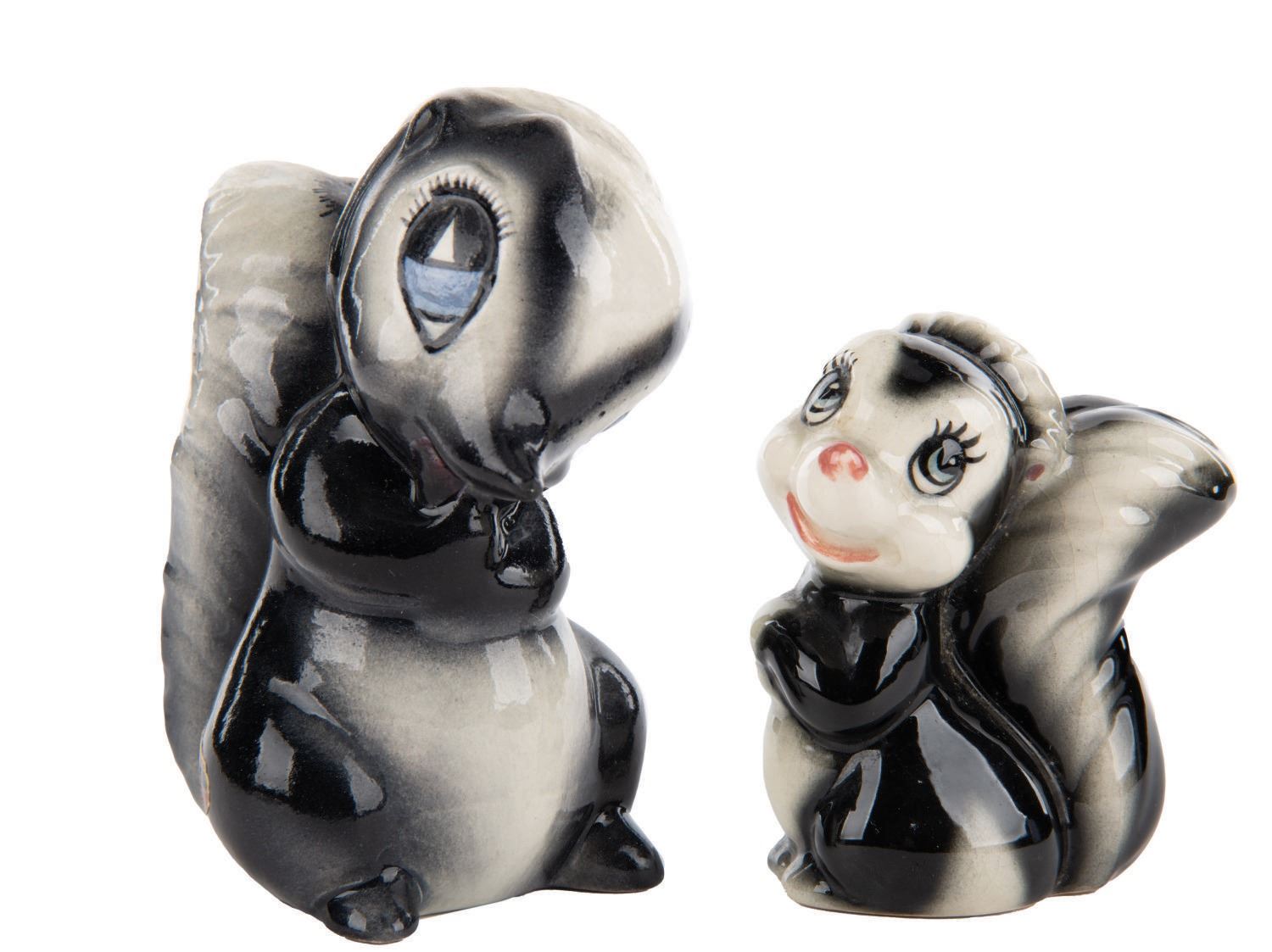 (Shaw/American, 1940s/50s) A pair of painted glazed ceramic "Flower" figurines by Shaw and American Pottery. The smaller Flower was manufactured by Shaw while the larger was made by its subsidiary American and retains a rare Disneyland price tag underneath (representative of Shaw's last year of holding the Disney license). Measuring 3.25" and 5.5" tall, the figures are in very good overall condition, despite minor crazing to glaze.