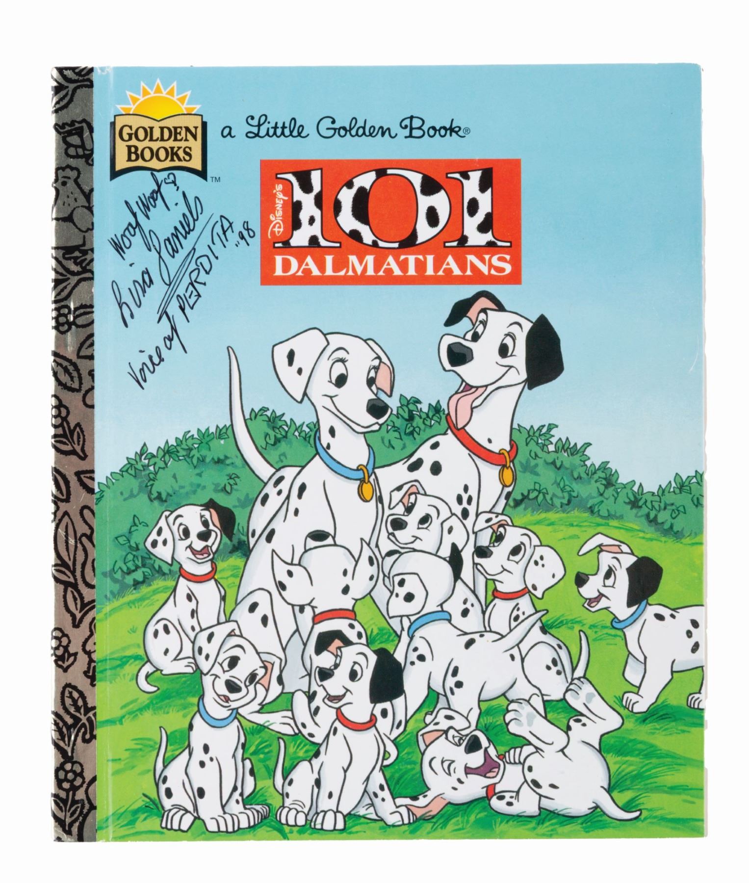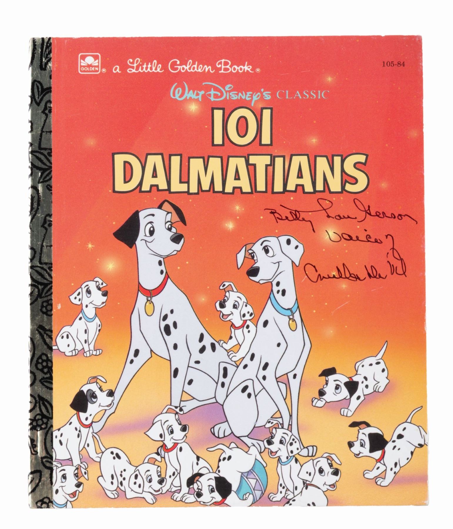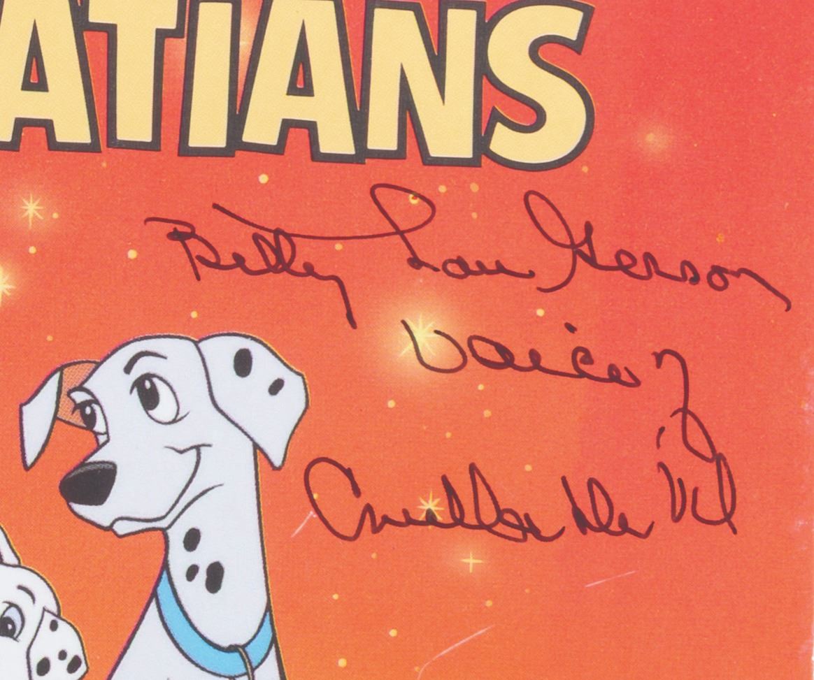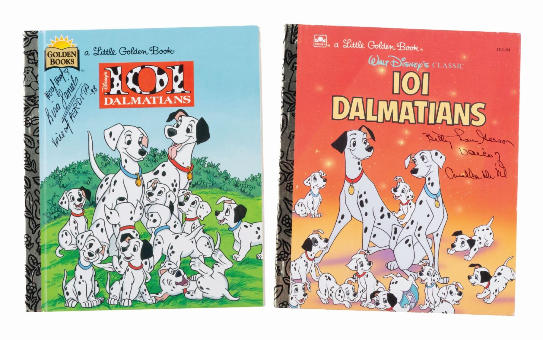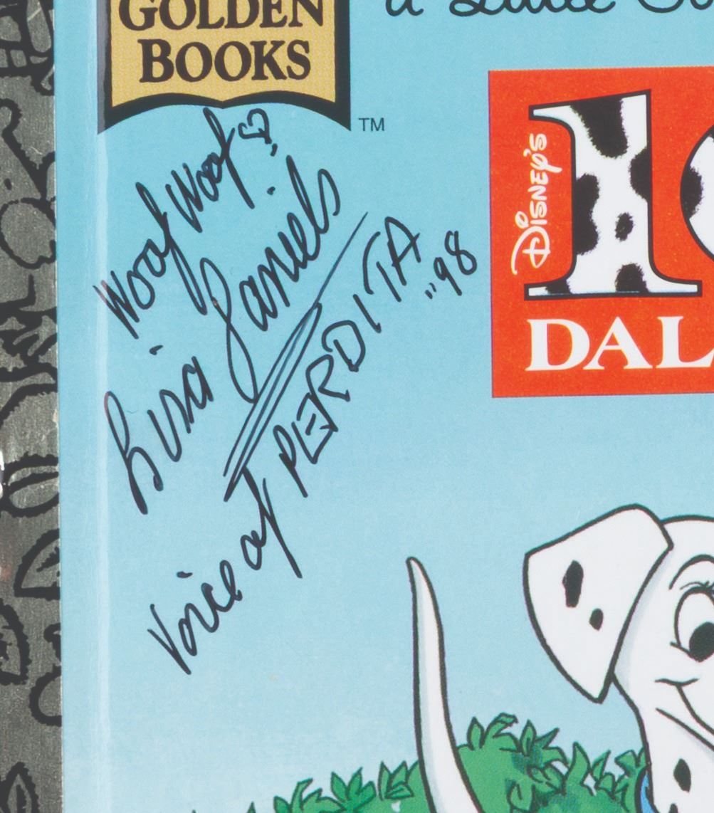 (Golden, 1991/97) A pair of "101 Dalmatians" Little Golden Books, one signed by the voice of Cruella De Vil, Betty Lou Gerson, and the other by the original voice actor for Perdita, Lisa Daniels. After recording a third of her lines, Daniels left the production and was replaced by Cate Bauer. Measuring 6.75" x 8" each, the books are in very good condition with light scratches, scuffs, handling wear, and pricing stickers.