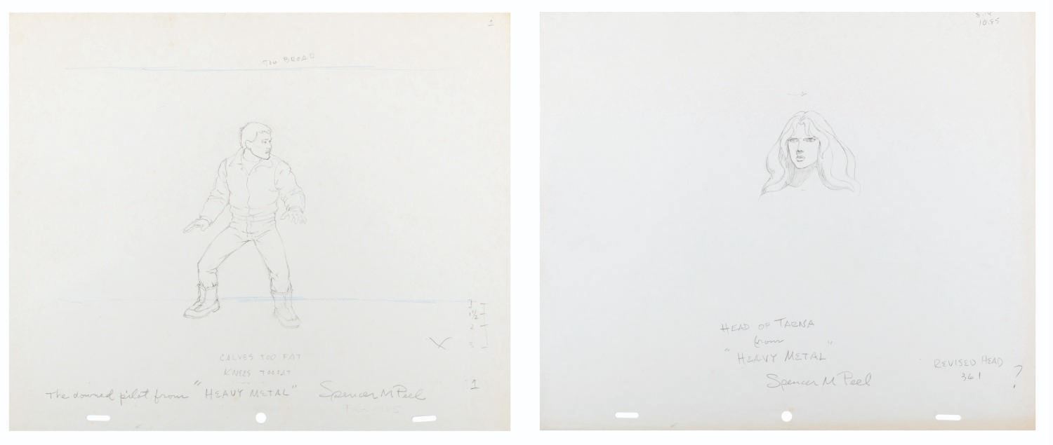 (Columbia Pictures, 1981) A pair of character study sketches for the film "Heavy Metal," signed by animator Spencer M. Peel. The sketches depict "Taarna" from the segment of that name, and the downed pilot from the "B-17" segment, and both include production notations. With images measuring 2.25" x 2.5" and 5.25" x 3" on 10.5" x 12" animation paper, both signed sketches are in very good condition with light color shift to the paper from age.