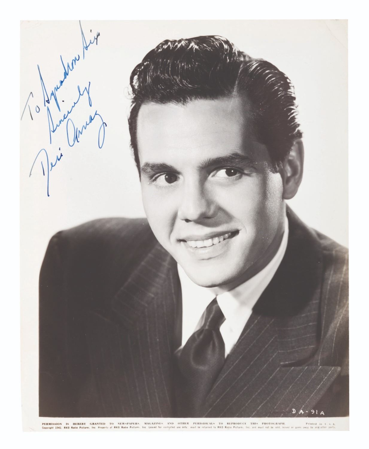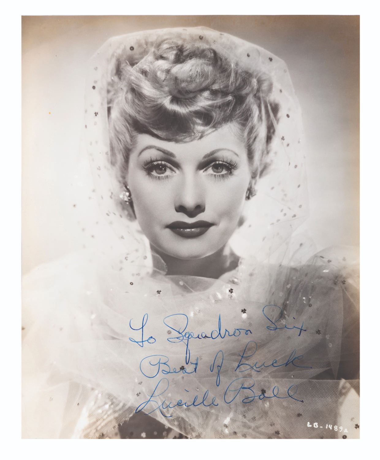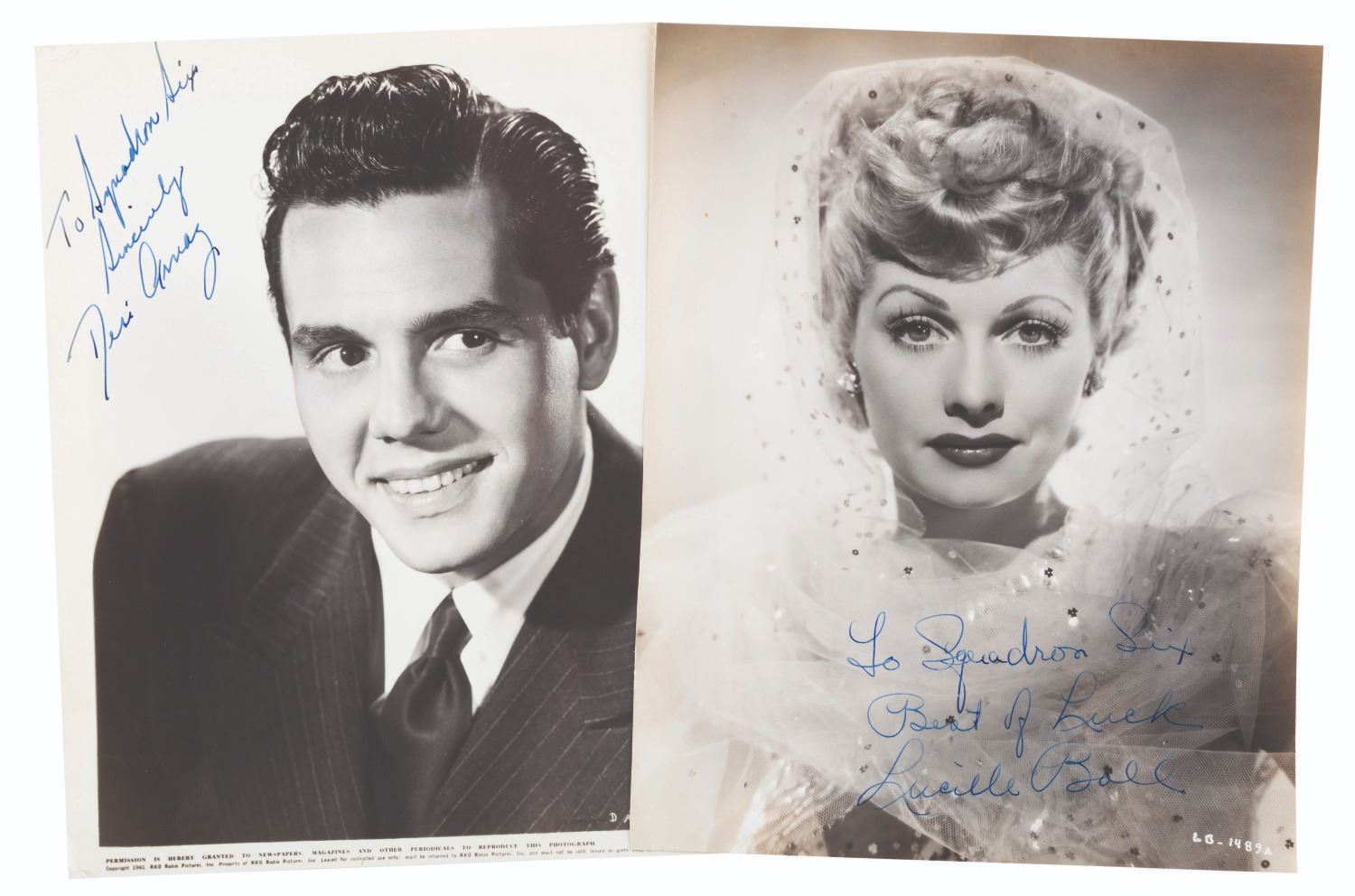 (Ball/Arnaz, 1940s) A pair of WWII-era headshots of married screen duo Lucille Ball and Desi Arnaz, each signed in ink with dedications to Squadron Six. Both measuring 7.5 x 9.5, the photos are in good condition with light edge wear, creasing, and light discoloration from age.