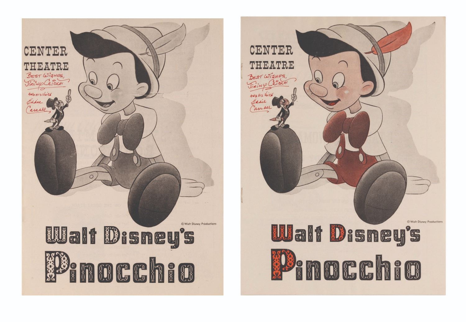 (Disney, 1940) A pair of grand opening programs from Walt Disney’s “Pinocchio” premiere at the Center Theatre in New York on February 7, 1940. Included are a black-and-white and a color program hand-signed in red ink to the top left of the covers by Eddie Caroll, the voice of Jiminy Cricket. Measuring 6.75" x 9.25" each, the programs are in very good condition with very light edge wear, smudges, very light creases, discoloration from age, and a 1.25" scratch on the cover of the black-and-white program.