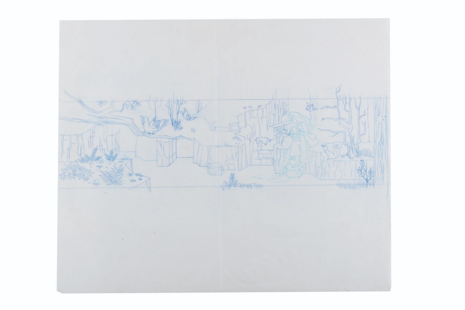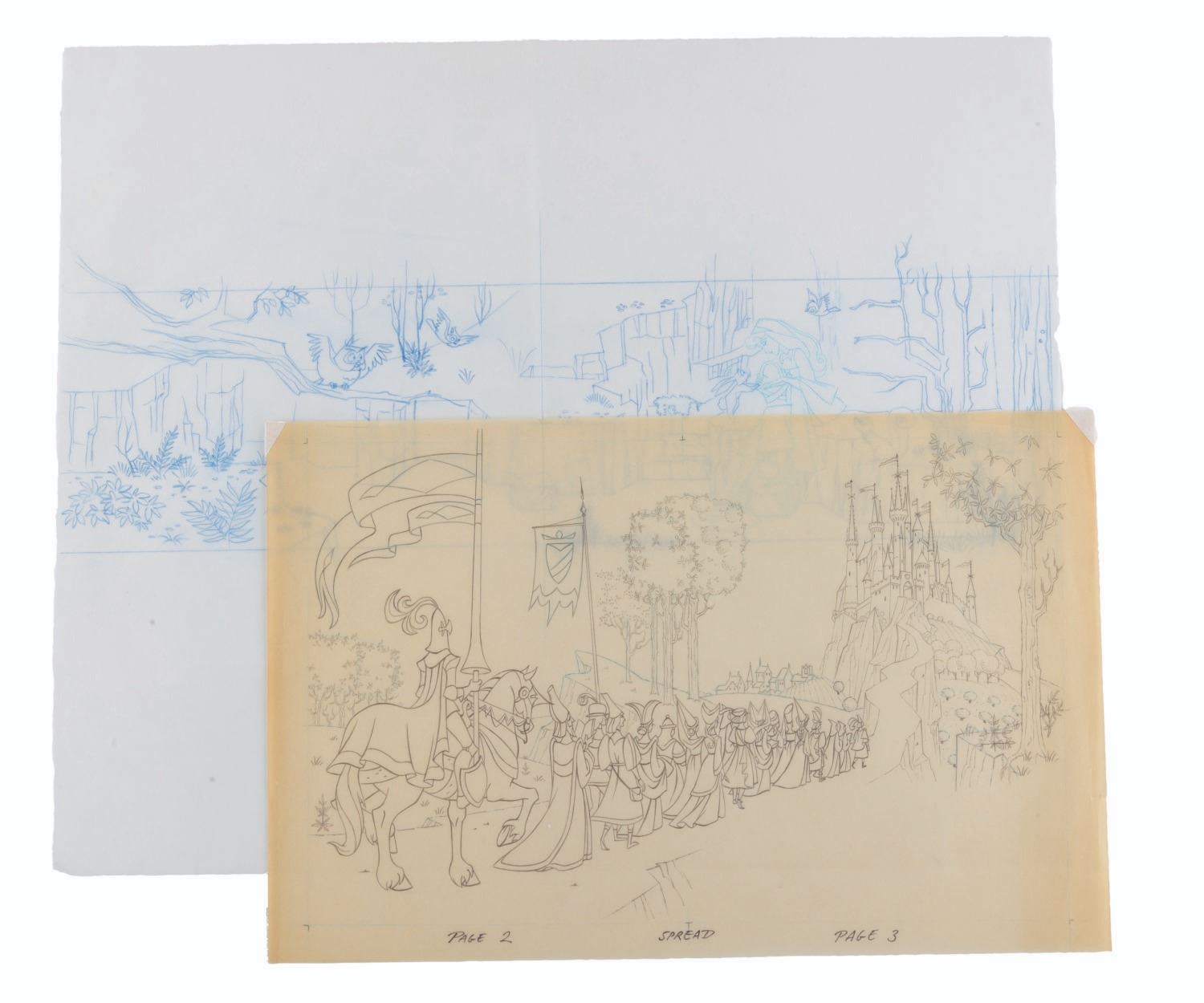 (Disney, 1986/95) Two original sketches for illustrations in Disney Press "Sleeping Beauty " storybooks, both attributed to artist Ric Gonzalez. One shows Princess Aurora’s subjects in procession to the castle, and the other shows Briar Rose by the forest river. Measuring 9 " x 14 " on paper and 5.5 " x 17 " on 14 " x 17 " vellum, the graphite and color pencil drawings are in very good condition, with browning to the paper of the 1986 drawing from age.