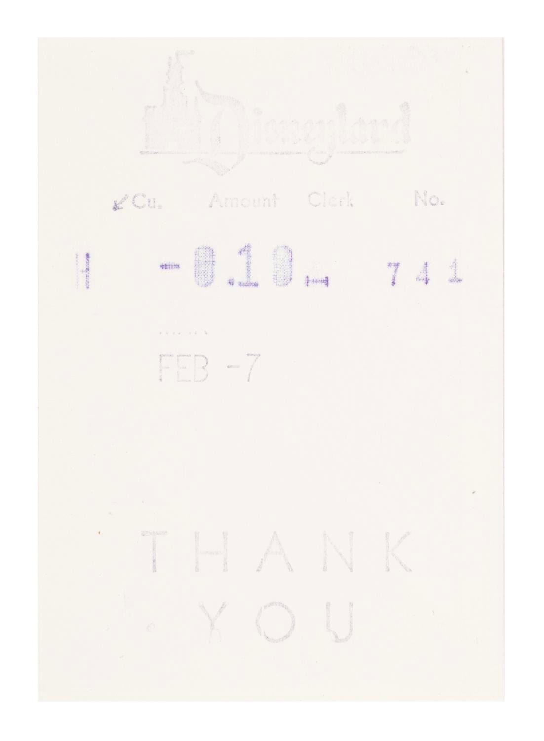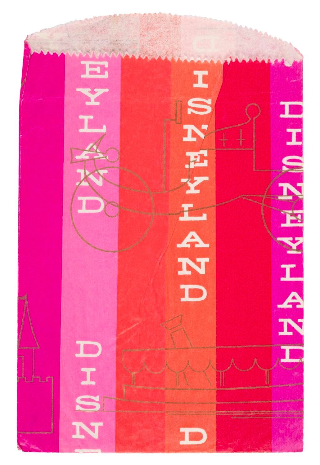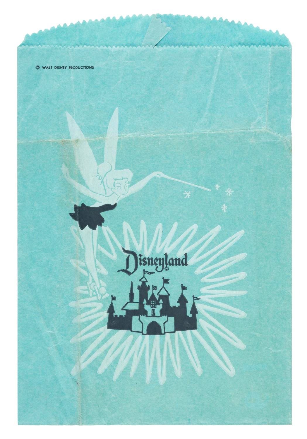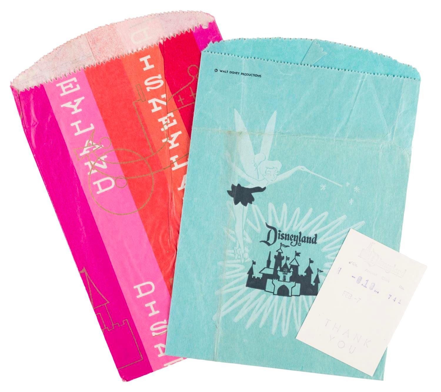 (Disneyland, 1950s-1960s) A pair of early shopping bags and an original receipt from Disneyland. Measuring from 2" x 3" to 5.5" x 8.5" each, the items are in good condition with folds and creasing, and the Tinker Bell bag exhibiting light soiling along the folds. The receipt is faded from age.