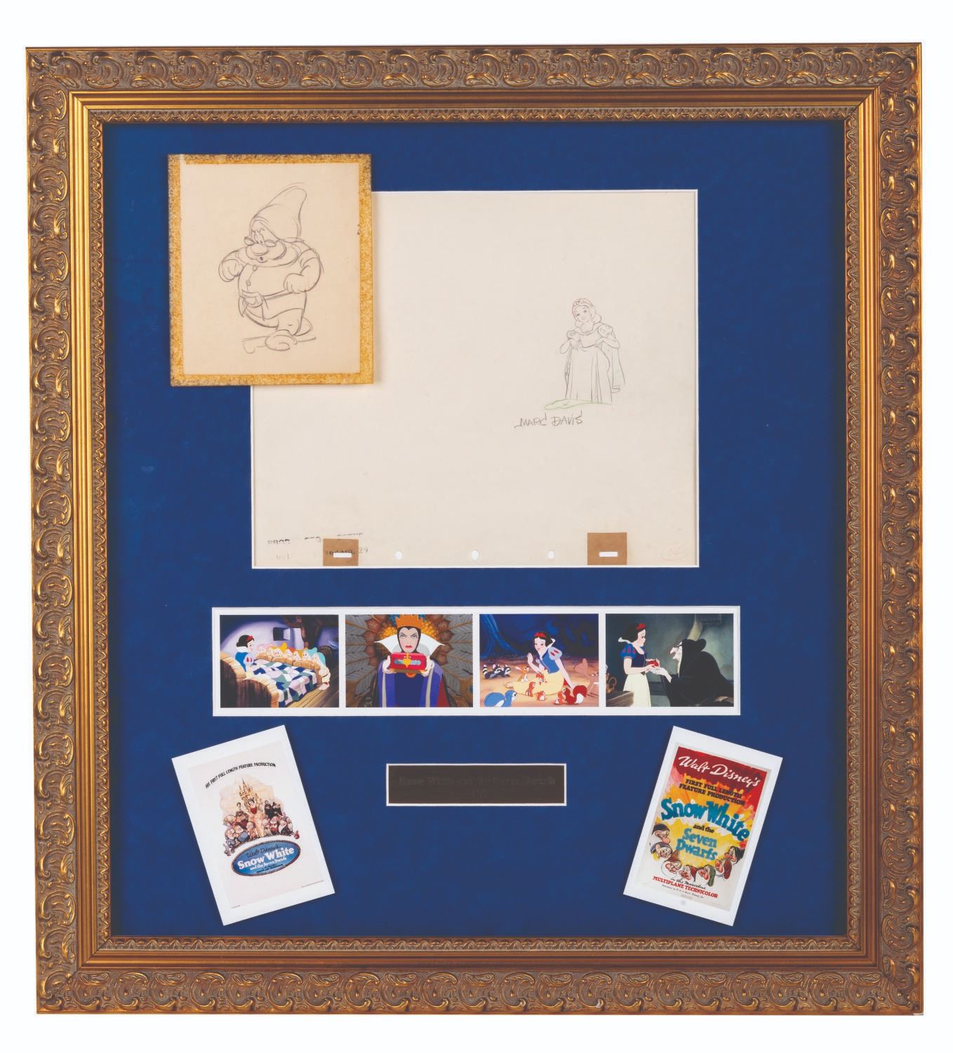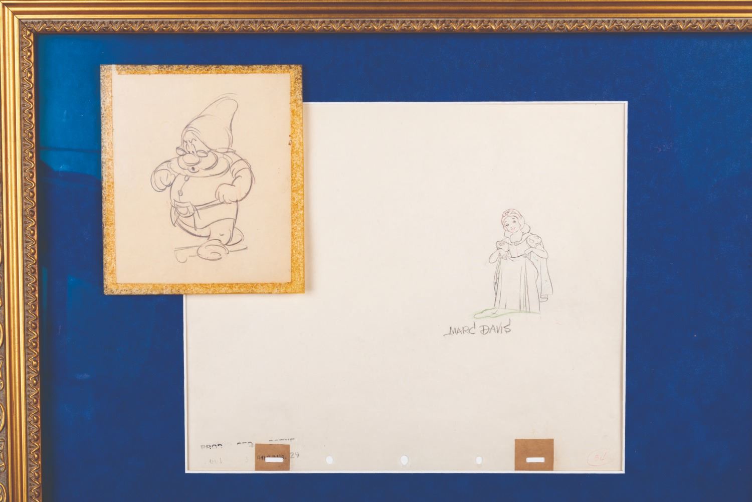 (Disney, 1937) A pair of original production drawings of Snow White and Doc from "Snow White and the Seven Dwarfs.” The Snow White drawing is signed by Disney Legend Marc Davis. Snow White has an image size of 3.5” x 3” on untrimmed 10” x 12” animation paper, and Doc has an image size of 4.5” x 2.75” on trimmed 6” x 5.25” paper. The entire framed and matted piece measures 23.25” x 25”. The graphite drawings display in very good to fine condition with light discoloration from age.