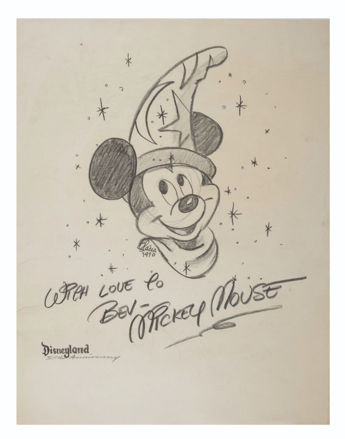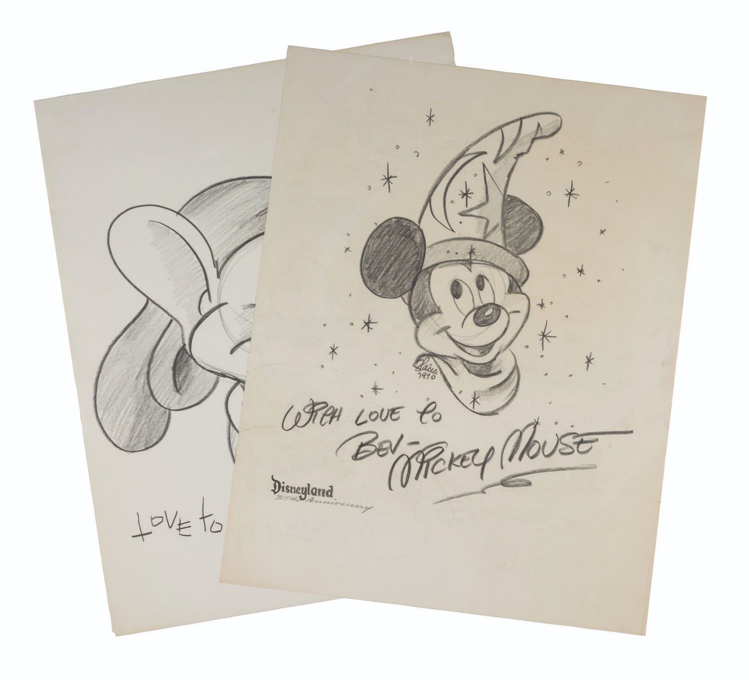(Disneyland, 1990) Two drawings of Sorcerer Mickey and Dopey, signed by Disneyland character artist Stacia Martin. The Sorcerer Mickey drawing is inscribed, "With love to Bev, Mickey Mouse" and says "Disneyland 35th Anniversary" in the bottom left corner. The Dopey drawing is inscribed, "Love to Irene - Dopey." Measuring 11" x 14" each, the drawings are in very good condition with several small stains and yellowing from age.