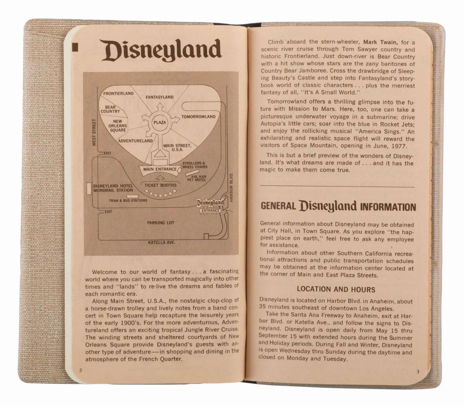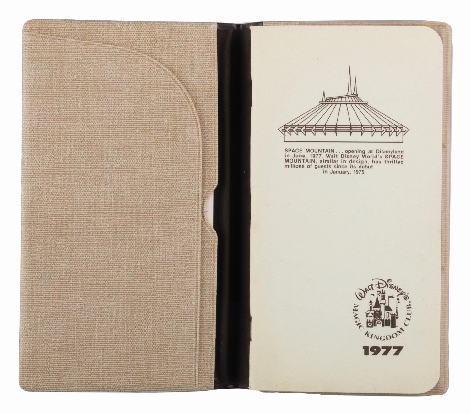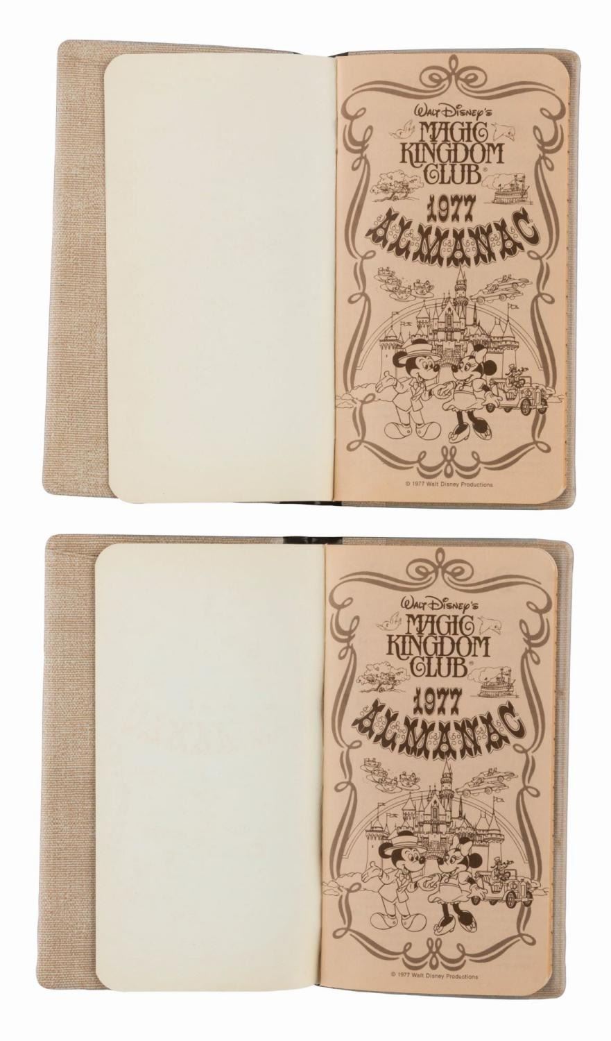 (Disney Parks, 1977) A pair of 1977 Walt Disney's Magic Kingdom Club almanacs featuring Space Mountain's exterior on the cover. The almanac contains a calendar and travel information for Disneyland and Walt Disney World, while the first page teases that Space Mountain opens at Disneyland in June 1977. Measuring 4.25" x 7" each, the almanacs are in fine condition.