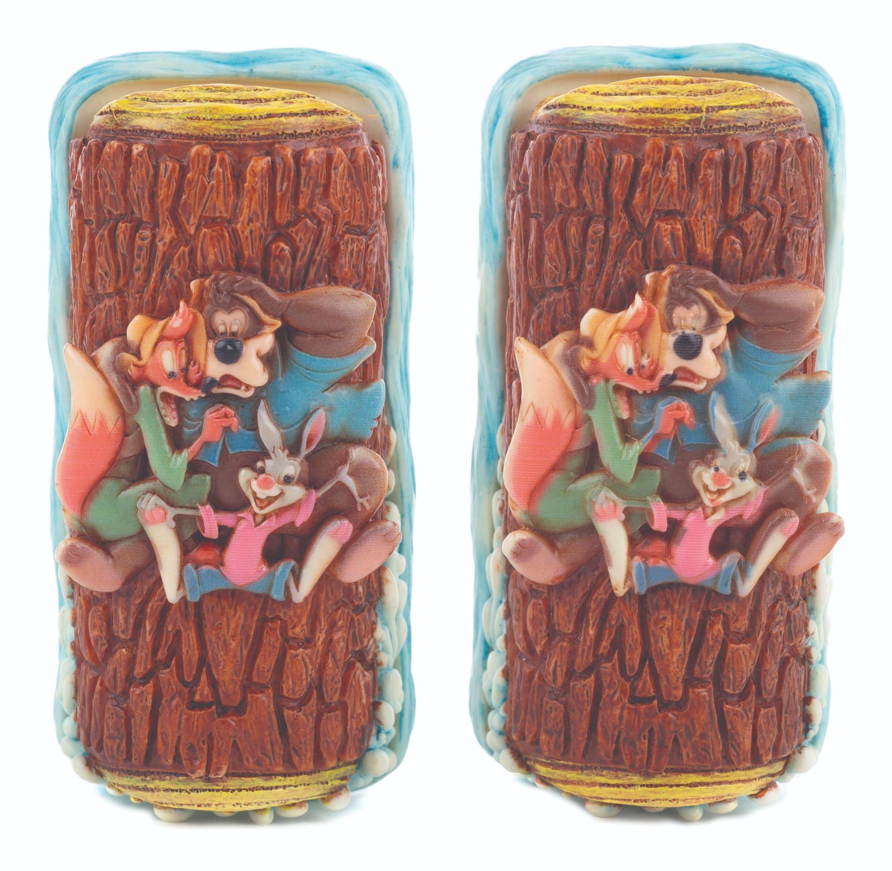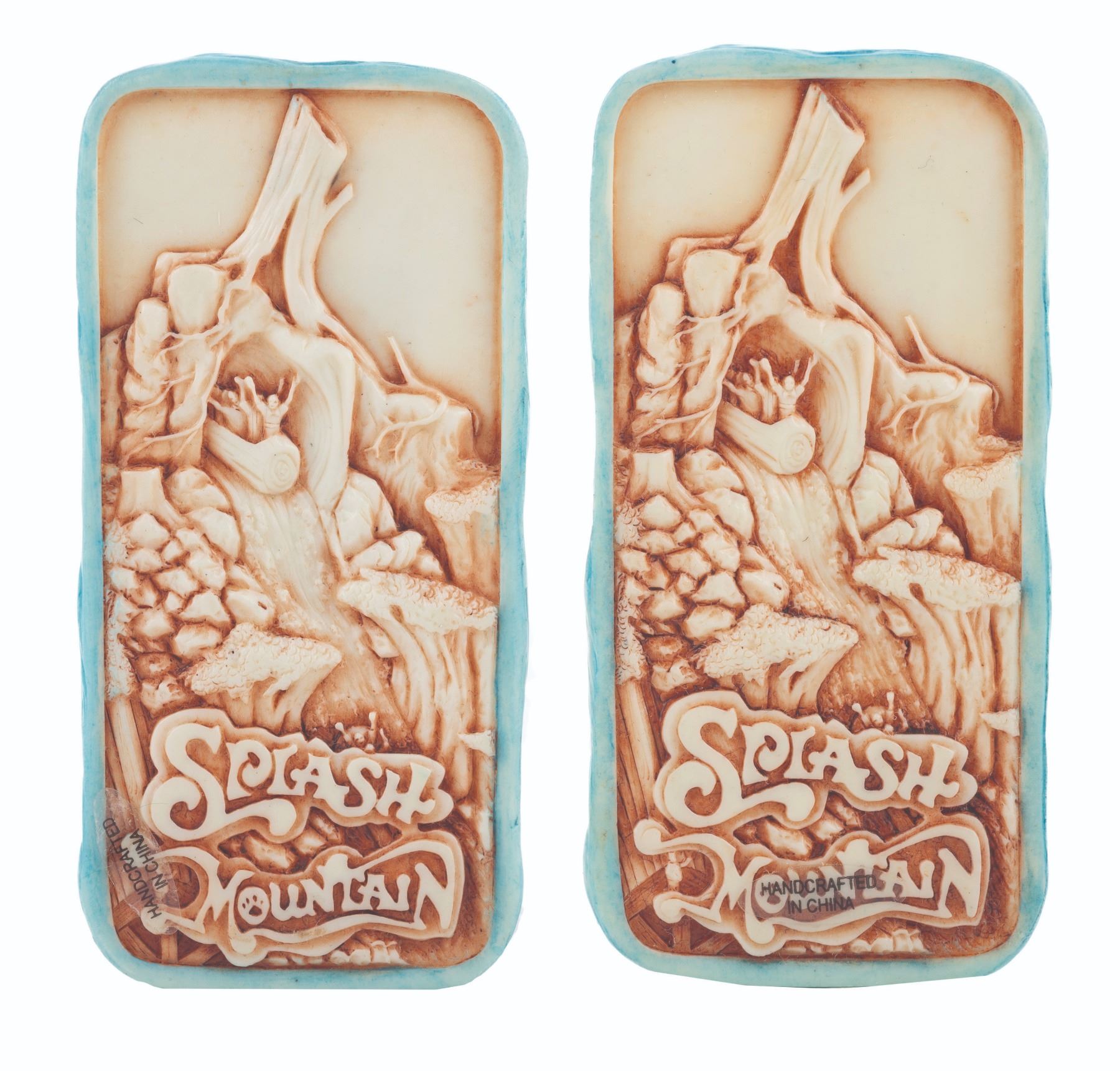 (Olszewski, 2000s) A pair of prototypes for the unreleased Splash Mountain Disney PokitPals. More than 50 themed styles of Disney PokitPals have been released from 2008 to 2016. This pair of Splash Mountain PokitPals trinket boxes was designed by Olszewski Studios and features Brer Rabbit, Brer Fox, and Brer Bear aboard a log. While a Splash Mountain Gallery of Light was released, these Splash Mountain PokitPals prototypes were manufactured and never released to the public. Measuring 1.75"x3.25"x1.25", each magnetic resin box is in fine condition with their Art of Disney Theme Parks boxes.