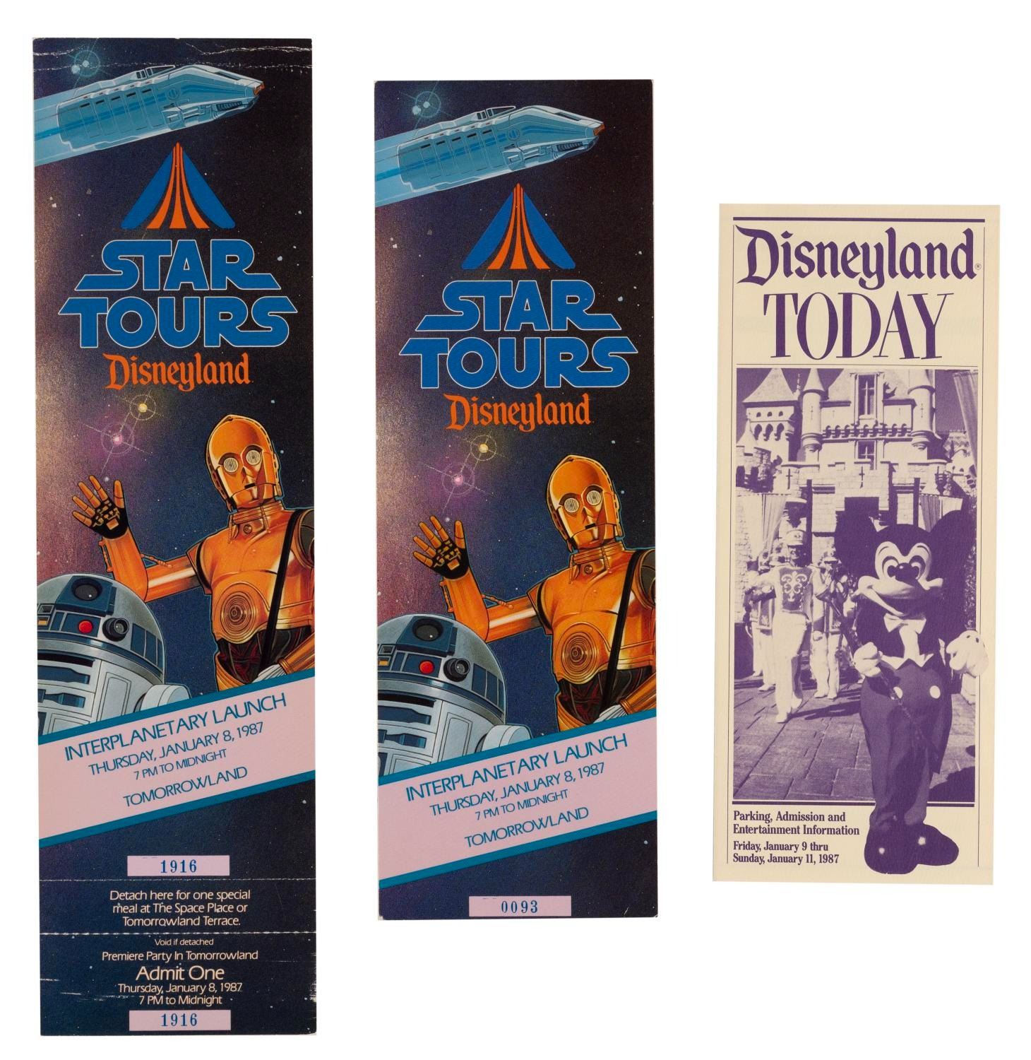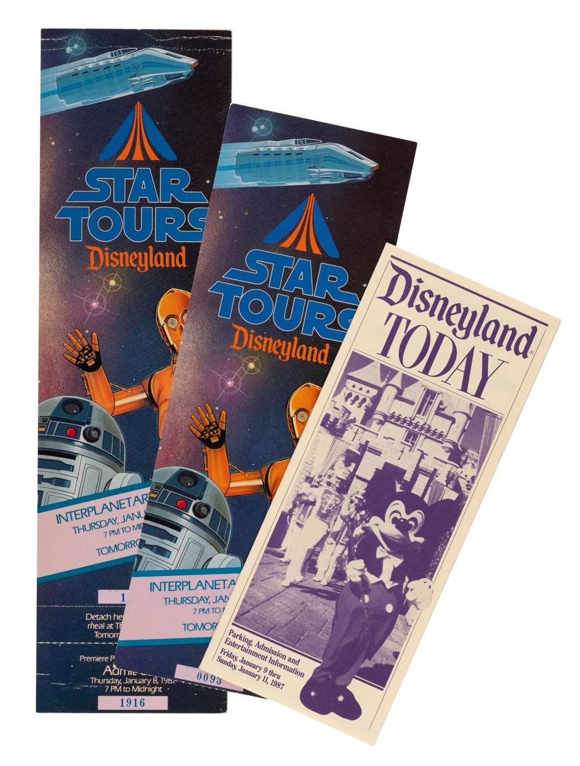 (Disneyland, 1987) A pair of Star Tours premiere passports numbered 0093 and 1916 and a Disneyland Today guide for January 9-11, 1987. Measuring 3.5" x 10.5", ticket 0093 is in very good condition with light creasing from wear, a small bend on the bottom right corner, and missing its stubs from use. Measuring 3.5" x 12.5", ticket 1916 is unused and in good condition with creases at the top and scratches at the bottom. The 3.5" x 8.5" guide is in fine condition.