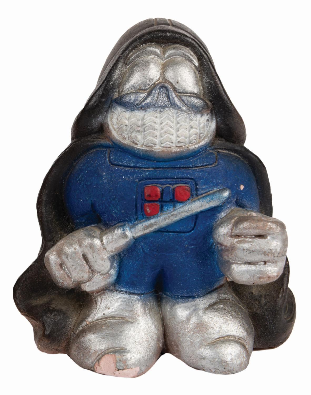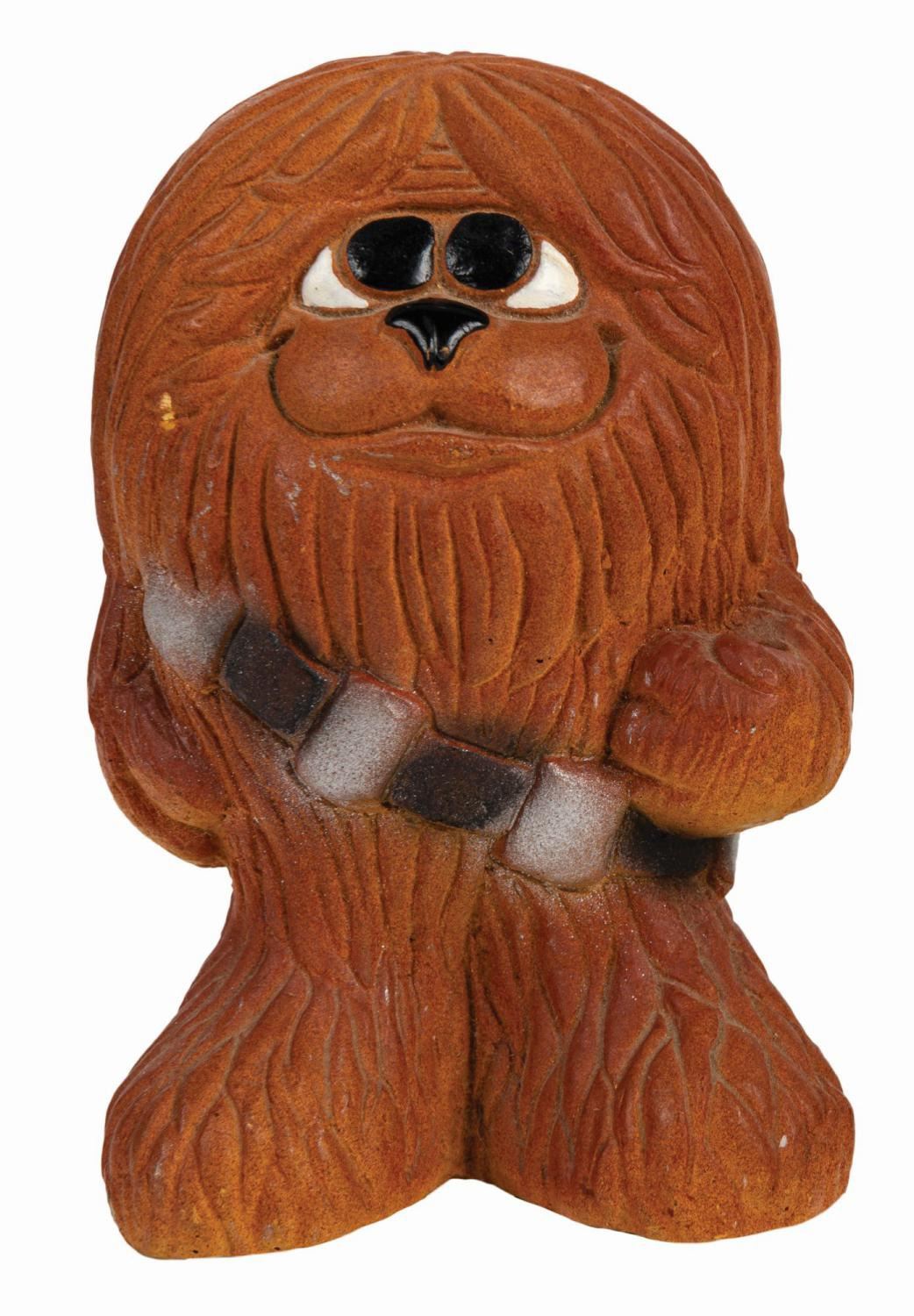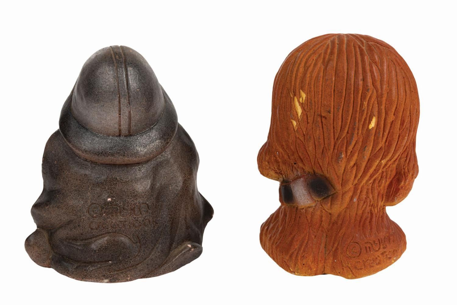 (Star Wars, 1977) A pair of rare Chewbacca and Darth Vader unlicensed chalkware figures. The figures were produced by Mylo Creations of Inglewood, California, during the Star Wars craze that engulfed the nation during the 1970s. Measuring approximately 4.5" tall and 4.5 in diameter, the vintage 1970s hand-painted figures with their "Mylo Creations '77" backstamp display in very good condition despite minor wear and a small chip on the foot of the Darth Vader figure.