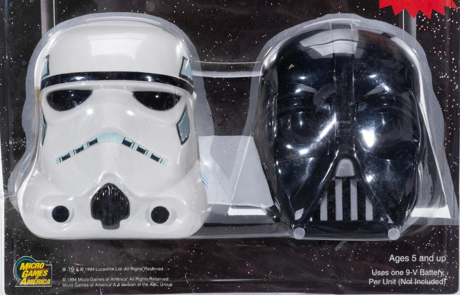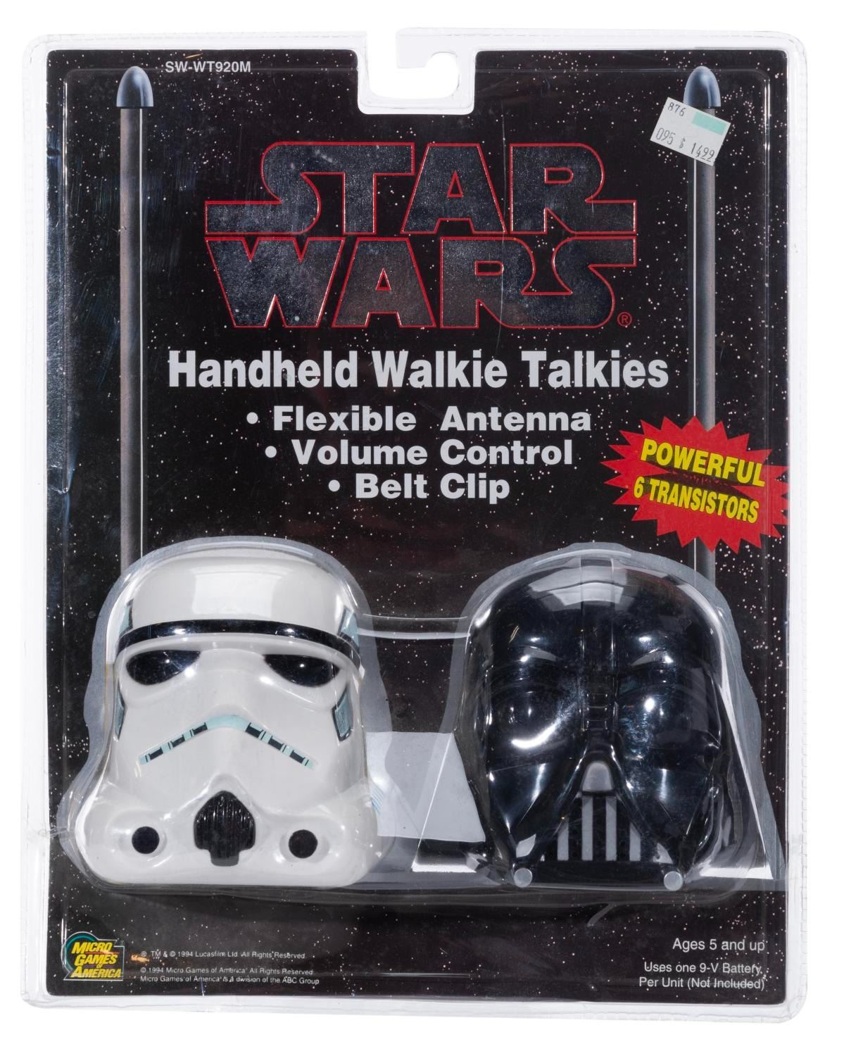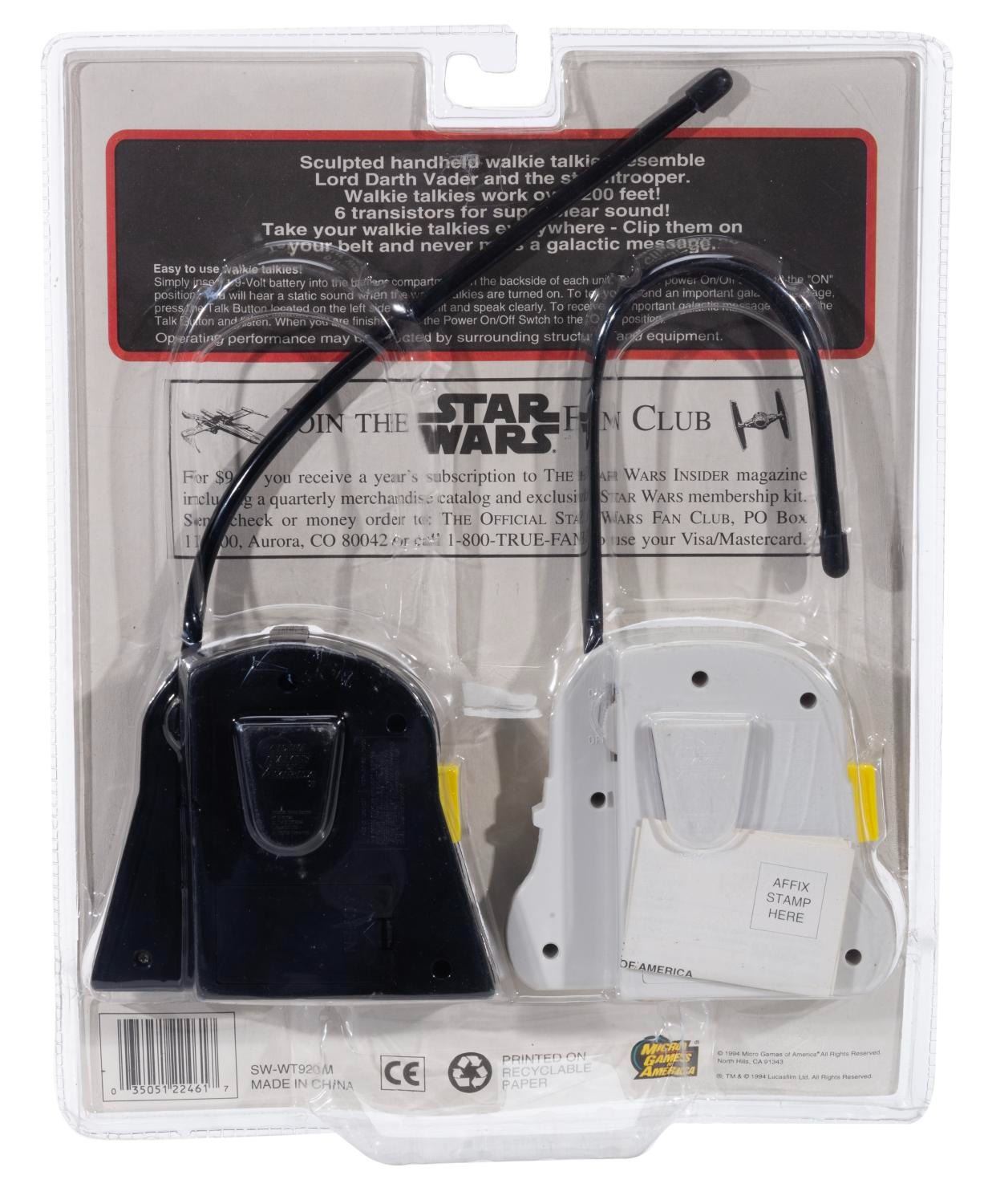 (Lucasfilm Ltd., 1994) A pair of Star Wars Handheld Walkie Talkies featuring Darth Vader and a Stormtrooper from the original Star Wars Trilogy. Measuring 11” x 14”, the walkie talkies are presumed in fine condition, sealed in the original good condition packaging.