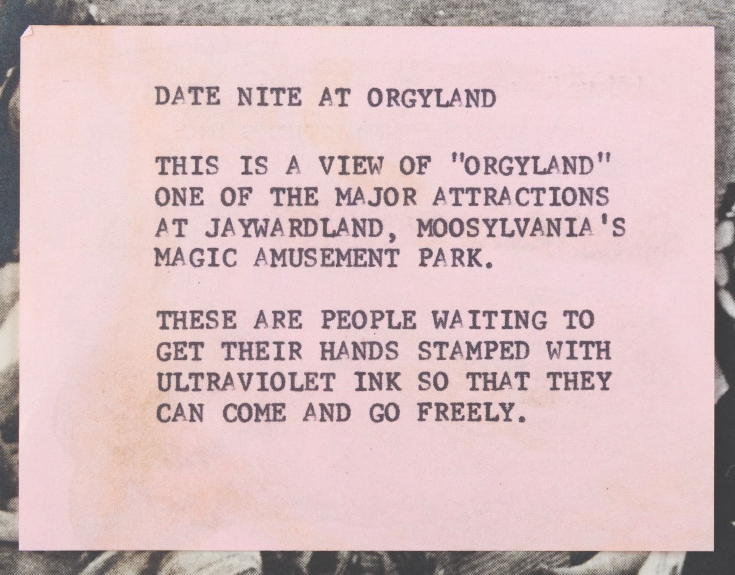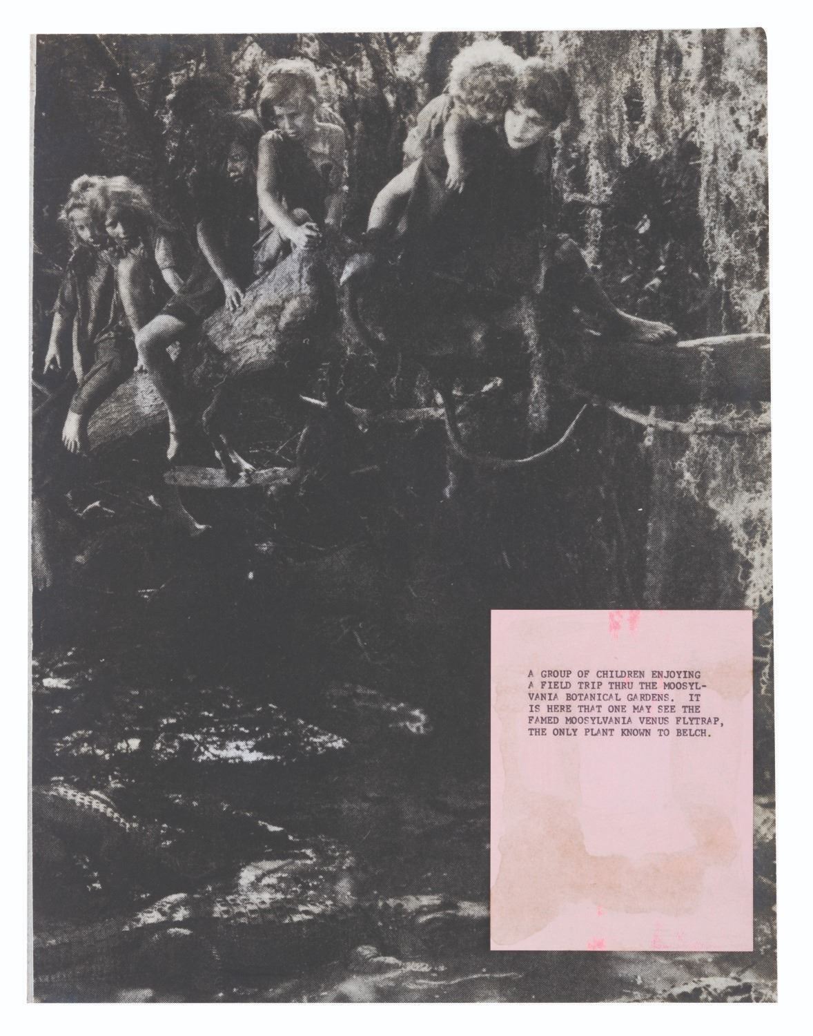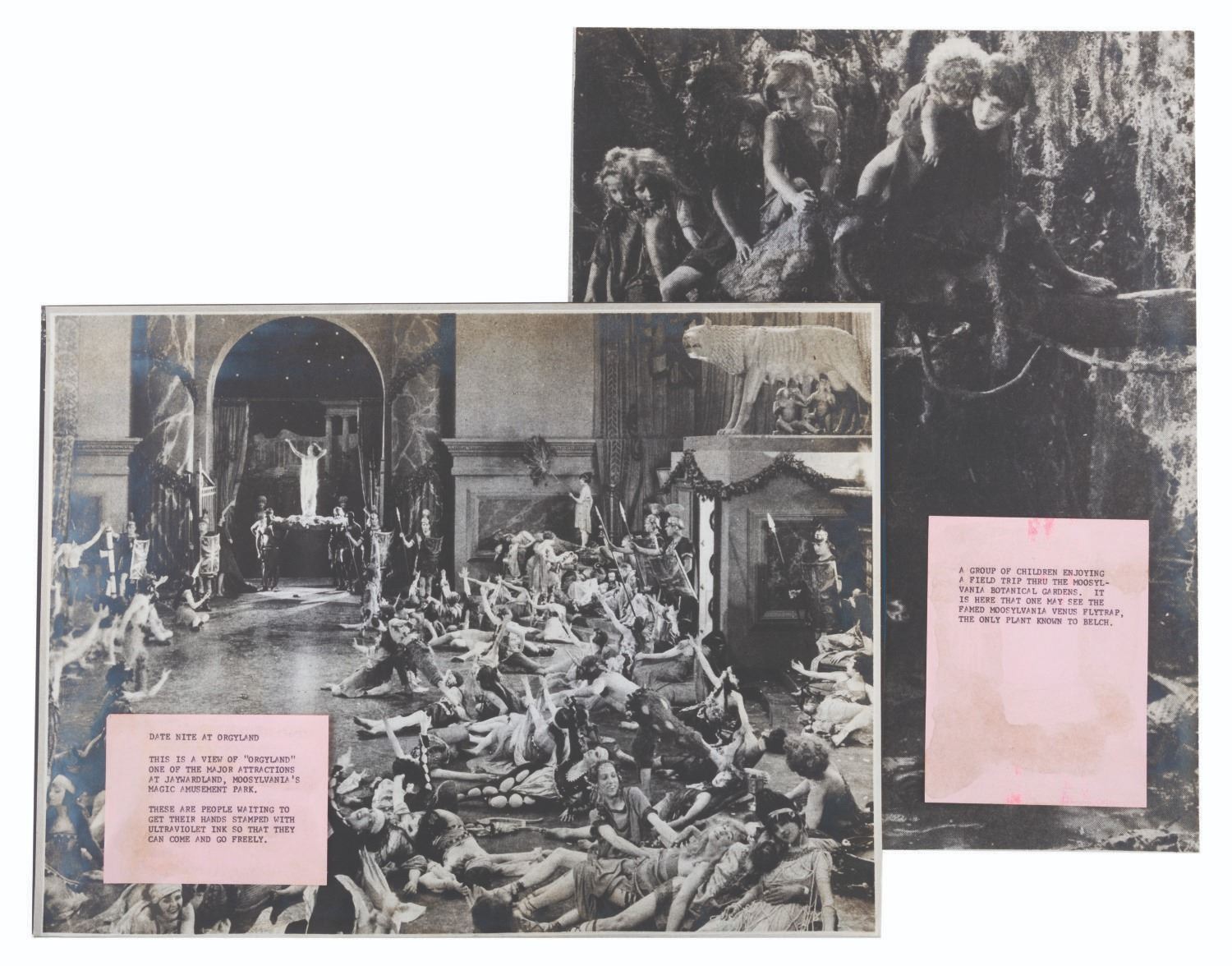 (Ward, 1962) A pair of photos from the “Statehood for Moosylvania” campaign. In the style of his later “Fractured Flickers” series, Ward repurposed stills from classic silent films with humorous captions saying they depict Moosylvania’s JayWardLand amusement park and botanical gardens. The photos mounted to matte board measure 12” x 16”, displaying in very good condition with light discoloration from age. The typed labels are detached, measuring 3.25” x 4.25” and 5.5” x 4.25”, in good condition with light discoloration.