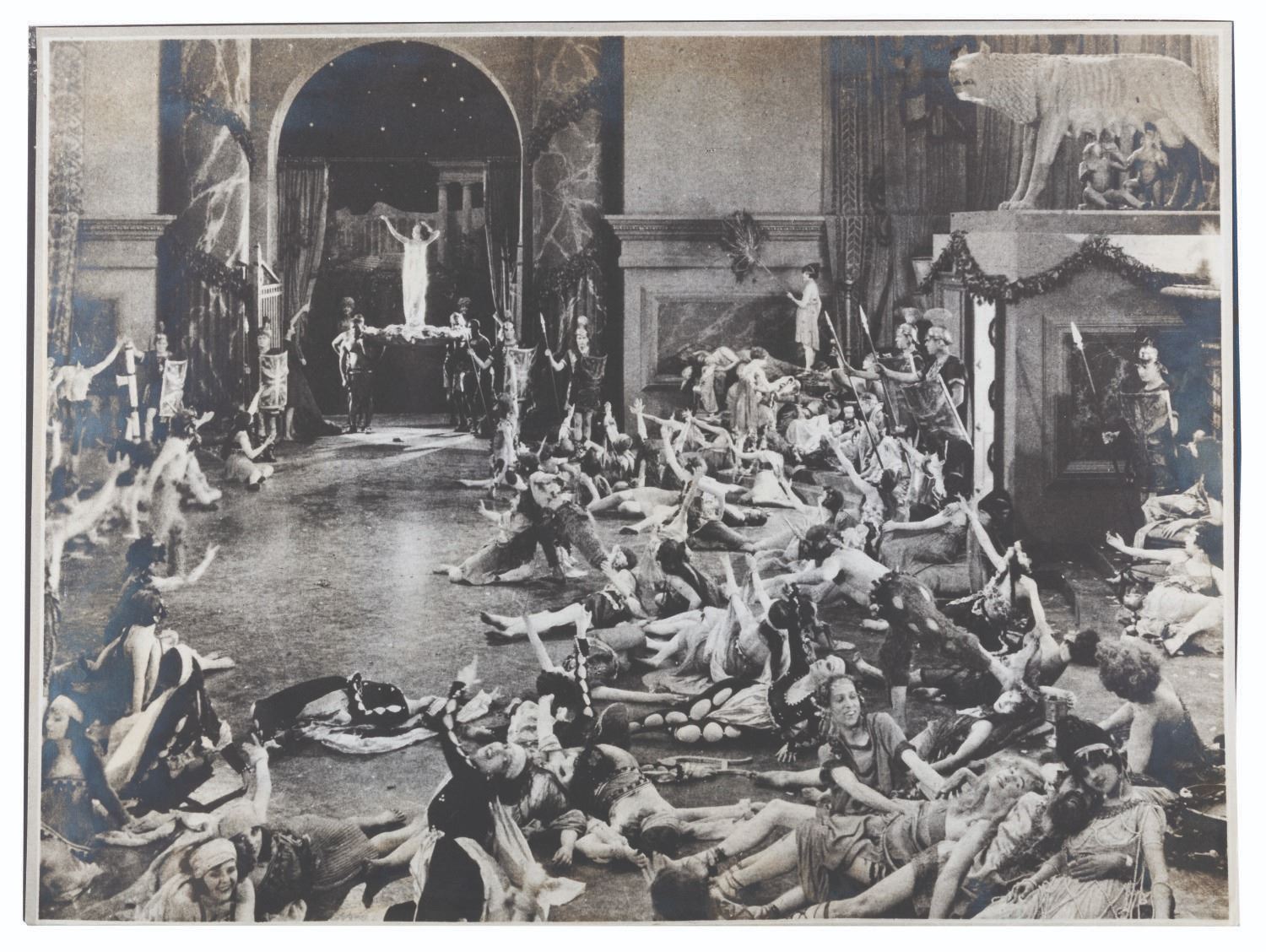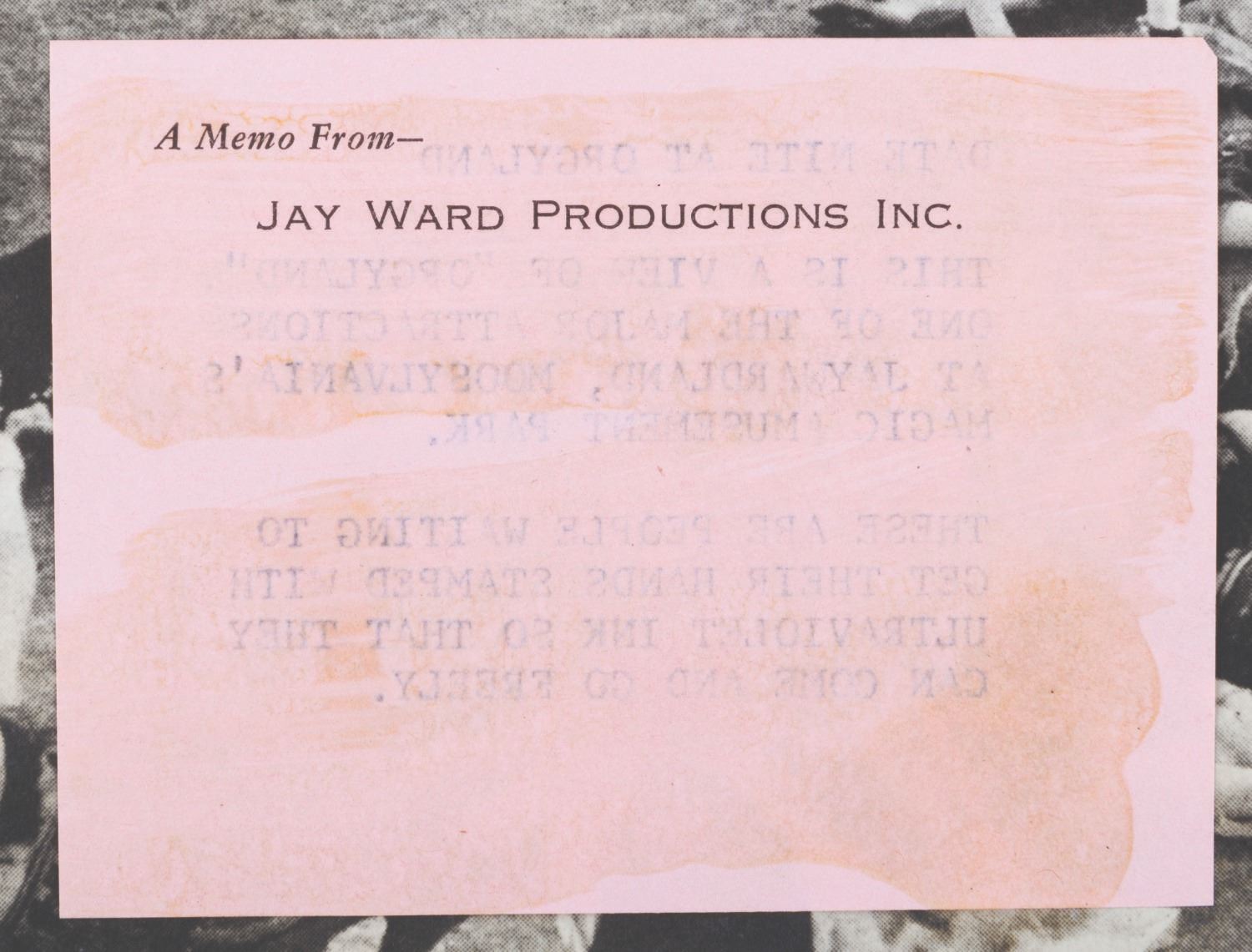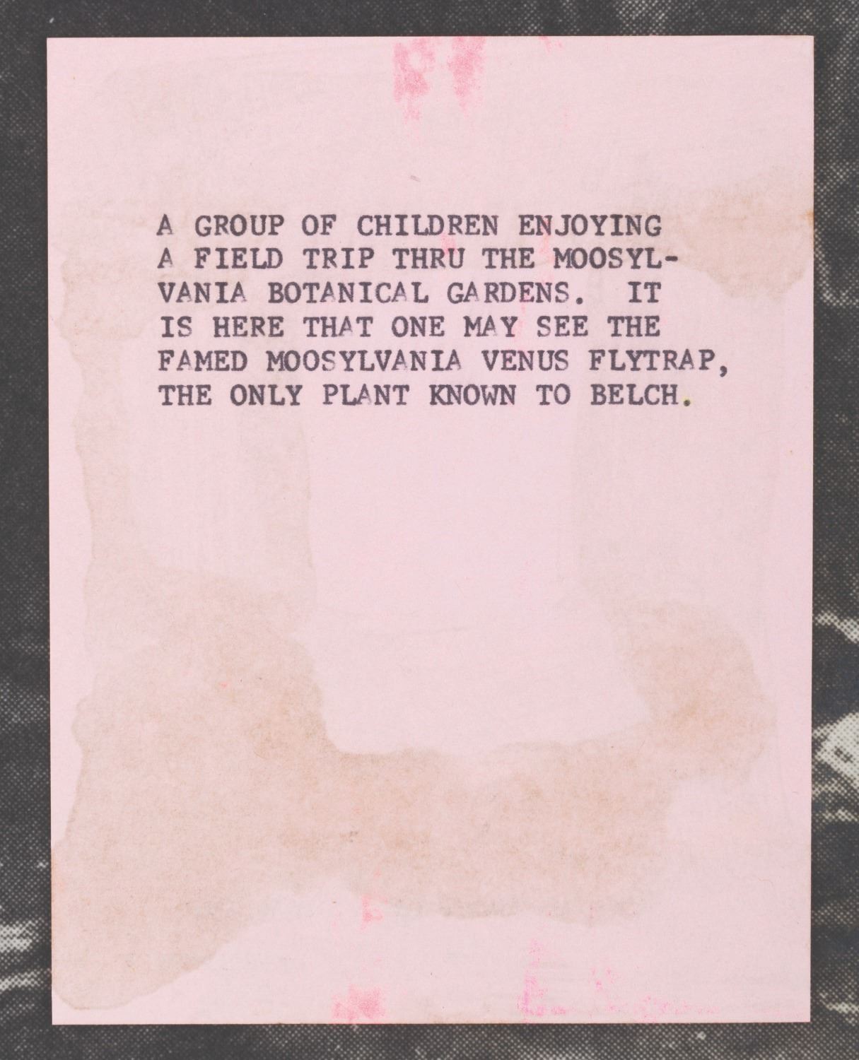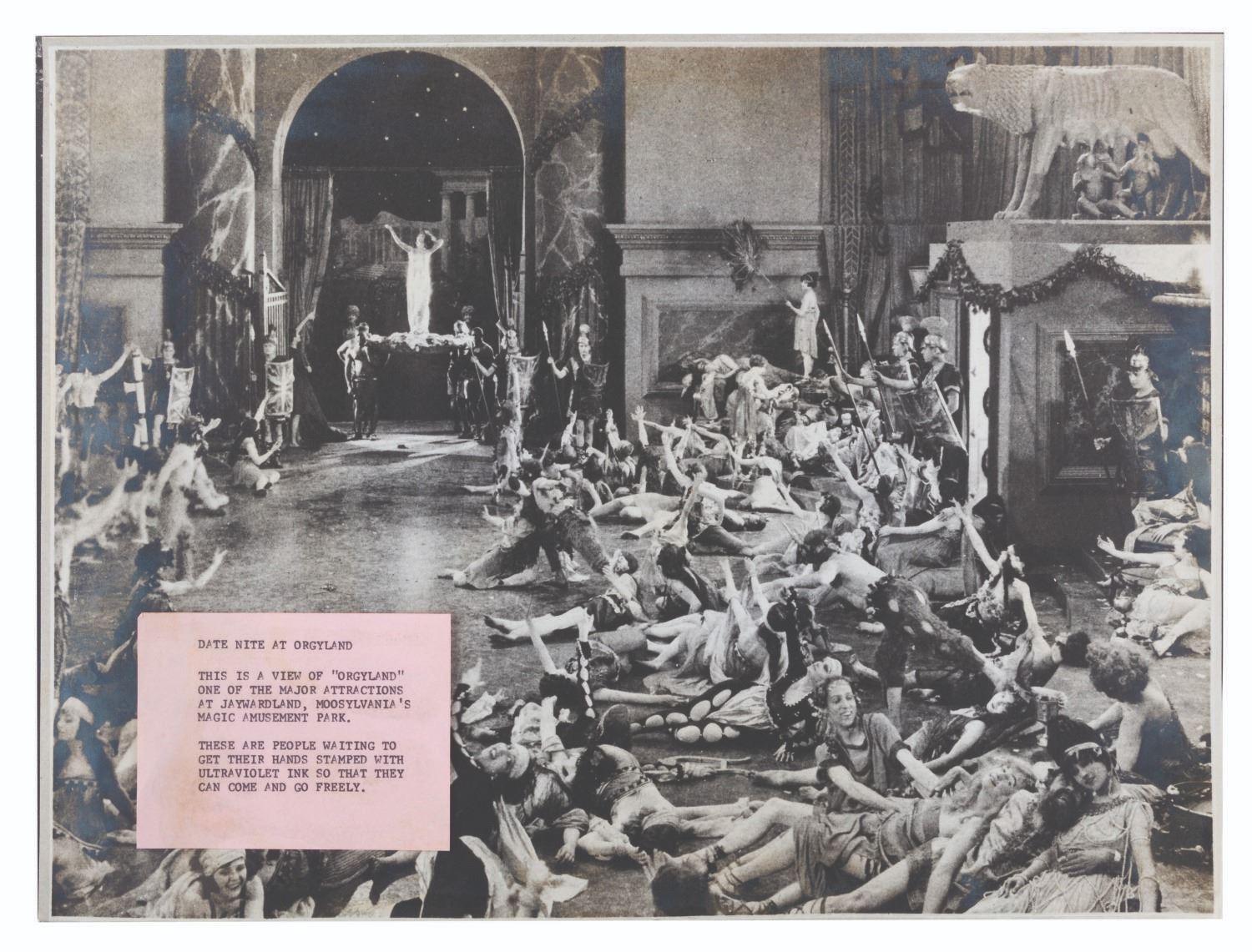 (Ward, 1962) A pair of photos from the “Statehood for Moosylvania” campaign. In the style of his later “Fractured Flickers” series, Ward repurposed stills from classic silent films with humorous captions saying they depict Moosylvania’s JayWardLand amusement park and botanical gardens. The photos mounted to matte board measure 12” x 16”, displaying in very good condition with light discoloration from age. The typed labels are detached, measuring 3.25” x 4.25” and 5.5” x 4.25”, in good condition with light discoloration.