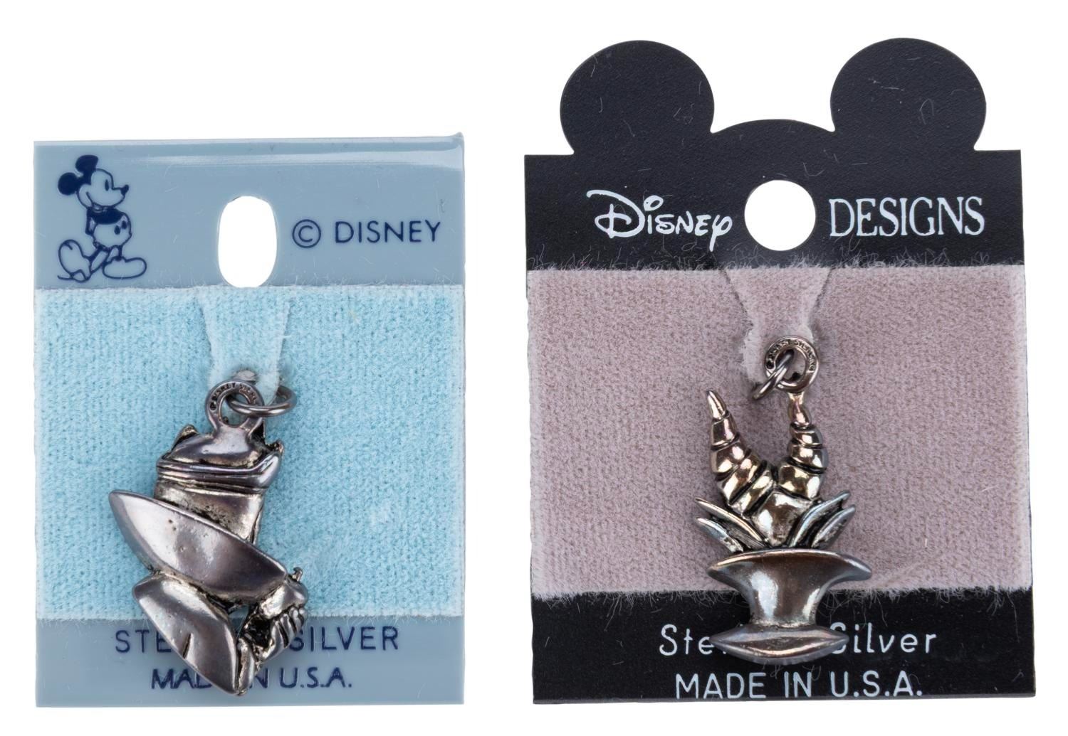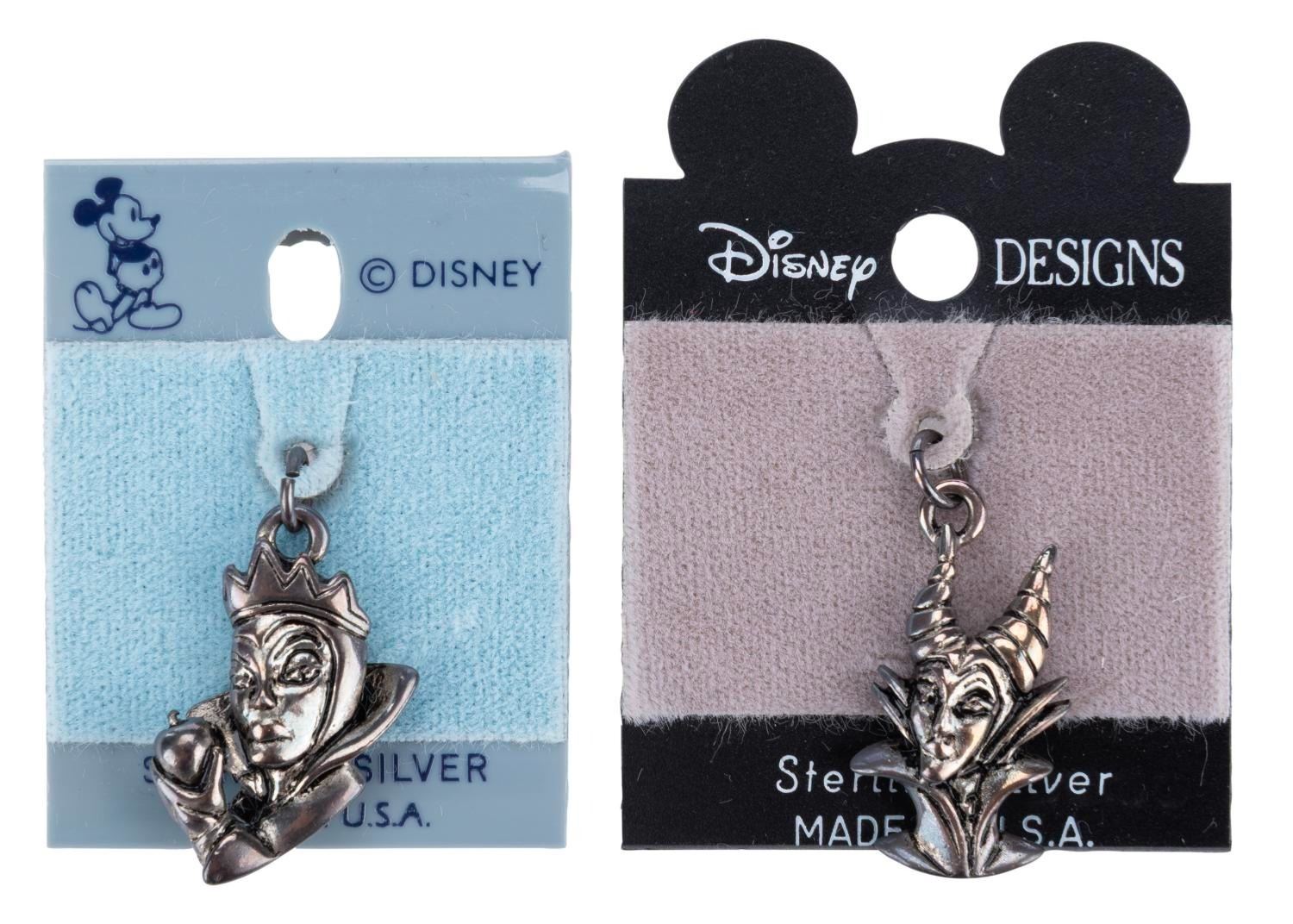(Disney, 1980s-90s) Two sterling silver charms of Maleficent and Snow White’s Evil Queen. Each measuring 1" long, the charms are in fine condition on the original cards.