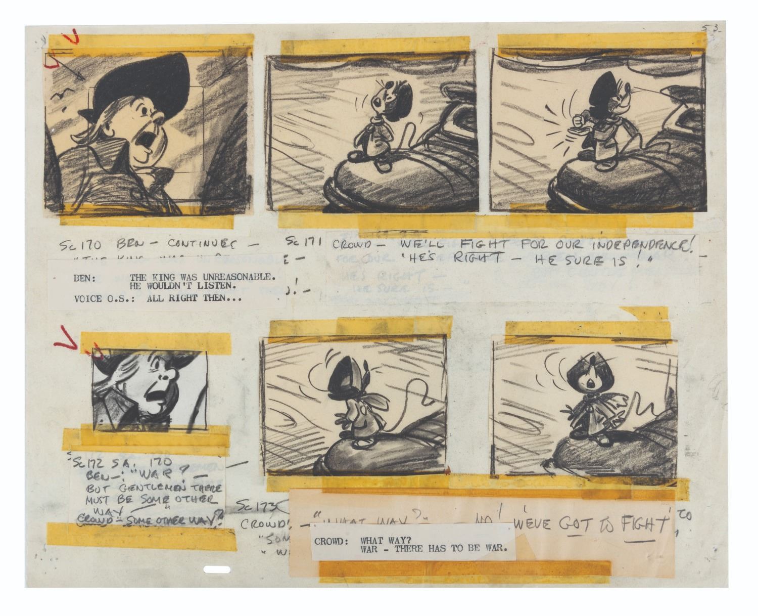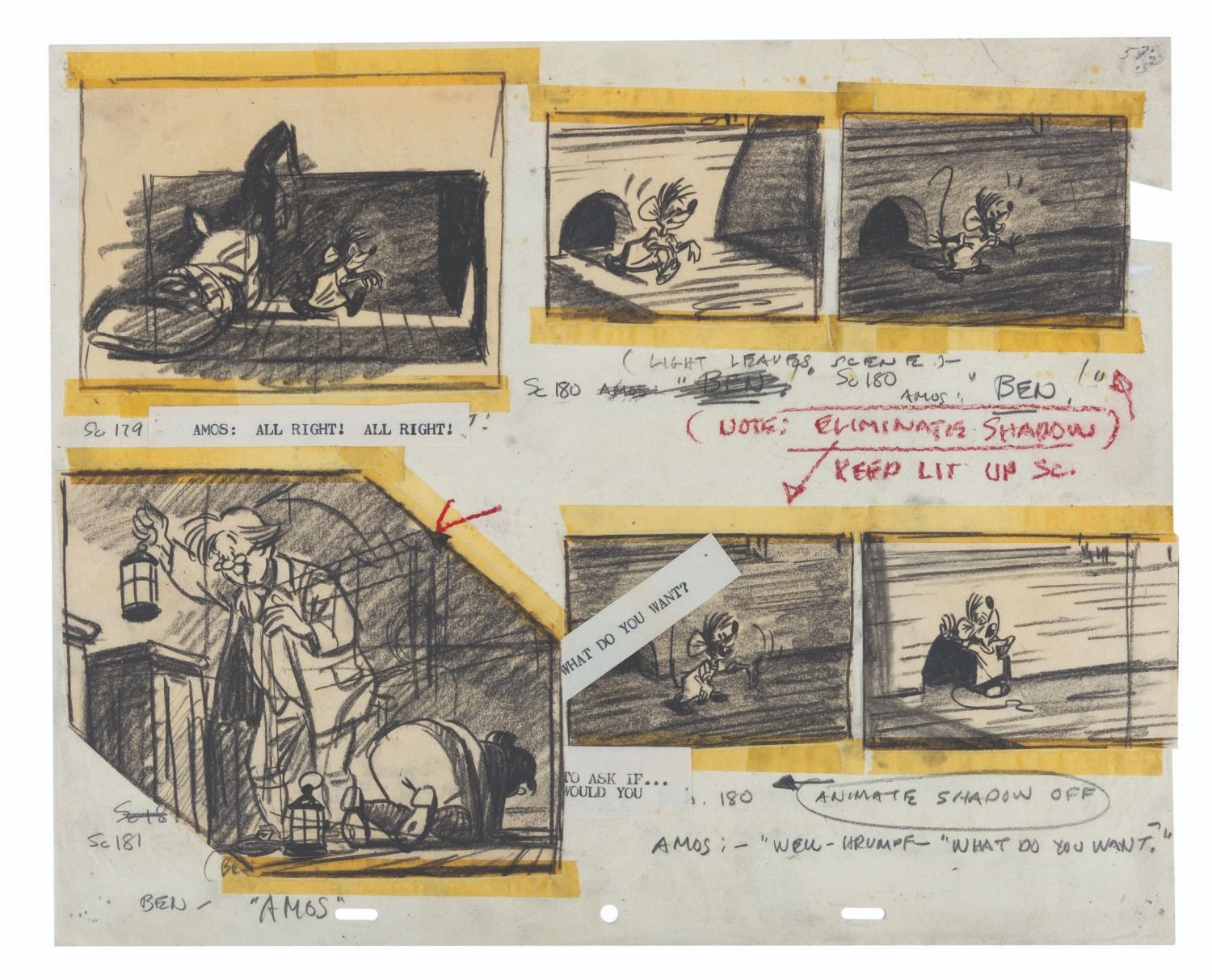 (Disney, 1953) A pair of storyboard pages from "Ben and Me" used by the camera department to plan out camera moves. Accomplished in graphite with one photostat image, each storyboard page measures 15.5" x 12.5" and is in good condition with expected pinholes, yellowing, and wear from production use.