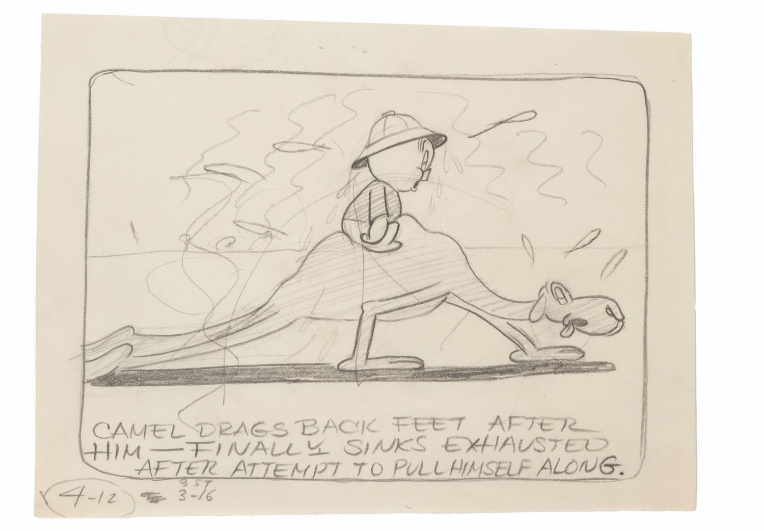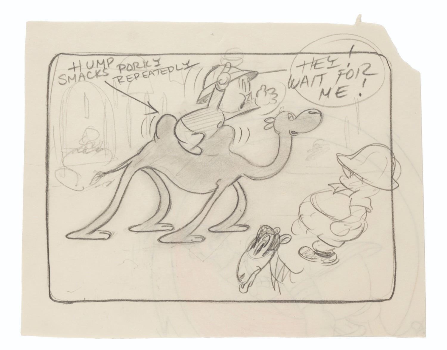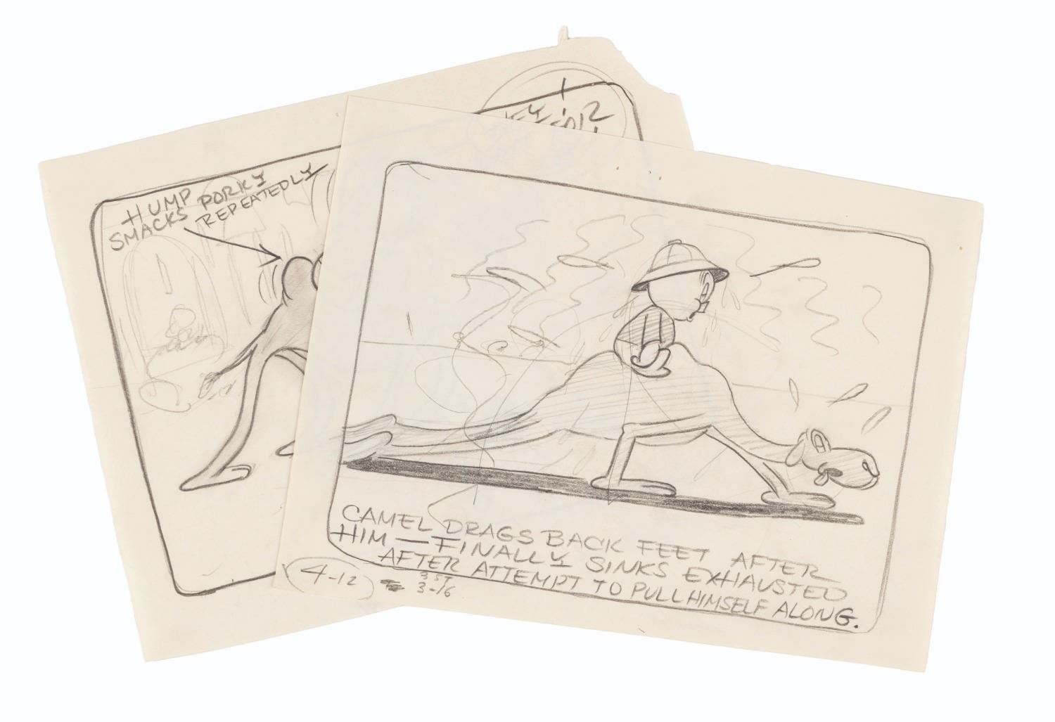 (Schlesinger, 1938) A pair of storyboard panels from the Bob Clampett-directed Looney Tunes short “Porky in Egypt.” Accomplished in graphite, the panels feature Porky on Bumpy the Camel and a production drawing from the Looney Tunes short, “Injun Trouble” on the reverse side of one of the pages. This was not uncommon, as Warner Bros. would save money by cutting old production drawings into quarters for the backs to be used as storyboard paper. Ranging in size from 5.75” x 8” to 6.25” x 8”, the panels display in very good production-used condition with creases, pinholes with some corner tears, and light discoloration from age.
