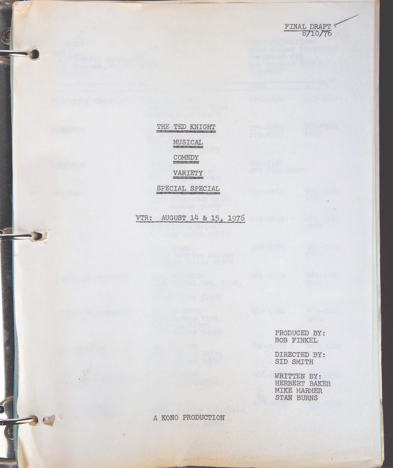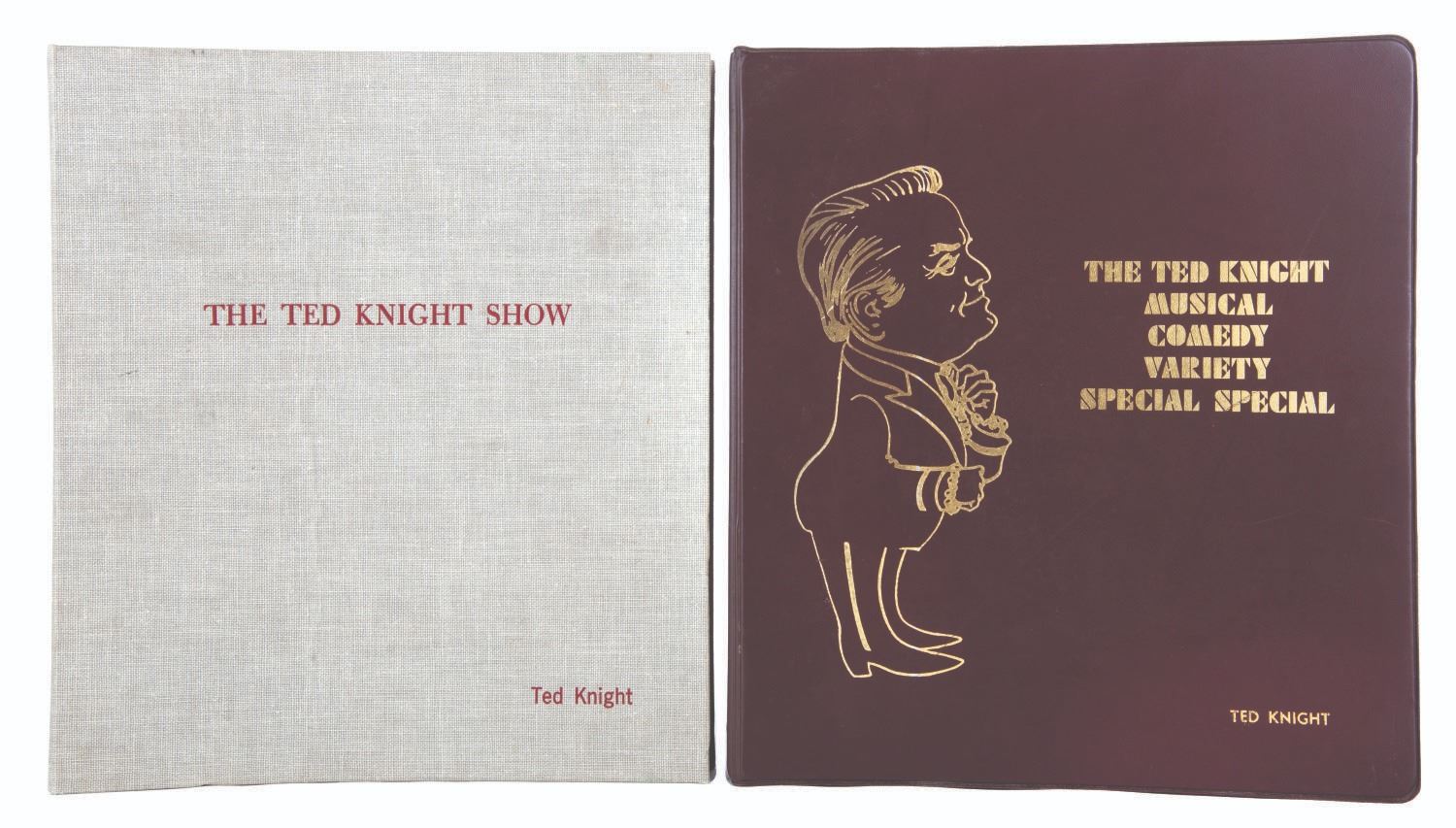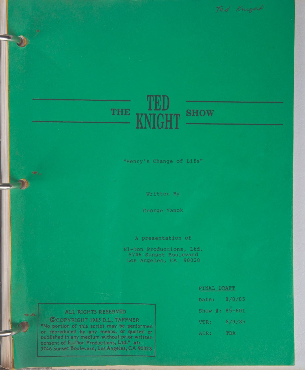 (Ted Knight, 1976-1985) A Pair of scripts for television productions starring Ted Knight."The Ted Knight Musical Comedy Variety Special Special" from 1976 starring Knight with Ed Asner, Rue McClanahan, and more."Henry's Change of Life" is an episode of"The Ted Knight Show" dated August 8, 1985. Knight's name handwritten on the cover (most likely by a secretary) indicates this was his personal copy of the script. Further, both scripts are bound in custom 3-ring binders with Knight's name, indicating they were kept by him personally. Measuring 2.5"x11.5"x10", both scripts are in good production used condition, with a slight vertical crease visible in the Ted Knight Show binder front.