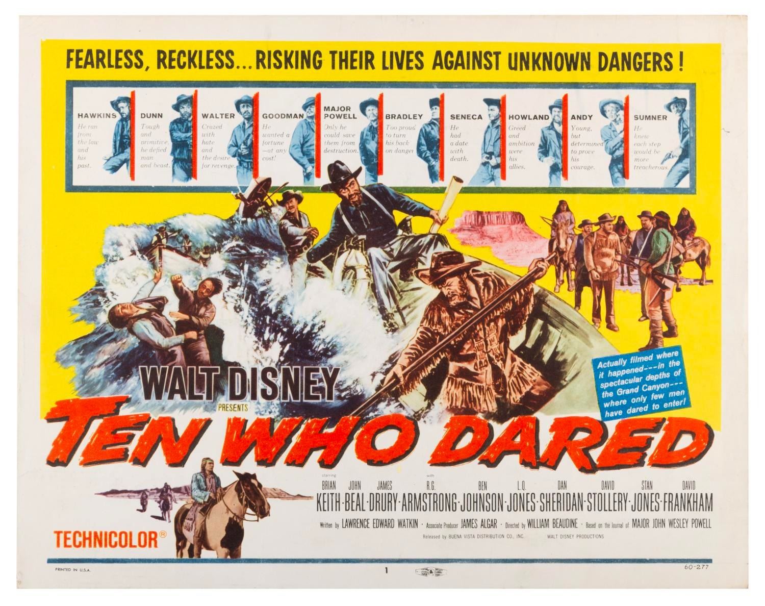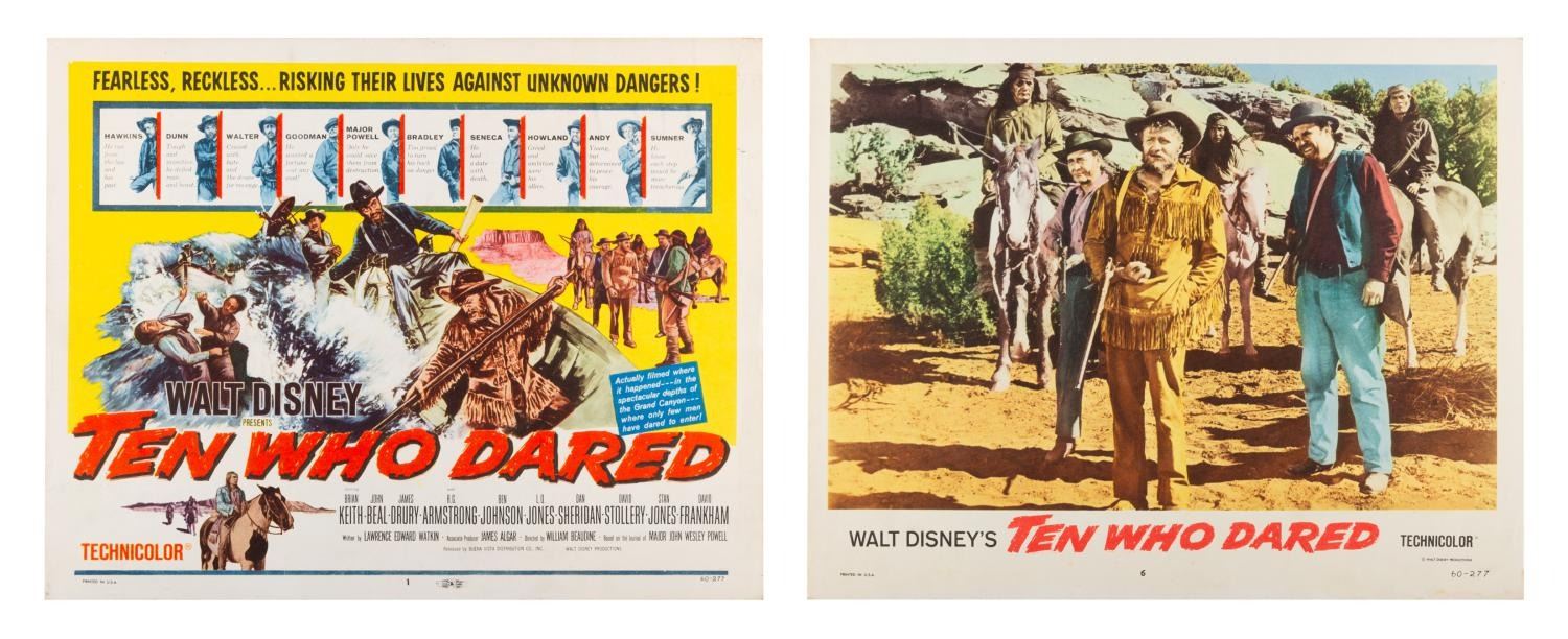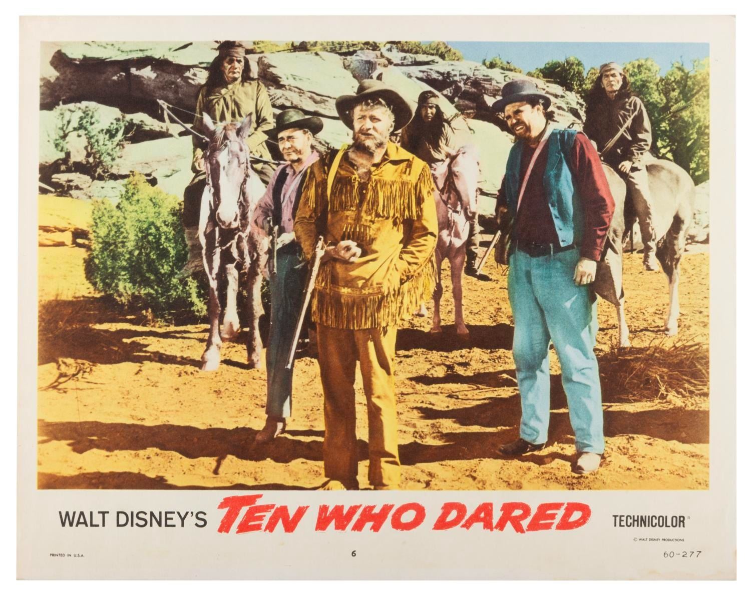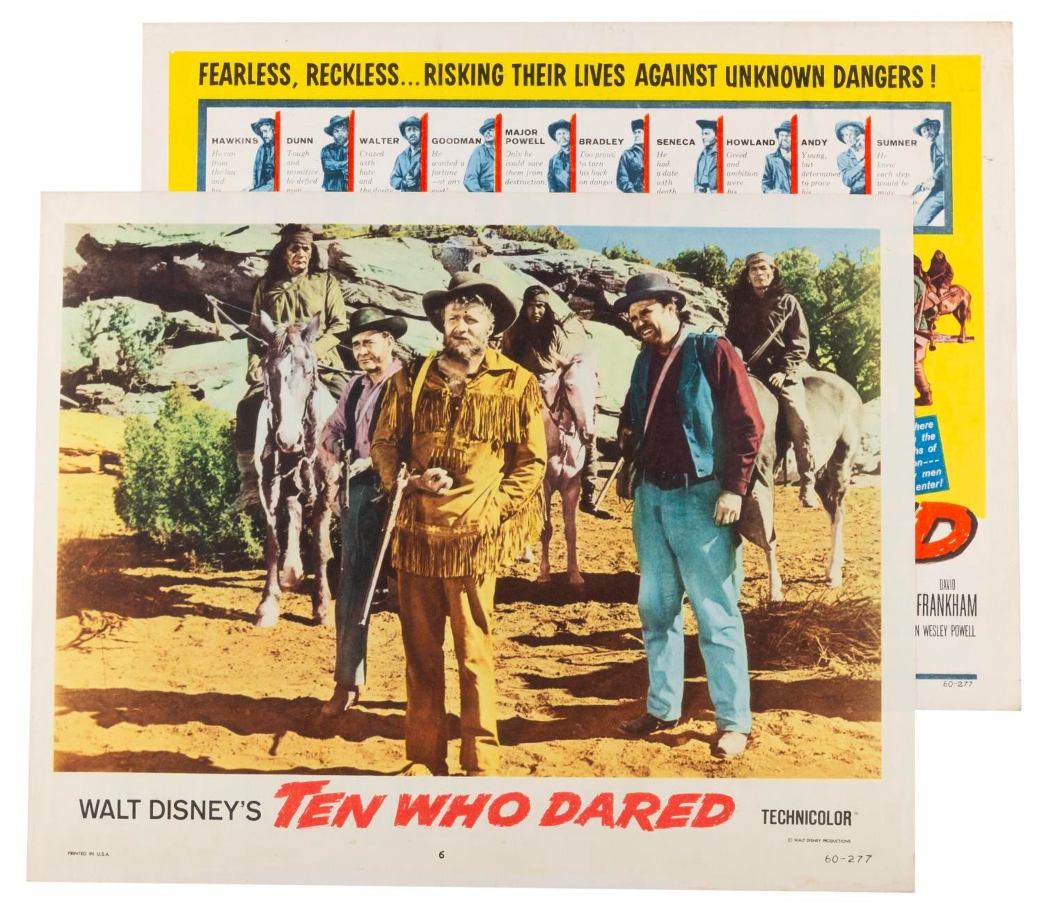 (DIsney, 1960) Two lobby cards from the Disney western film "Ten Who Dared " starring Brian Keith. Measuring 11 " x 14 " the lobby cards are in good condition with light edge wear.