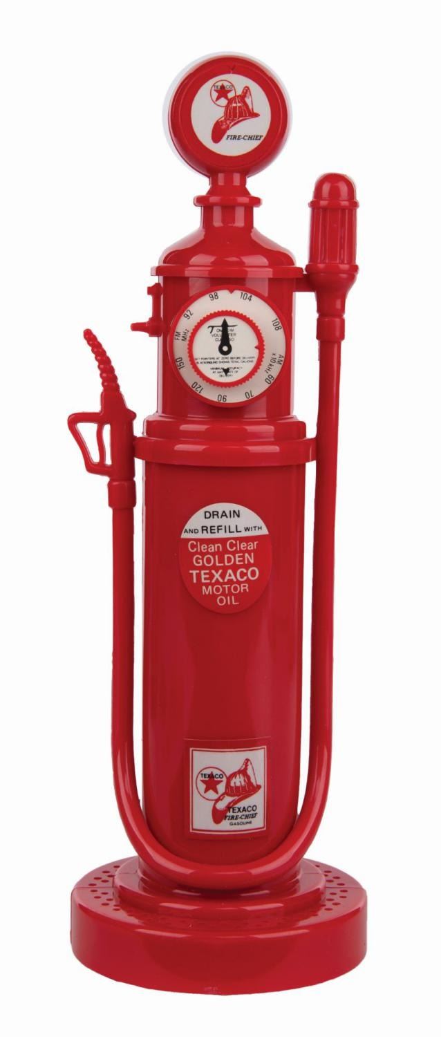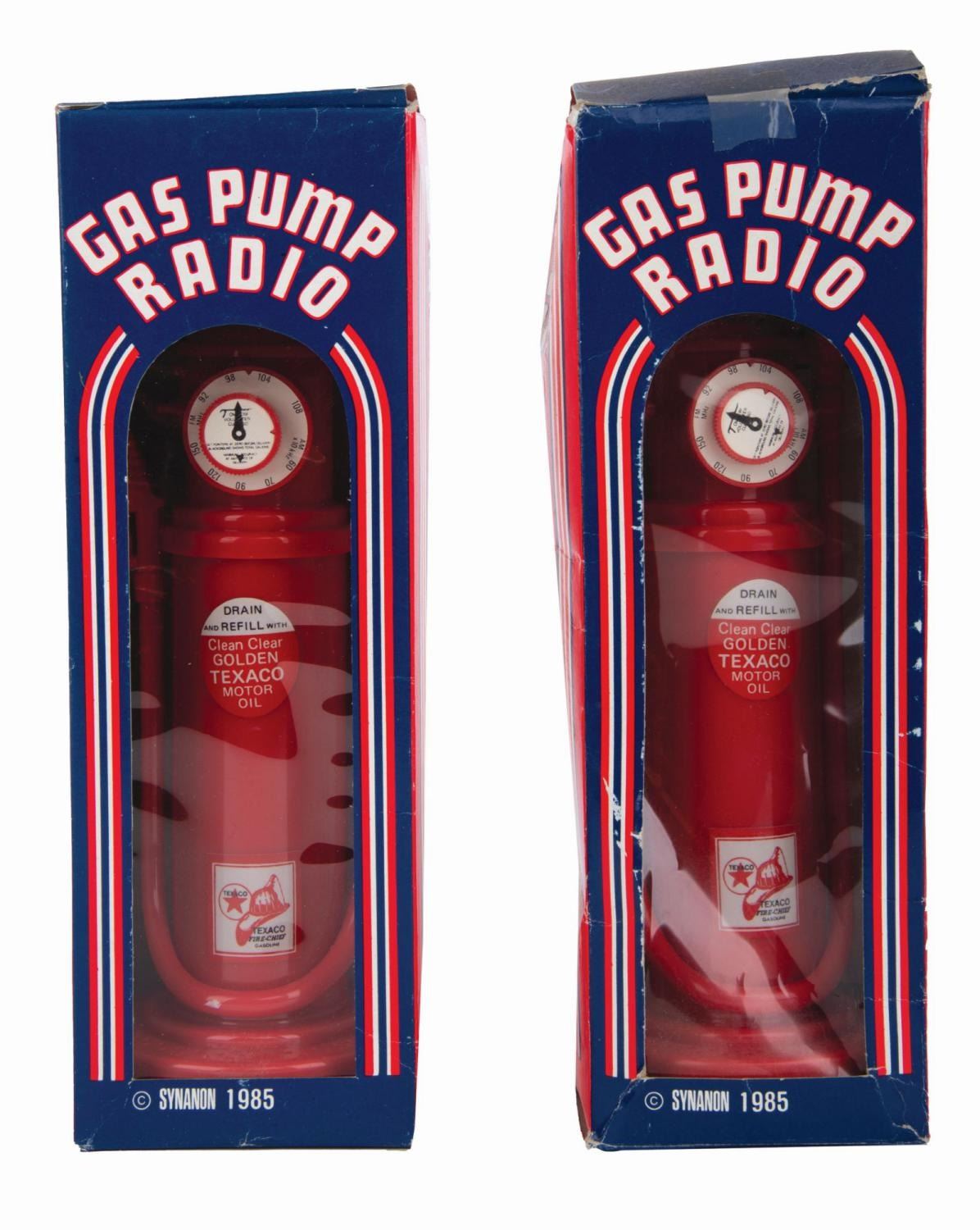 (Synanon, 1985) Two AM/FM radios in the shape of antique Texaco gas pumps, with the original boxes. Requiring two "AA" batteries (not included), both functioned when tested. Each measuring 8" tall, the radios are in fine condition.