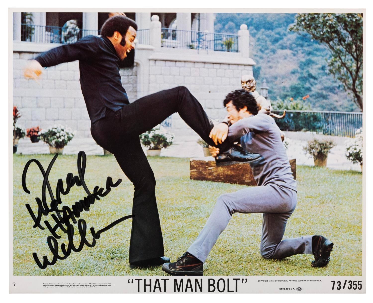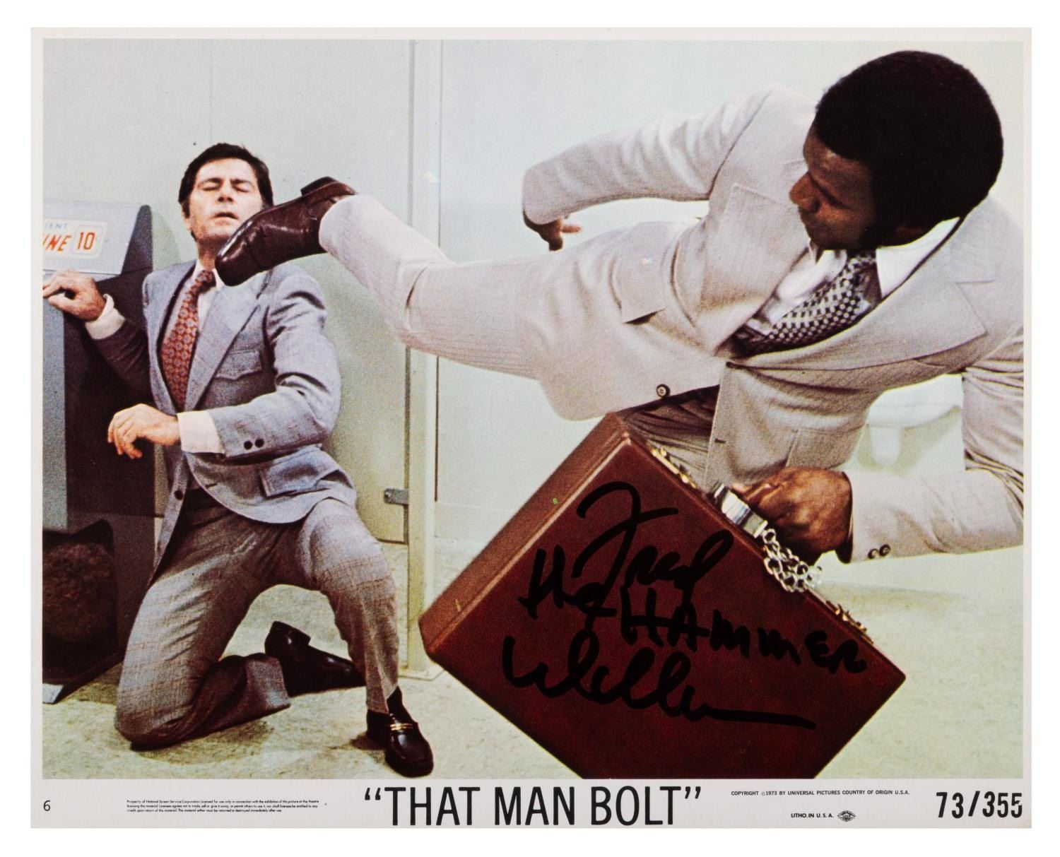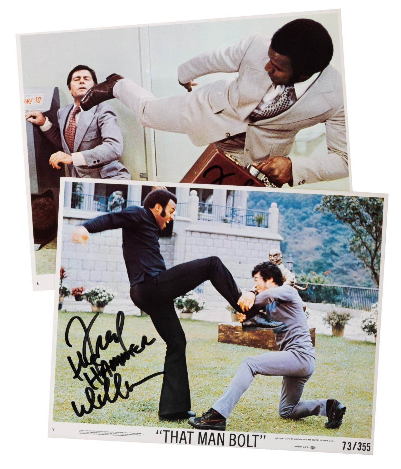 (Universal, 1973) Two lobby cards for "That Man Bolt" signed by the film’s star, Fred "Hammer" Williamson. Each measuring 8" x 10", the signed cards are in very good condition with very light handling wear.